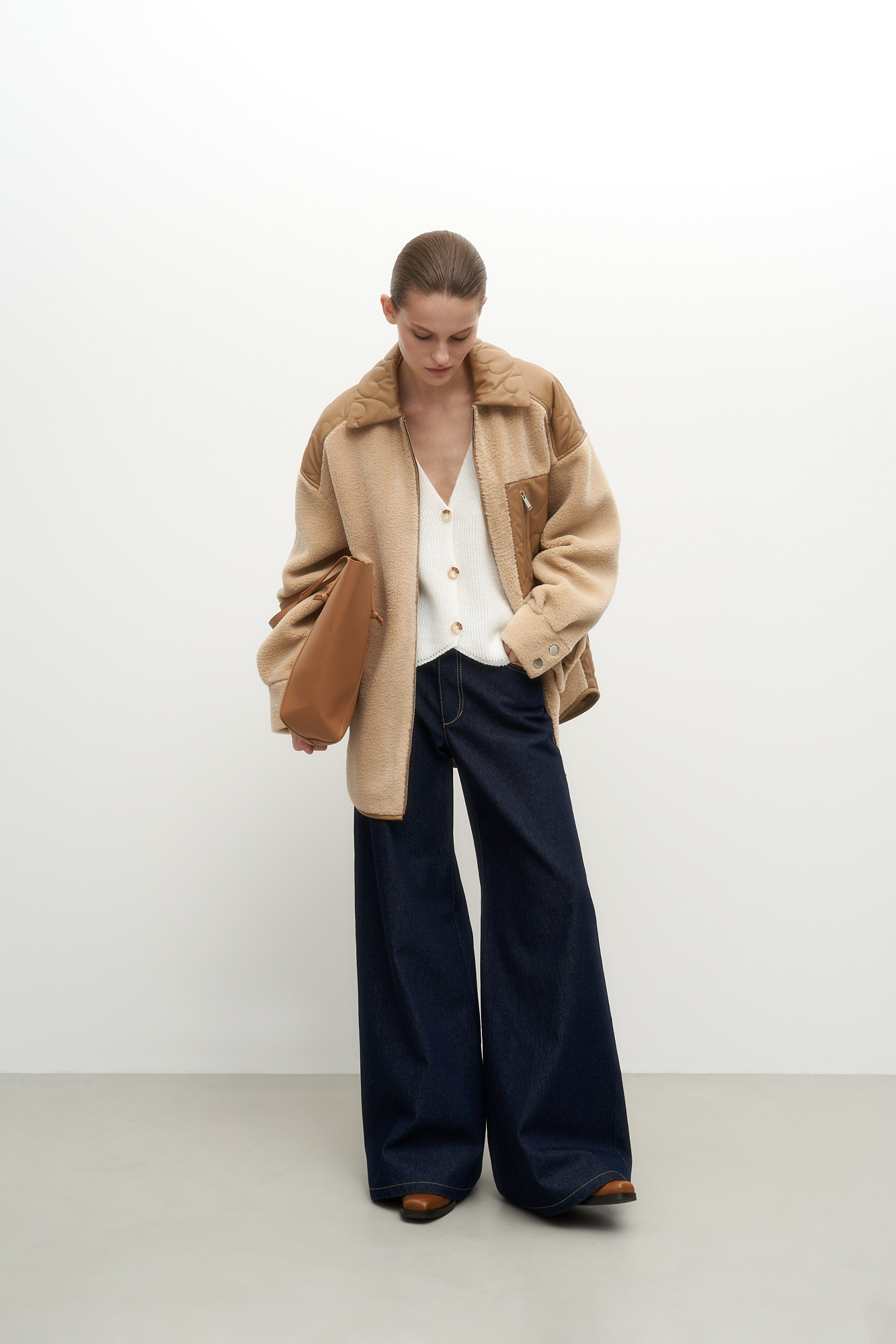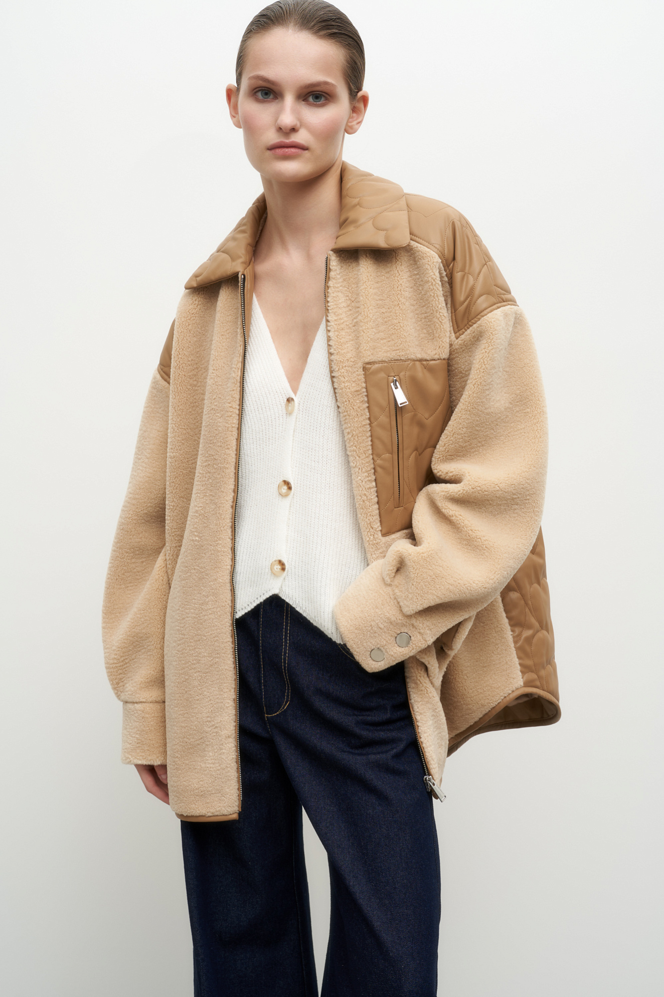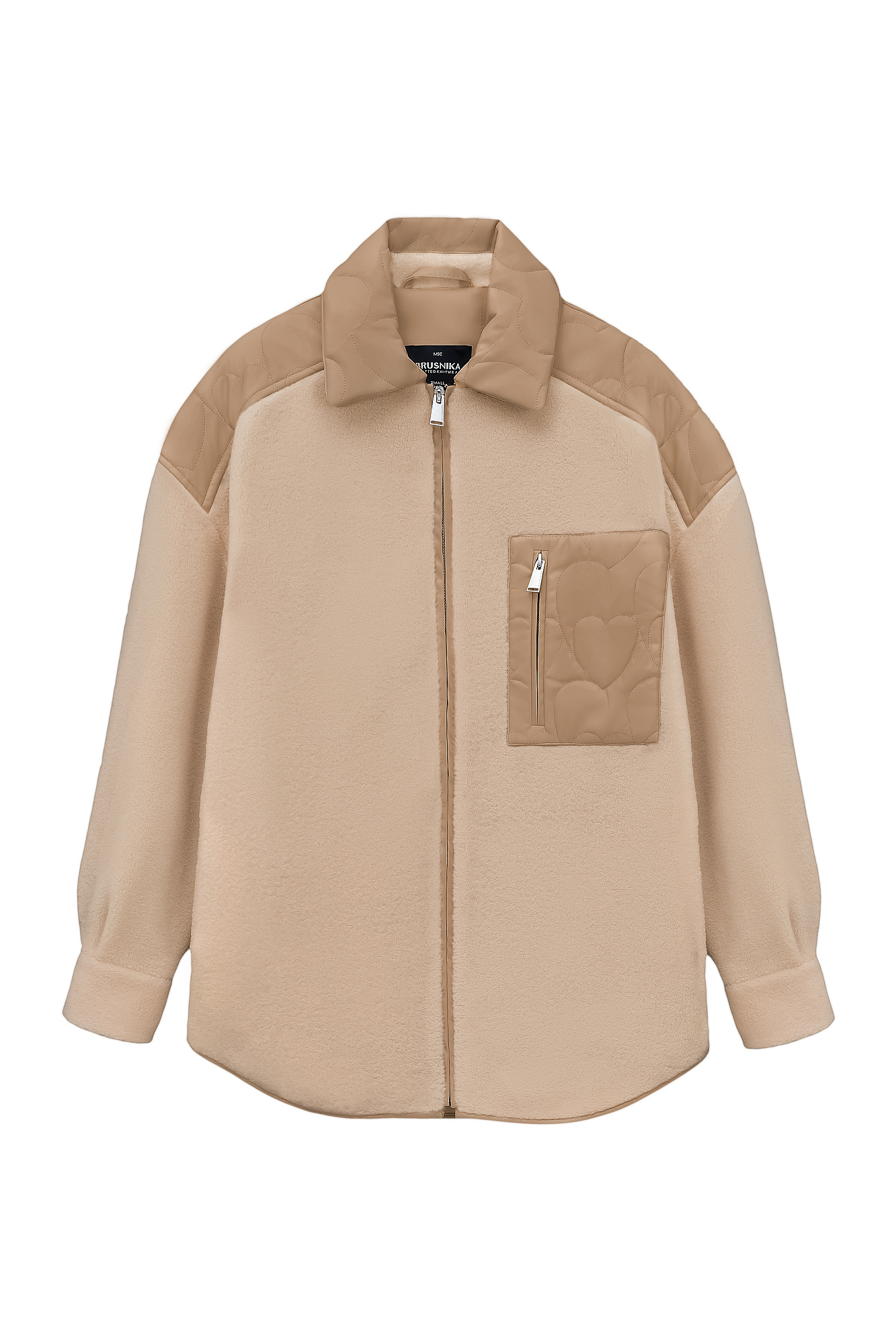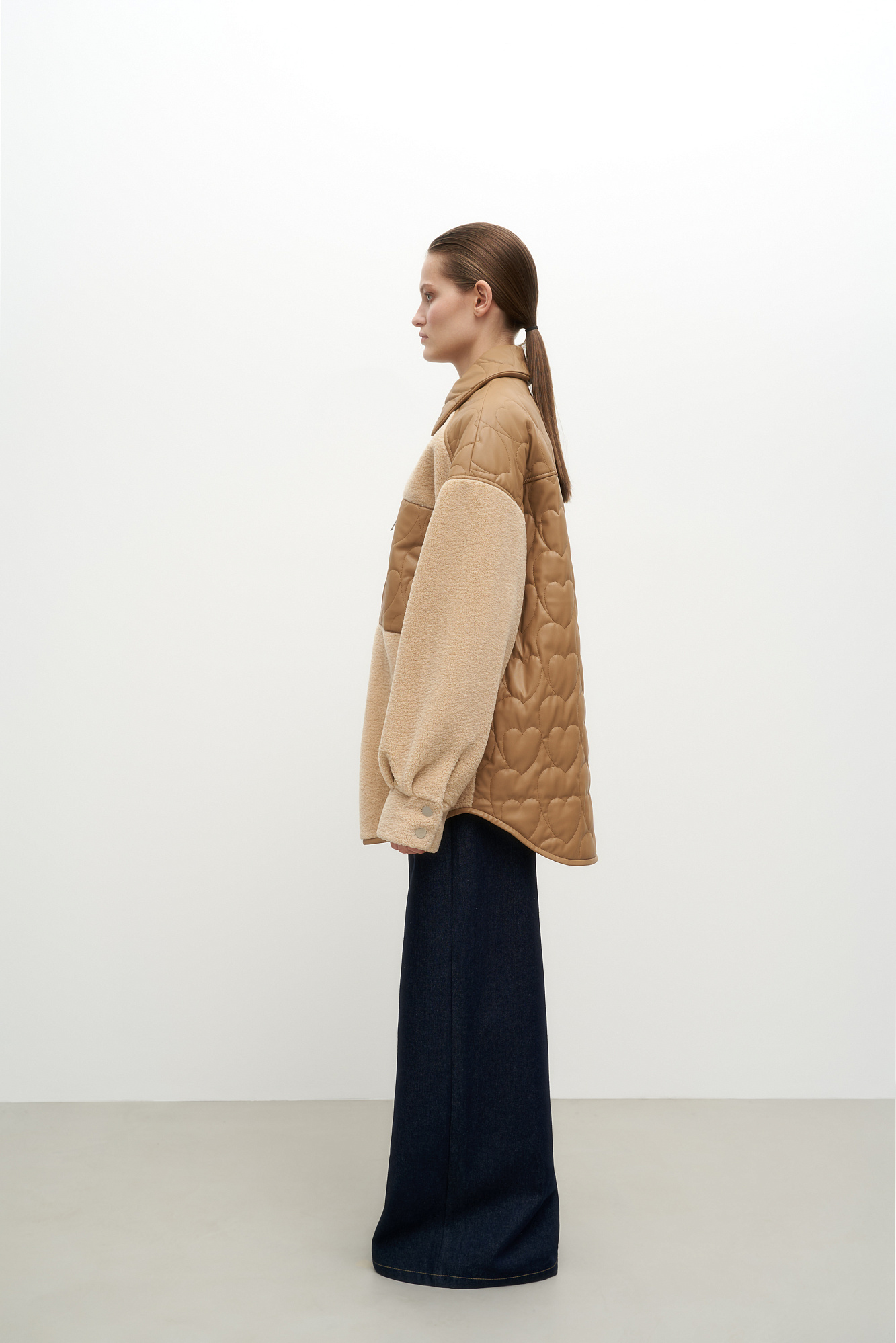 Утепленный бомбер из экомеха со спущеным плечом. Модель свободного силуэта с накладным карманом, отложным воротником и стежкой в виде сердец. На подкладке.