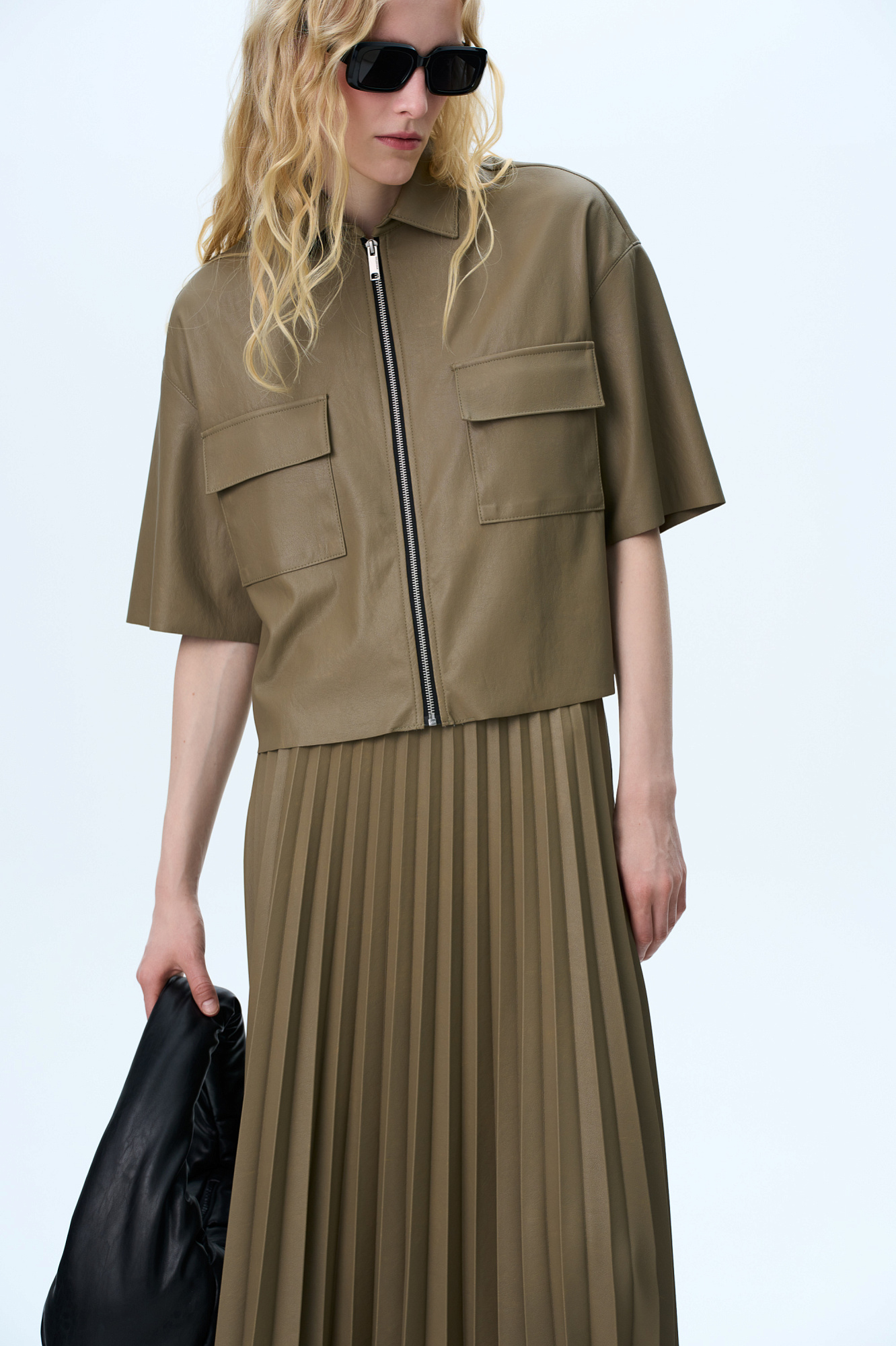 Укороченная рубашка из экокожи. Модель свободного силуэта со спущенной линией плеча, накладными карманами на груди и застежкой на молнию.