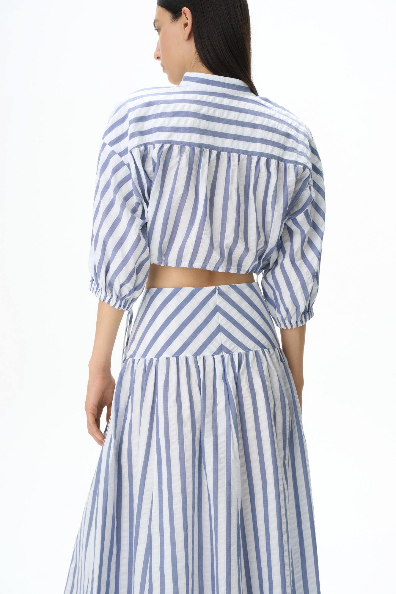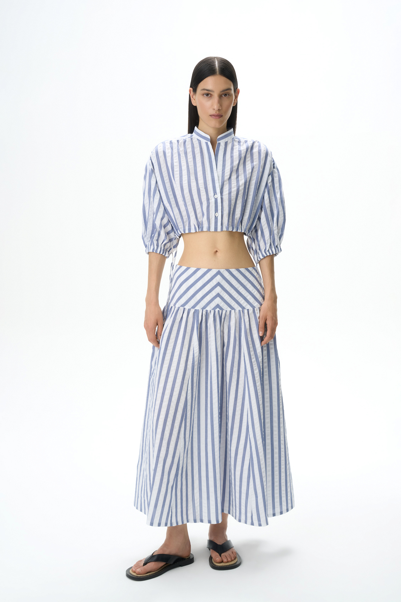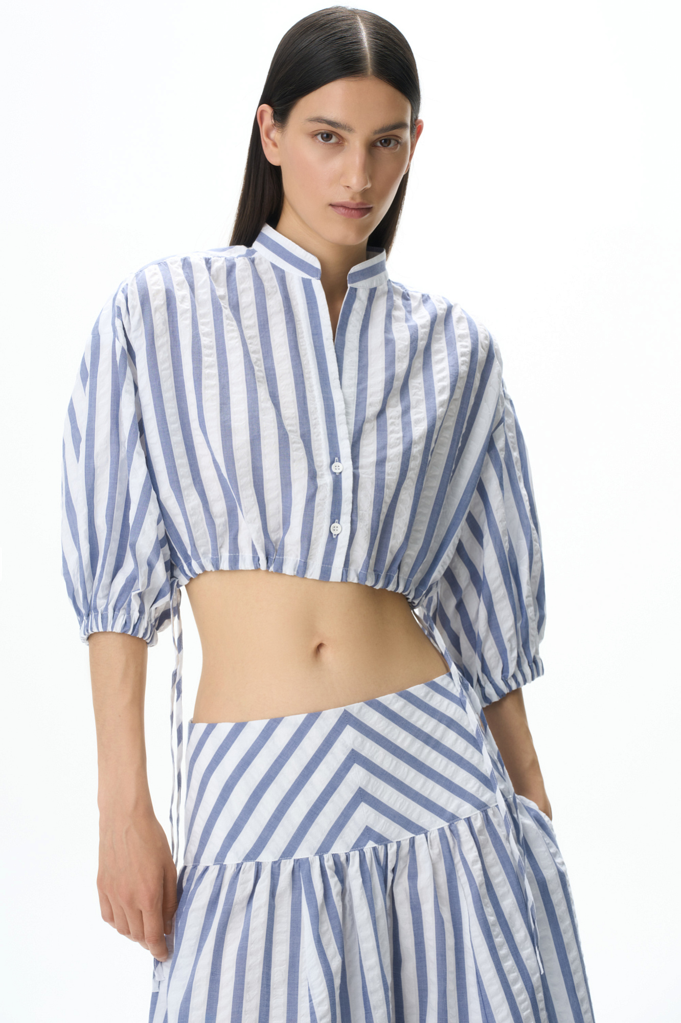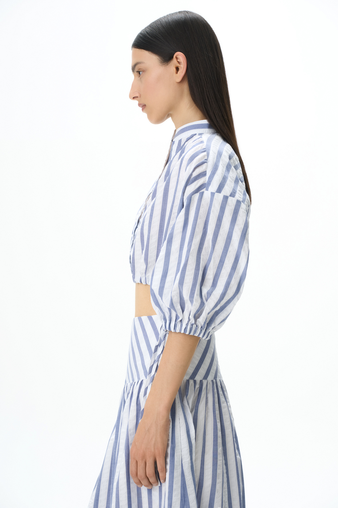 Укороченная рубашка с короткими рукавами на резинке, застежкой на пуговицы и кулиской по низу. Дополнить образ можно юбкой в таком же стиле.