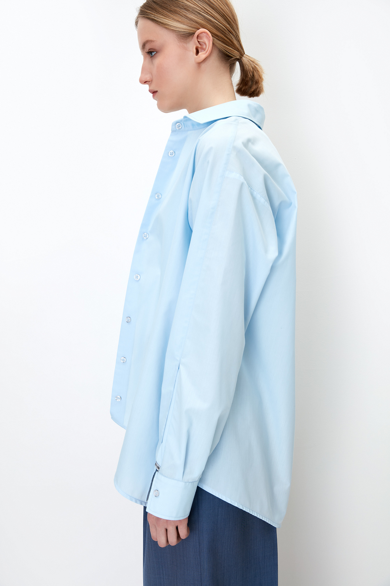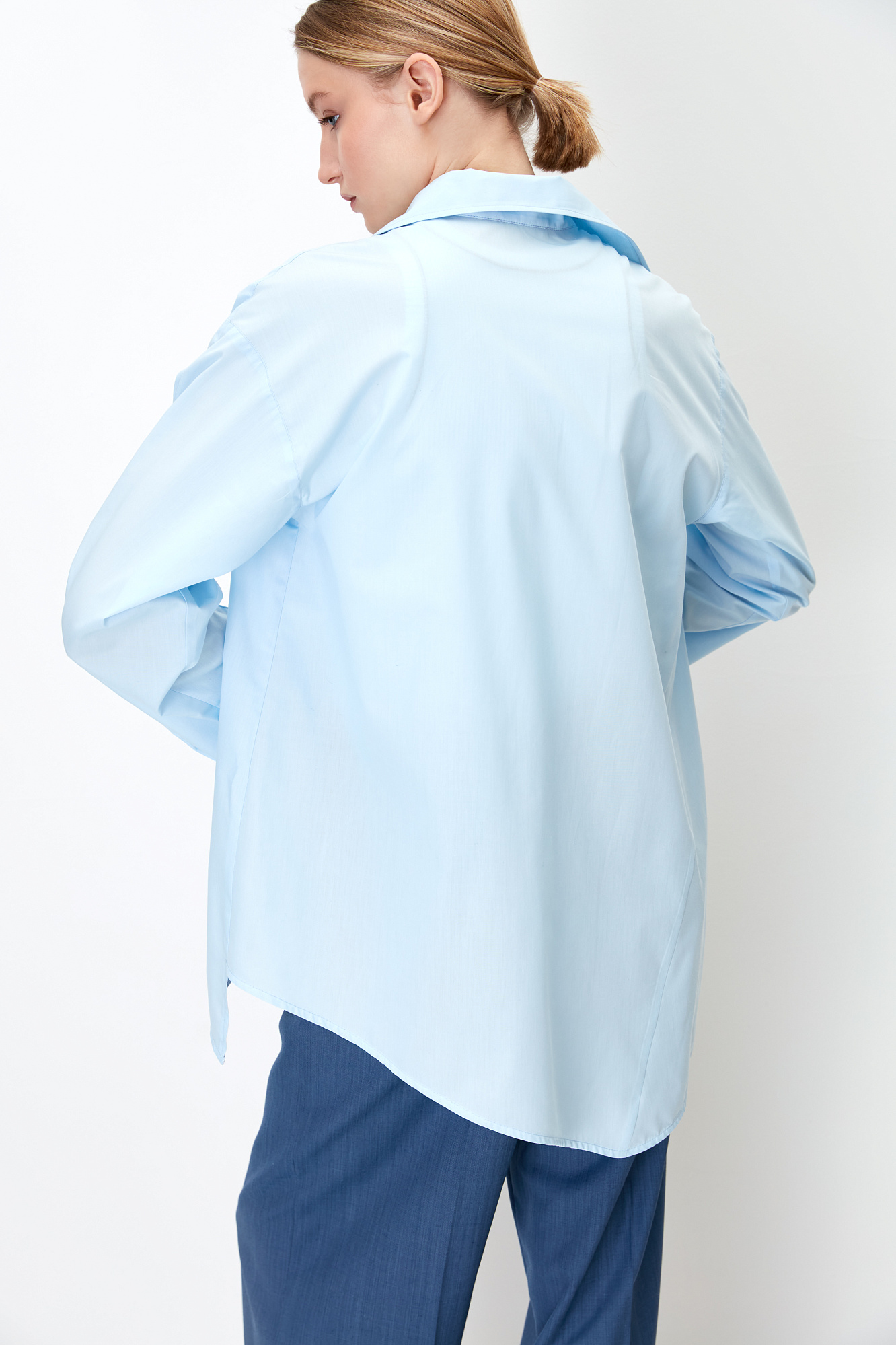 Рубашка на пуговицах с расклешенными рукавами, регулируемым манжетом и асимметричным краем.