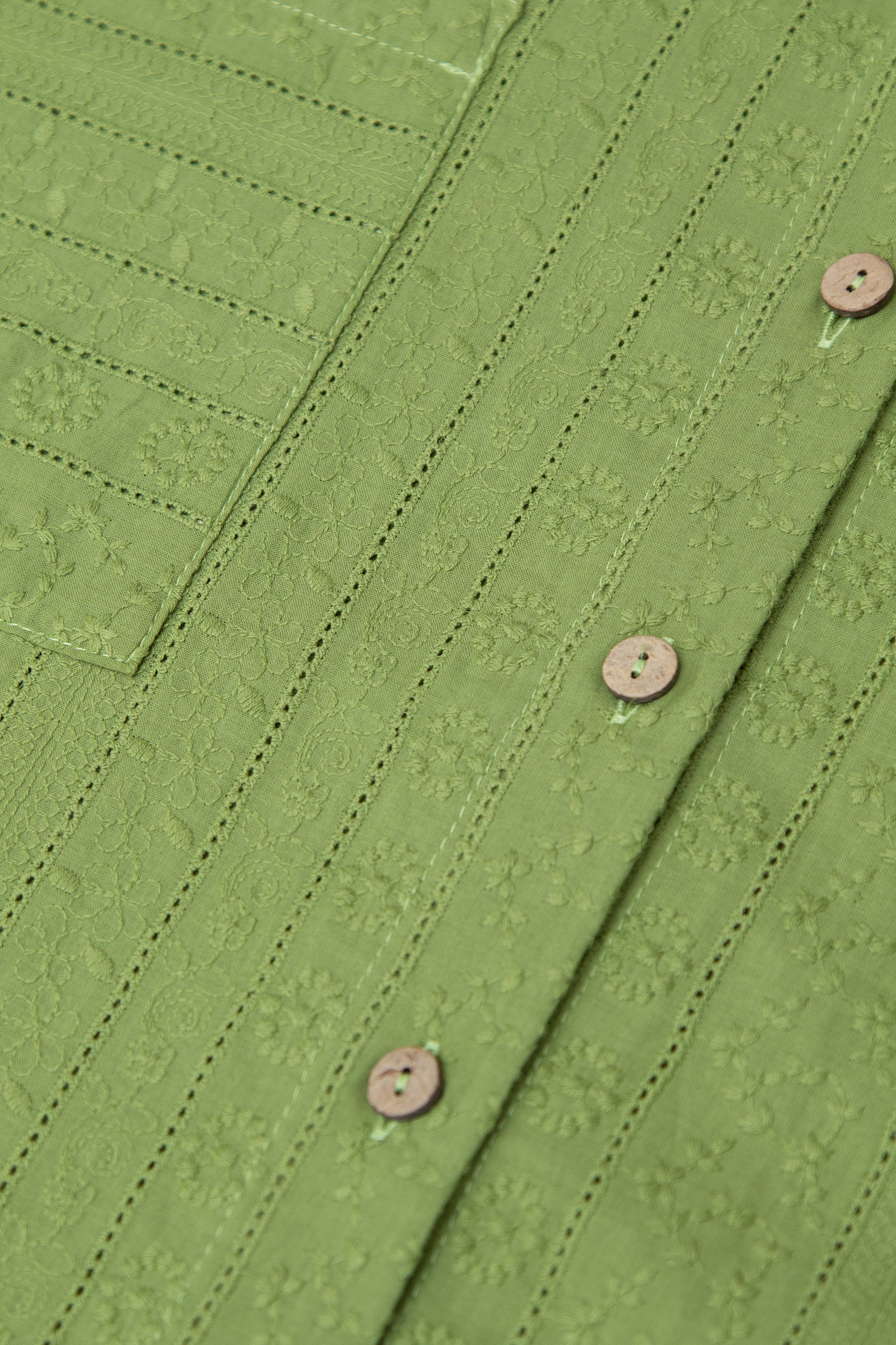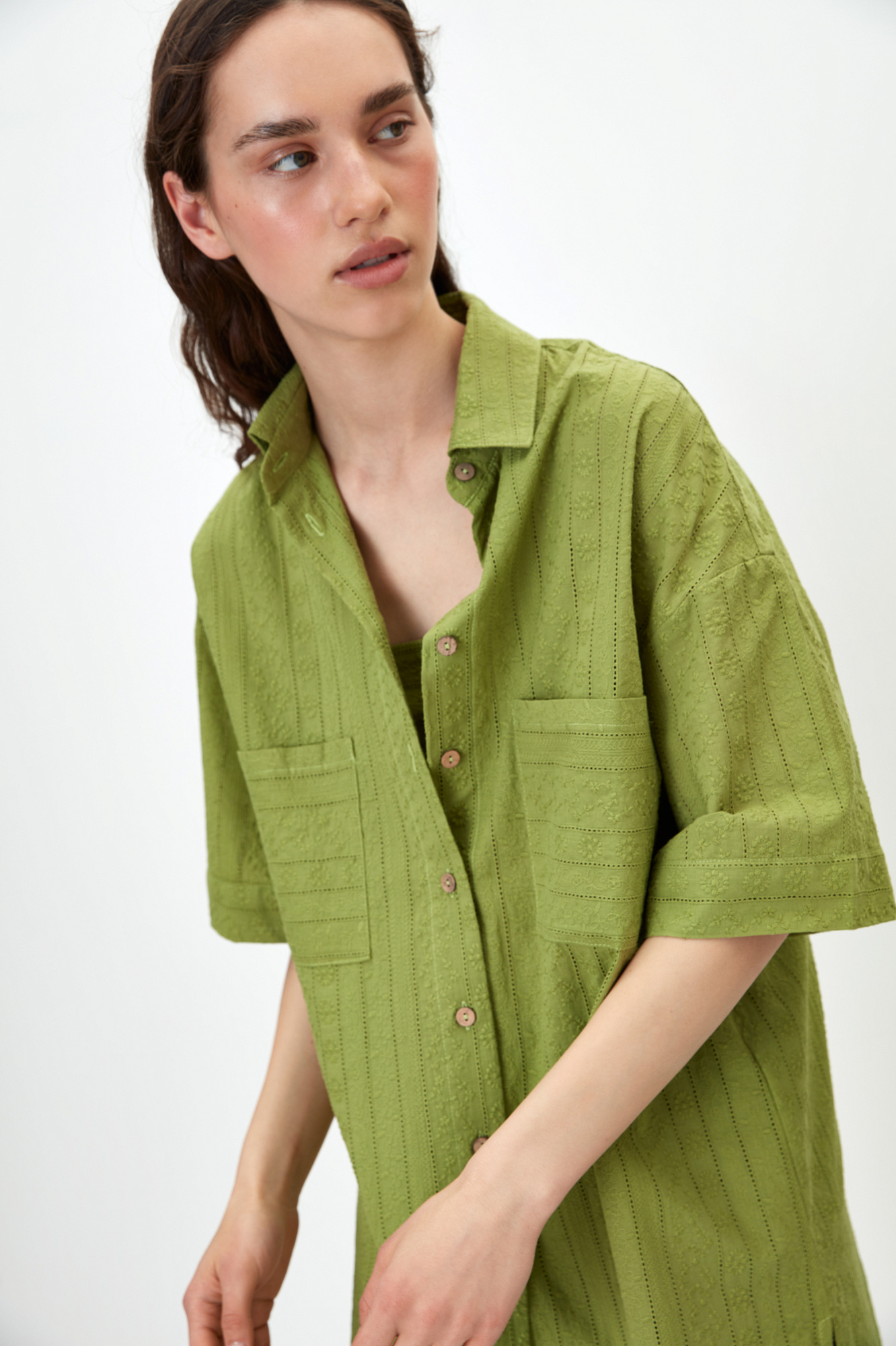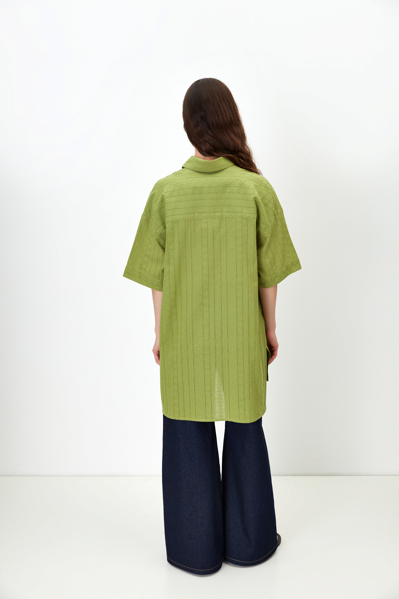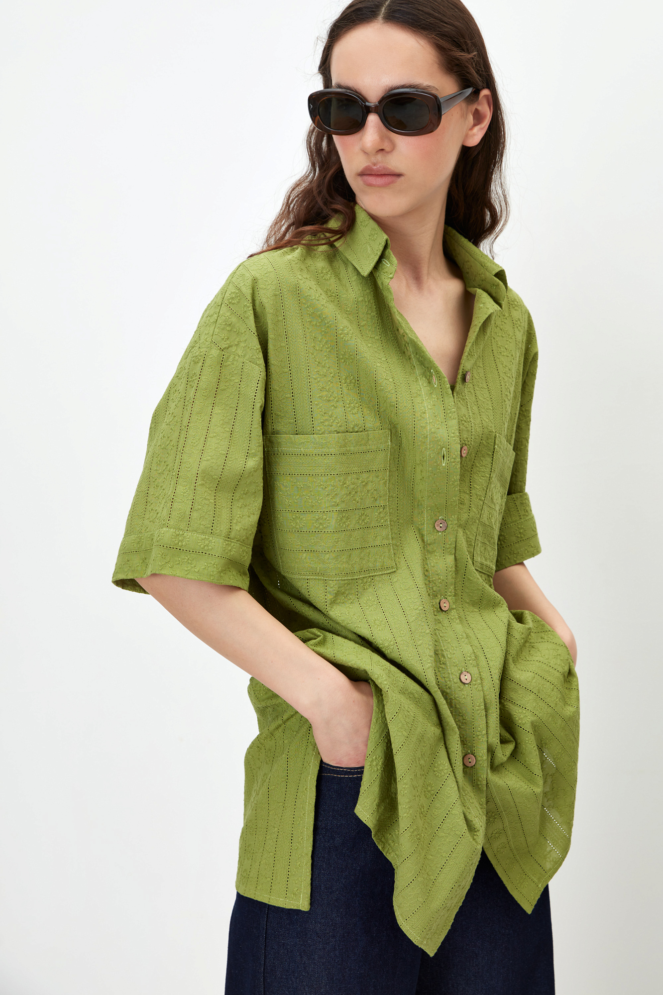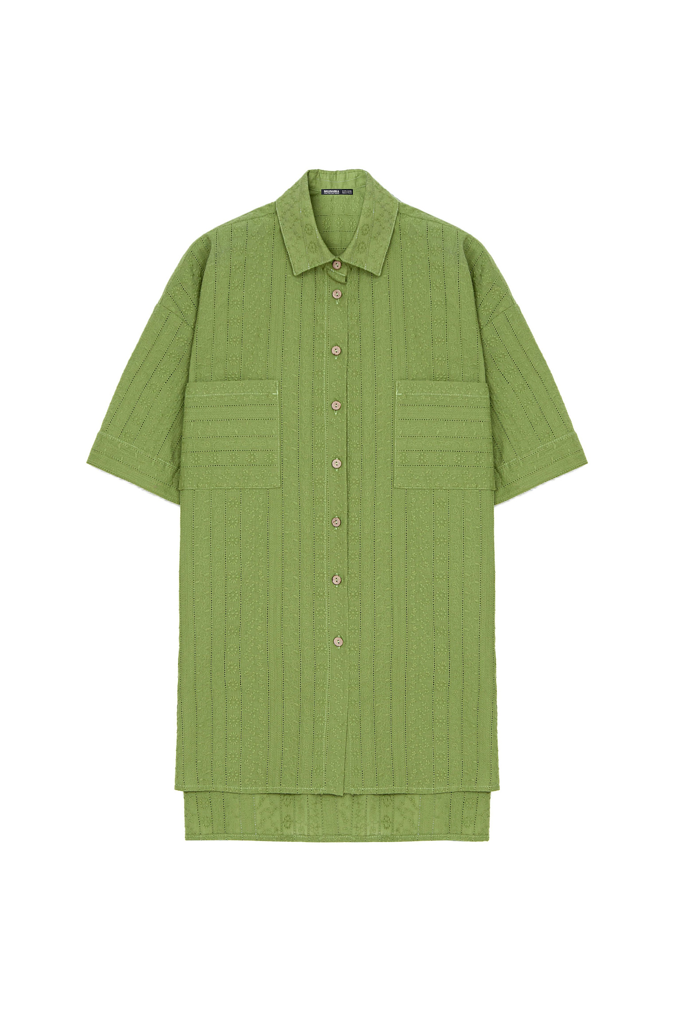 Рубашка из 100% хлопка. Модель прямого кроя, с отложным воротником и короткими рукавами. Застёгивается на пуговицы по всей длине. На груди расположены два накладных кармана. Ткань имеет текстурированную поверхность с вертикальными полосами и вышитым узором.