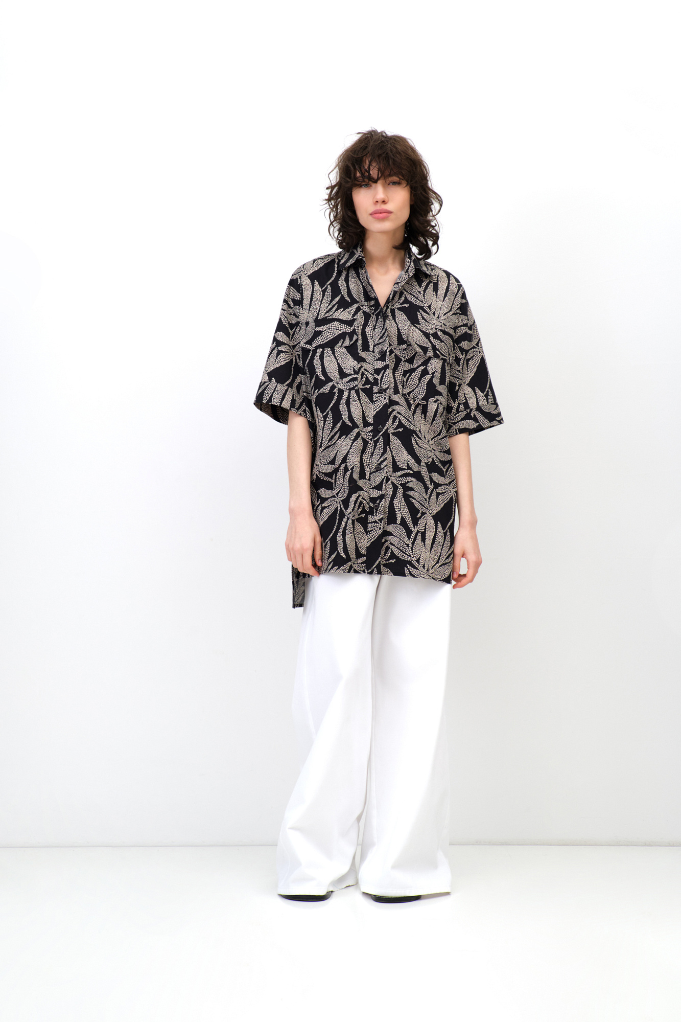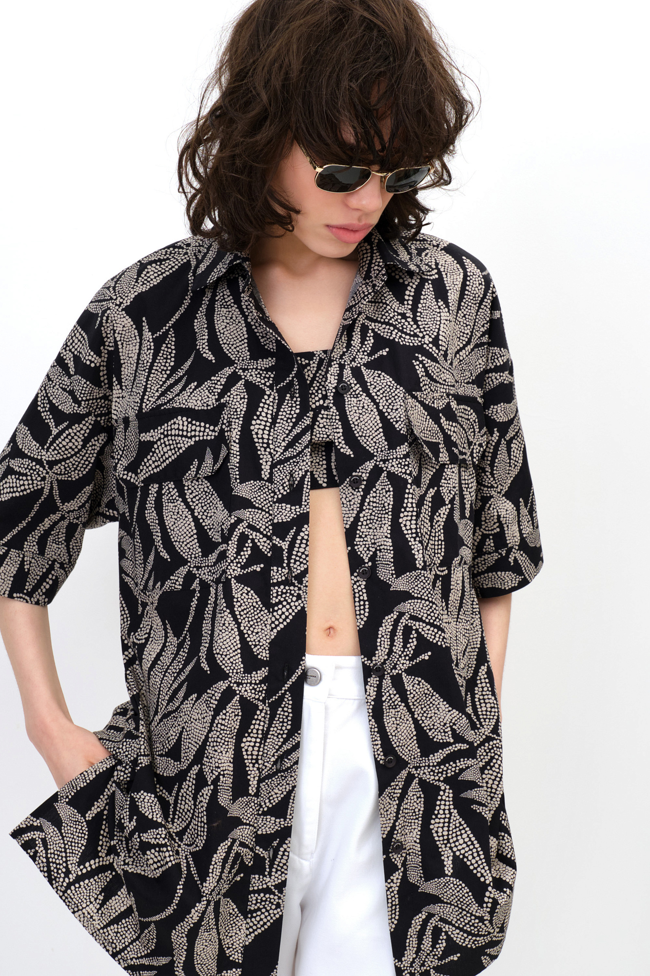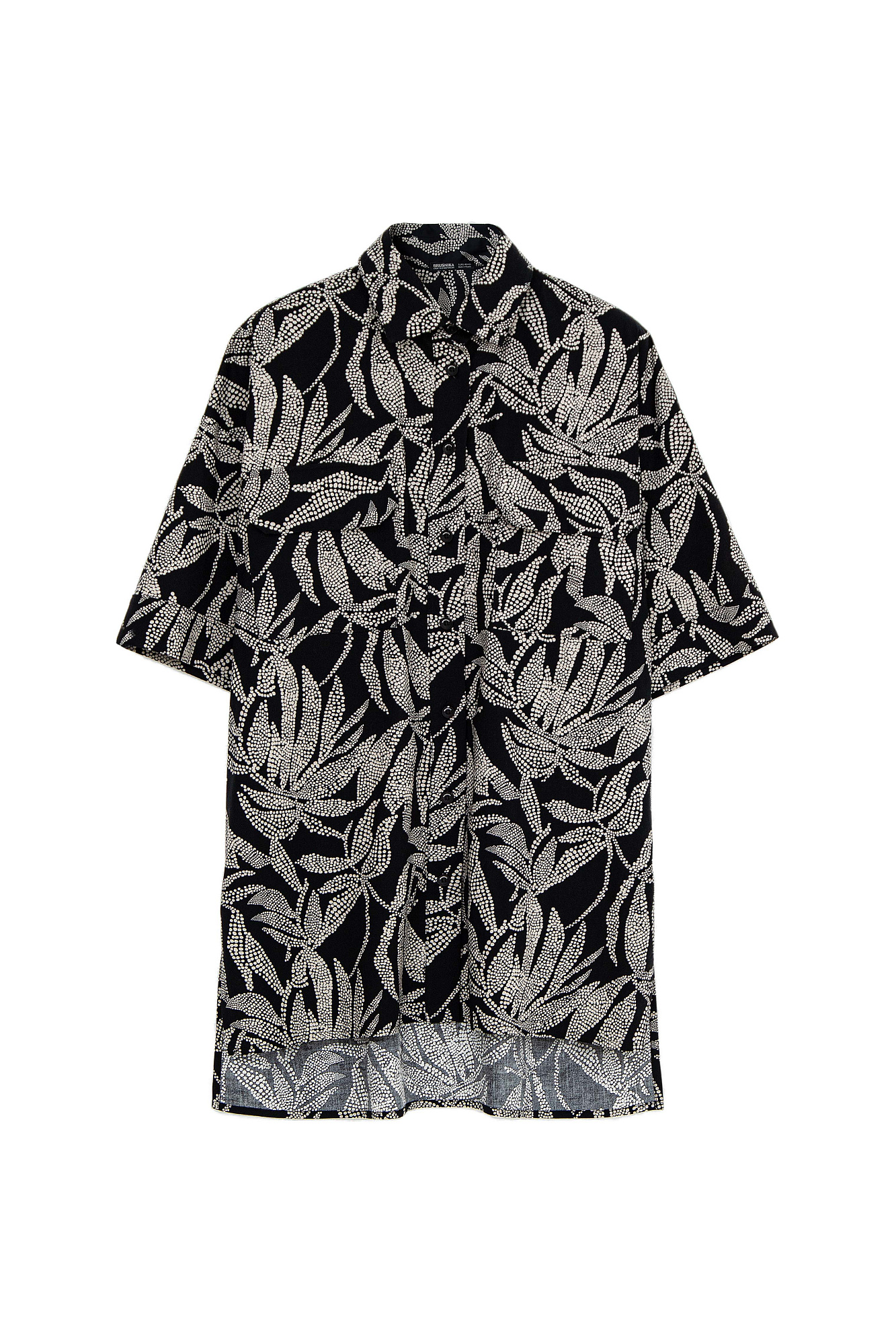 Принтованная рубашка из 100% хлопка с накладными карманами на груди и удлиненной спинкой. Дополнить образ можно шортами и топом в таком же стиле.