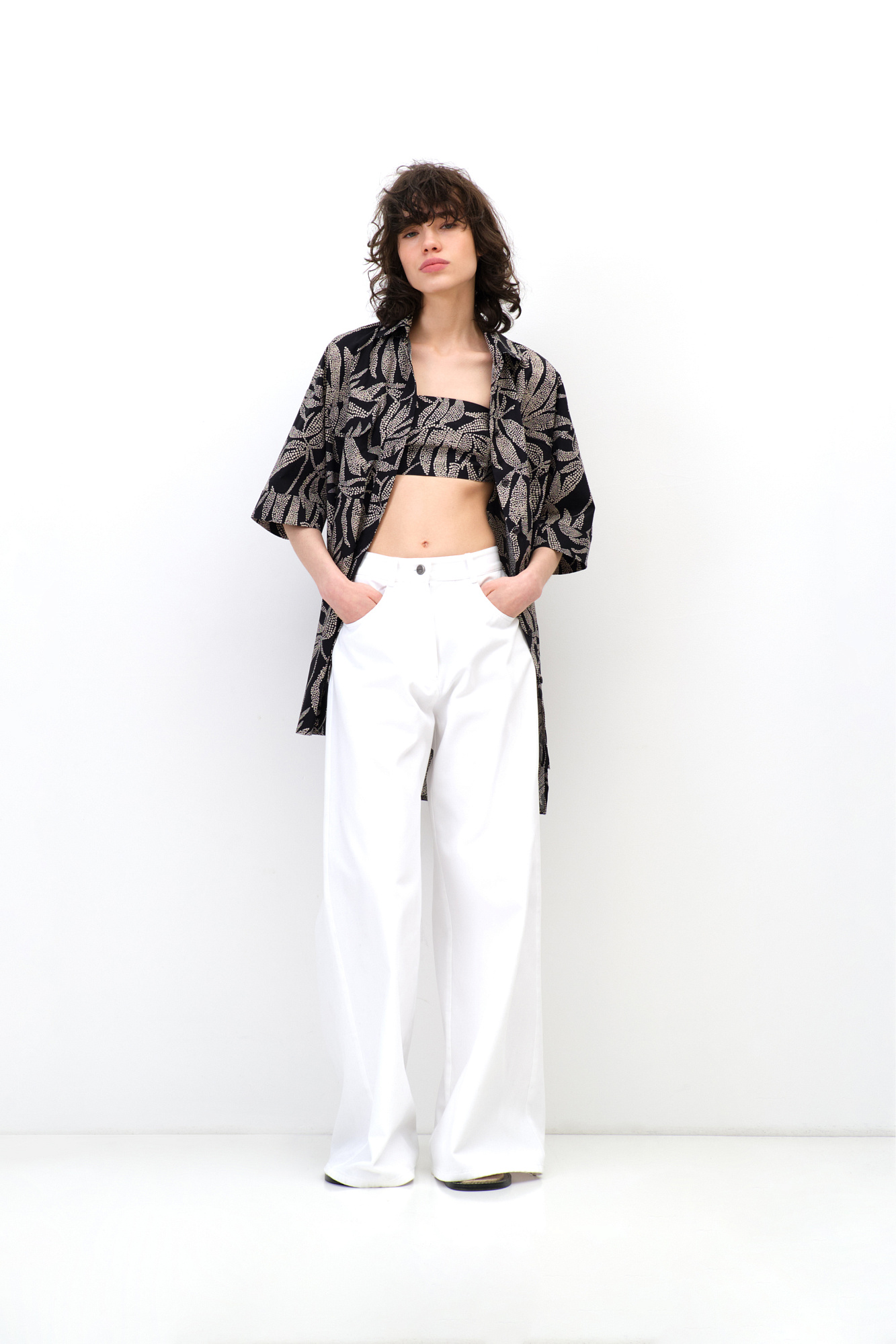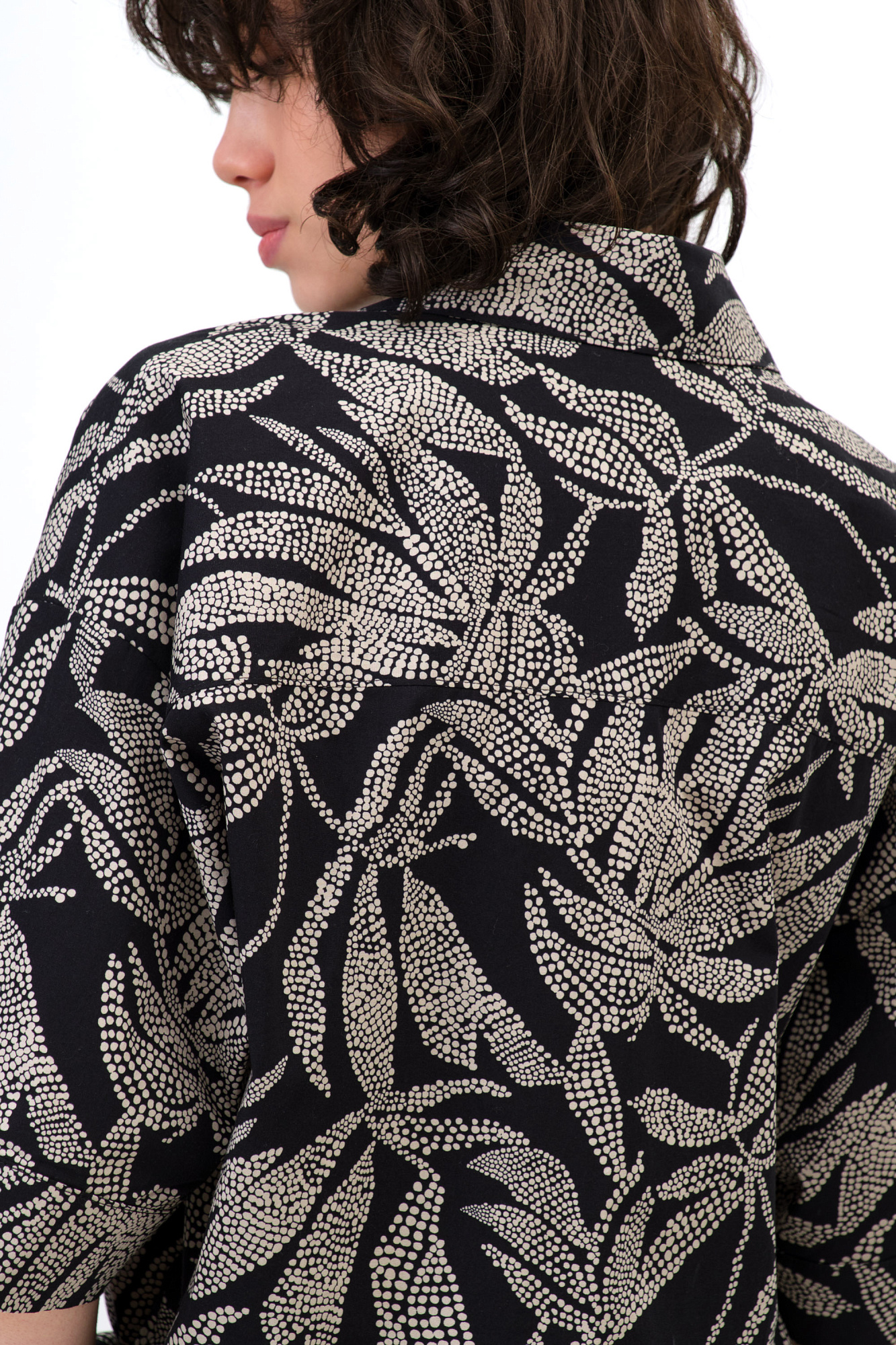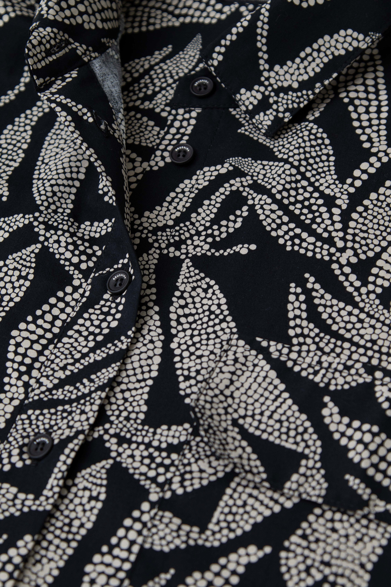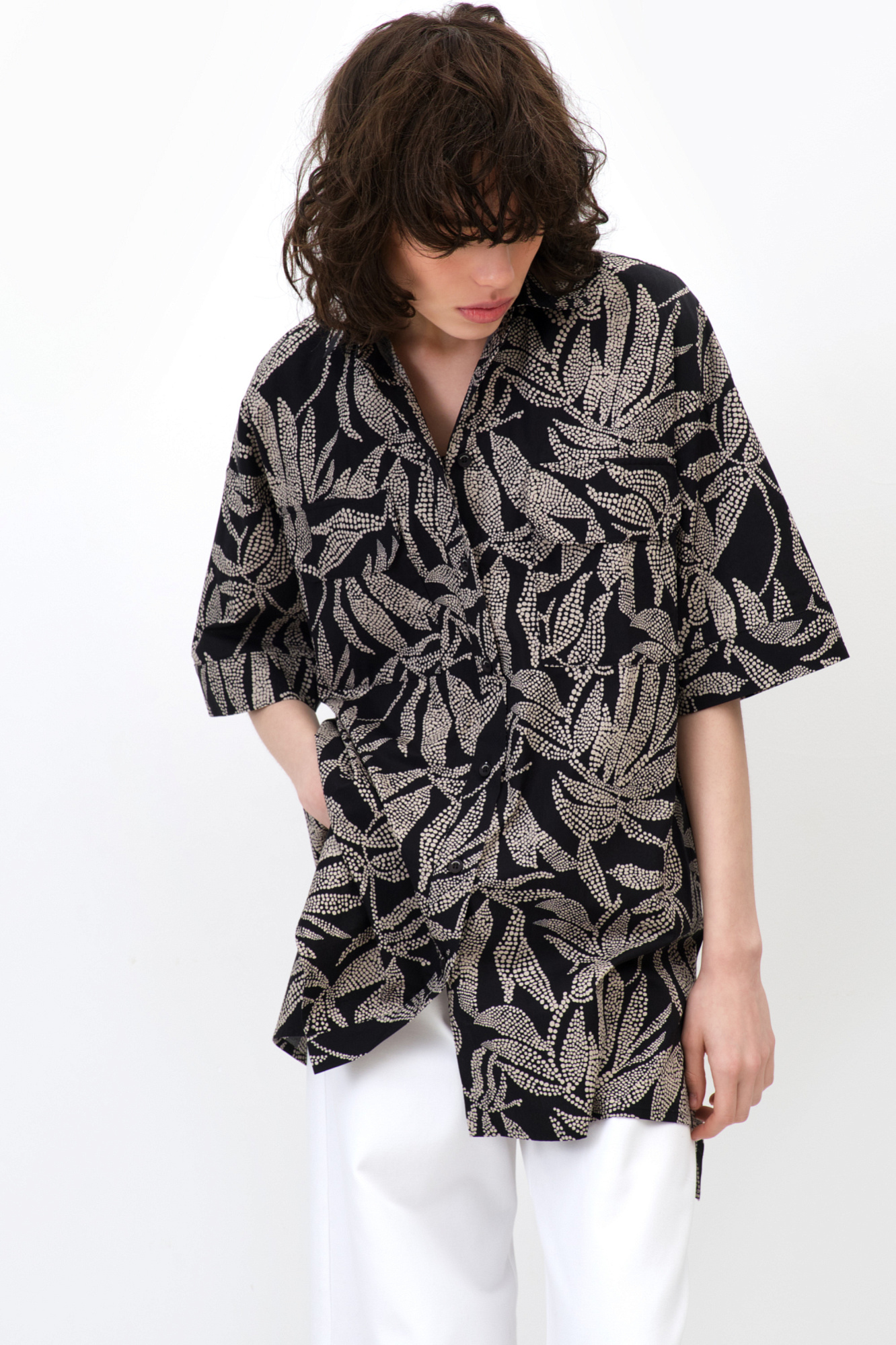 Принтованная рубашка из 100% хлопка с накладными карманами на груди и удлиненной спинкой. Дополнить образ можно шортами и топом в таком же стиле.