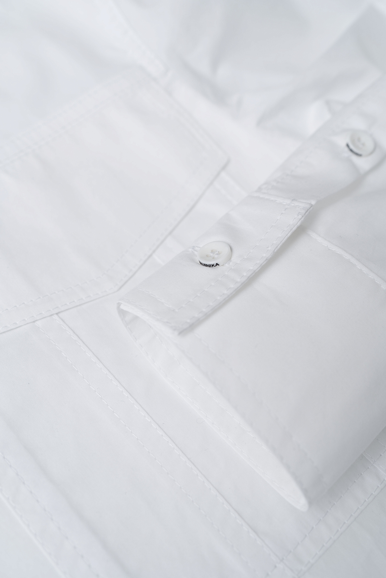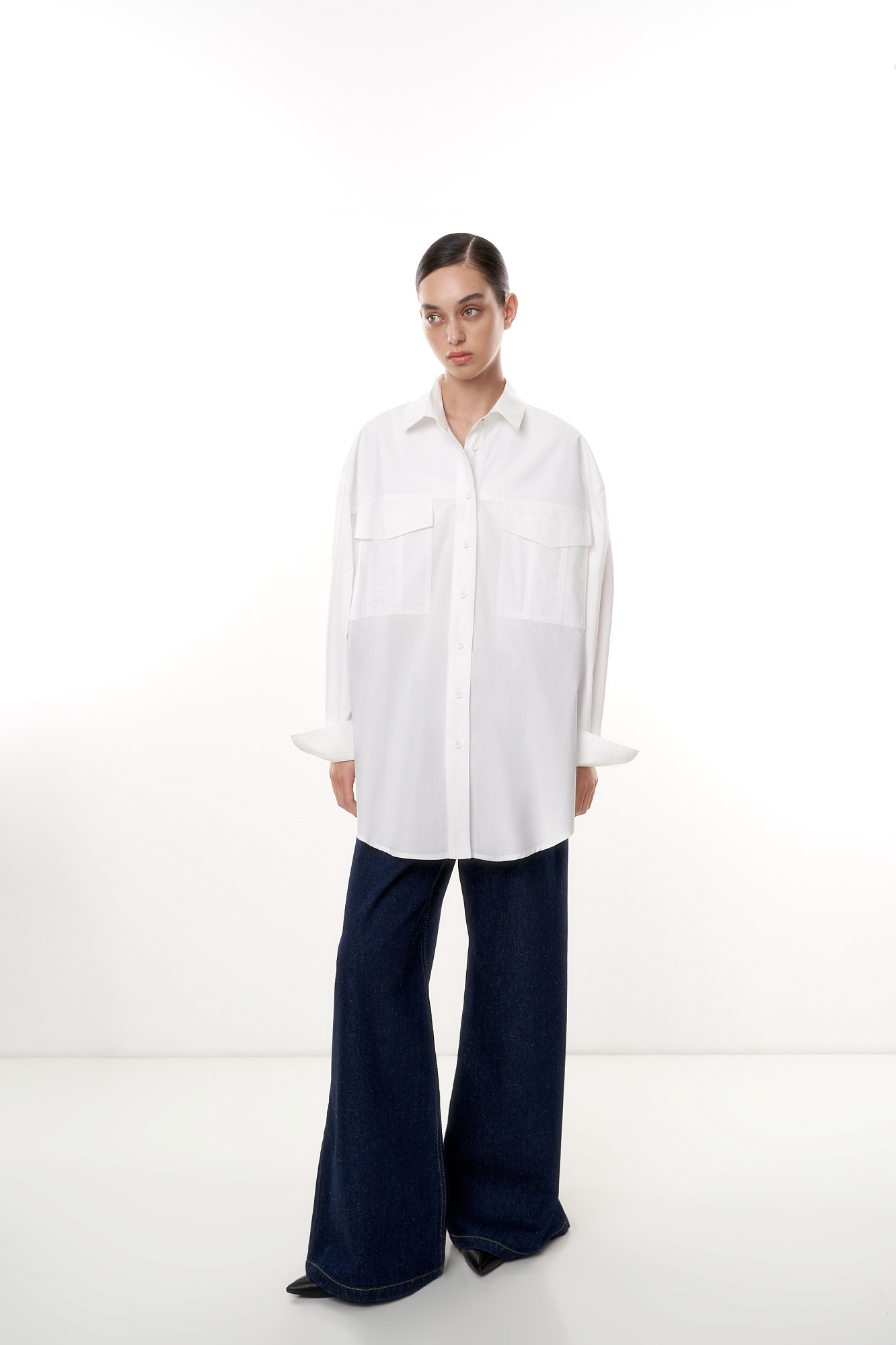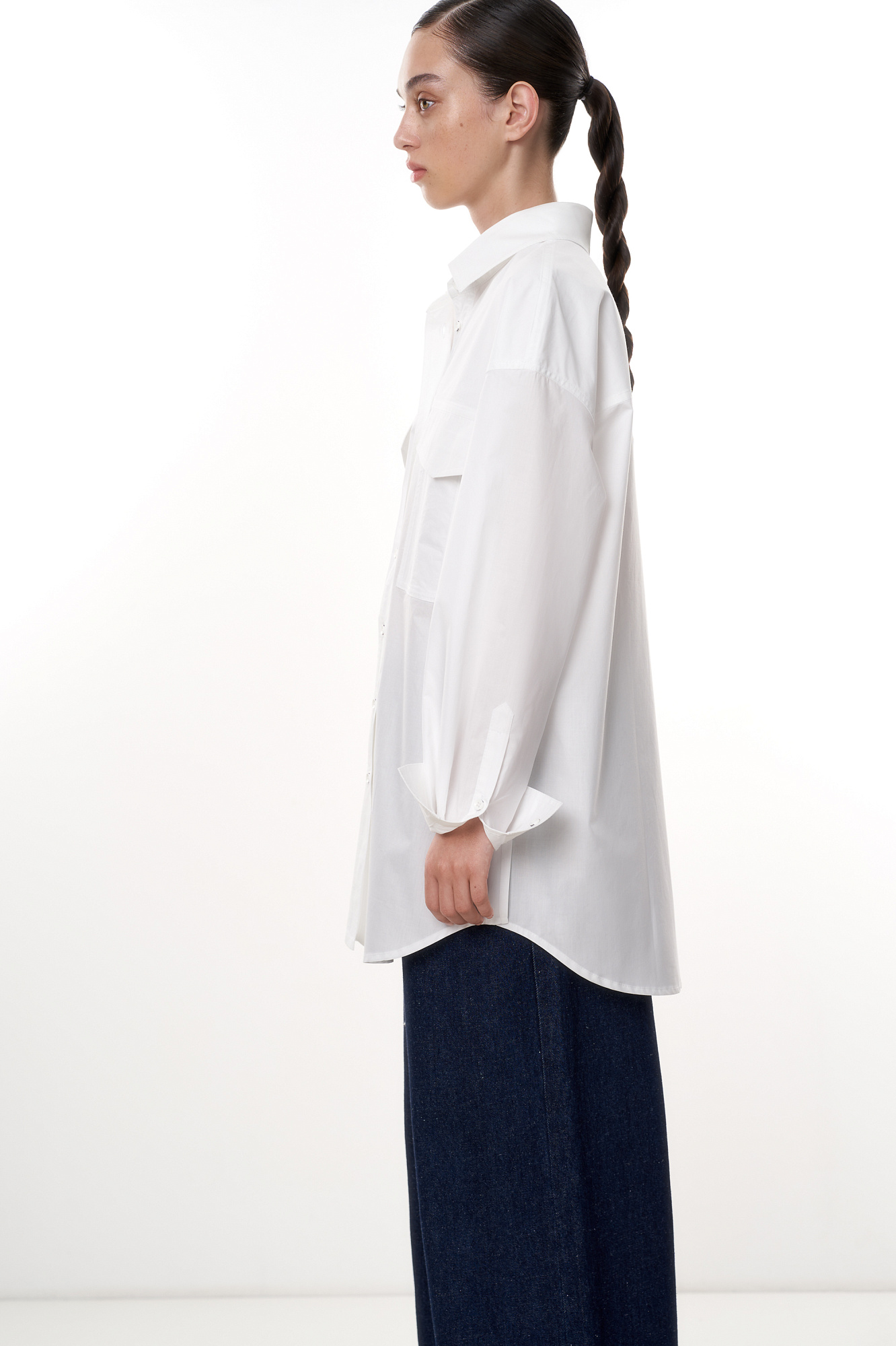 Классическая рубашка из 100% хлопка со спущенным рукавом и накладными карманами. Модель прямого силуэта с застежкой на пуговицы.