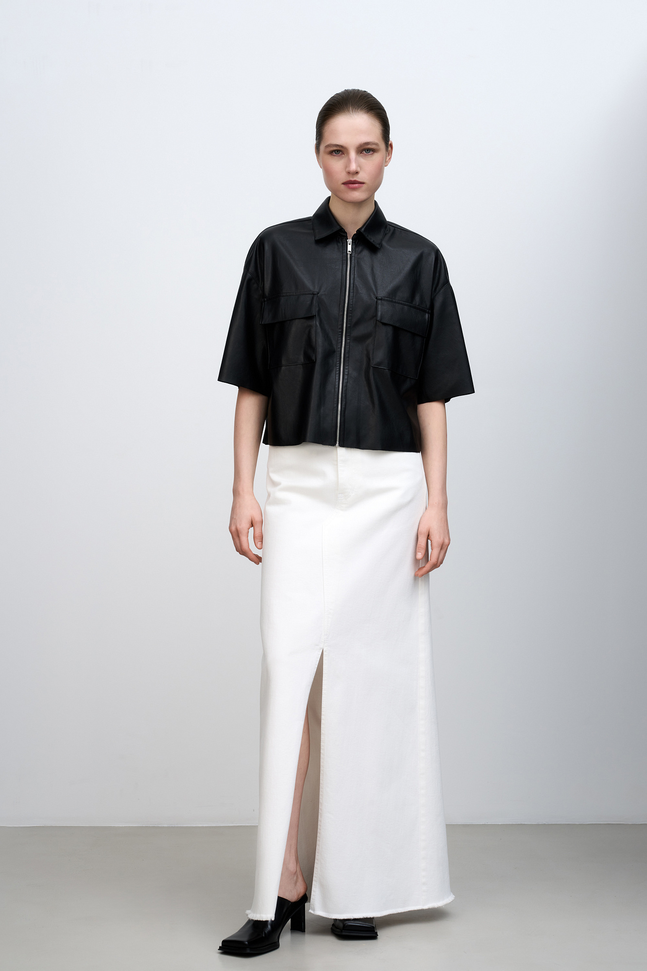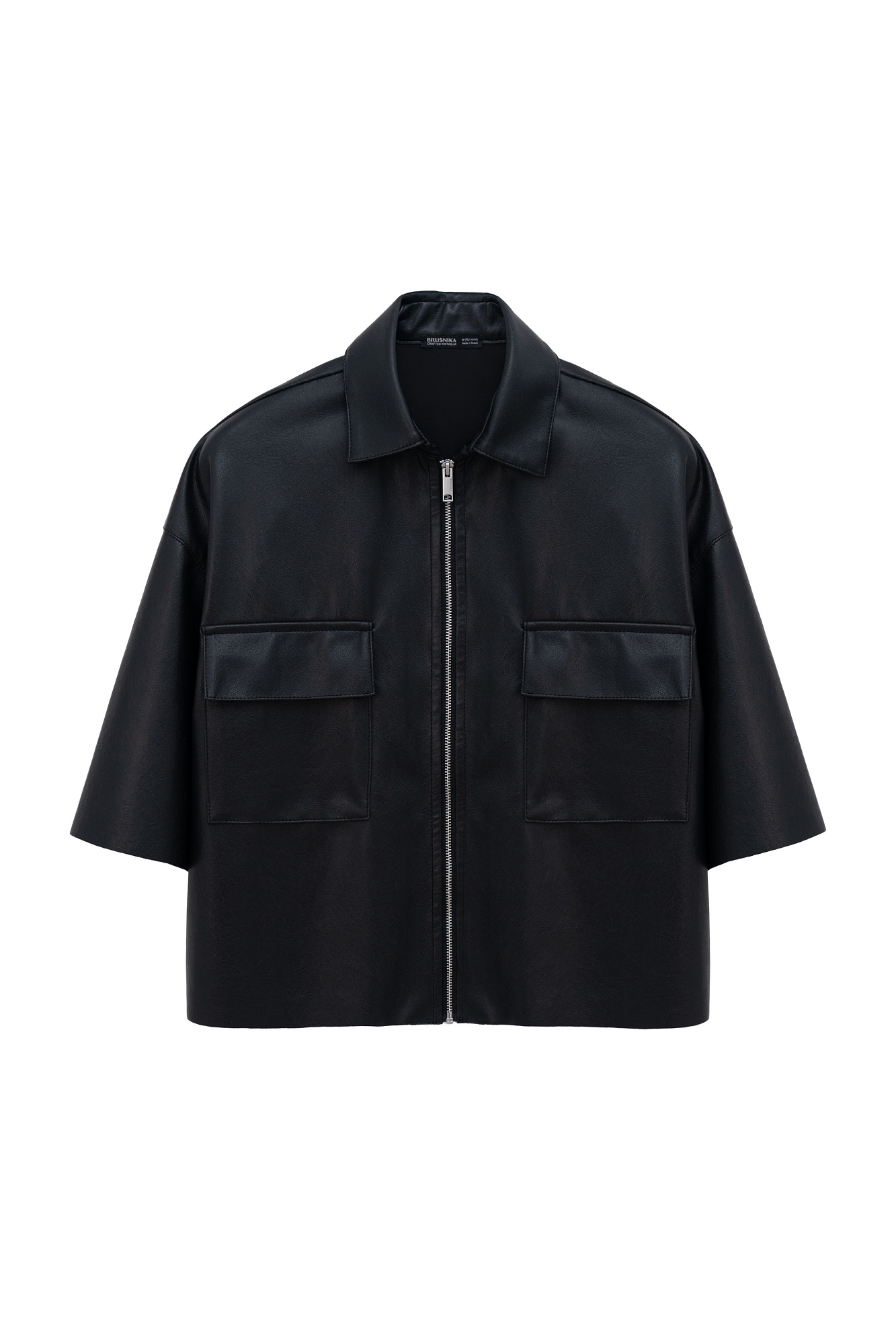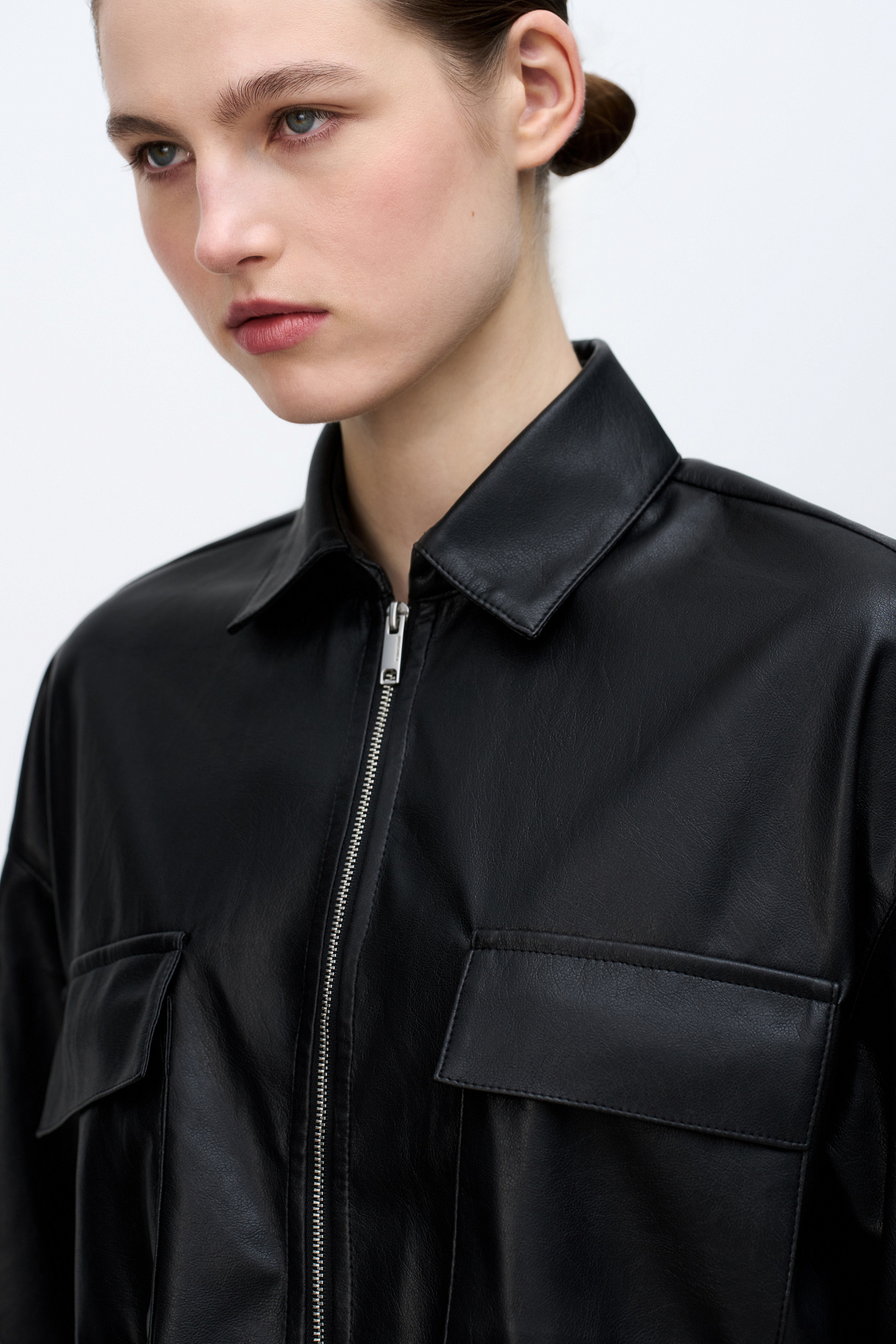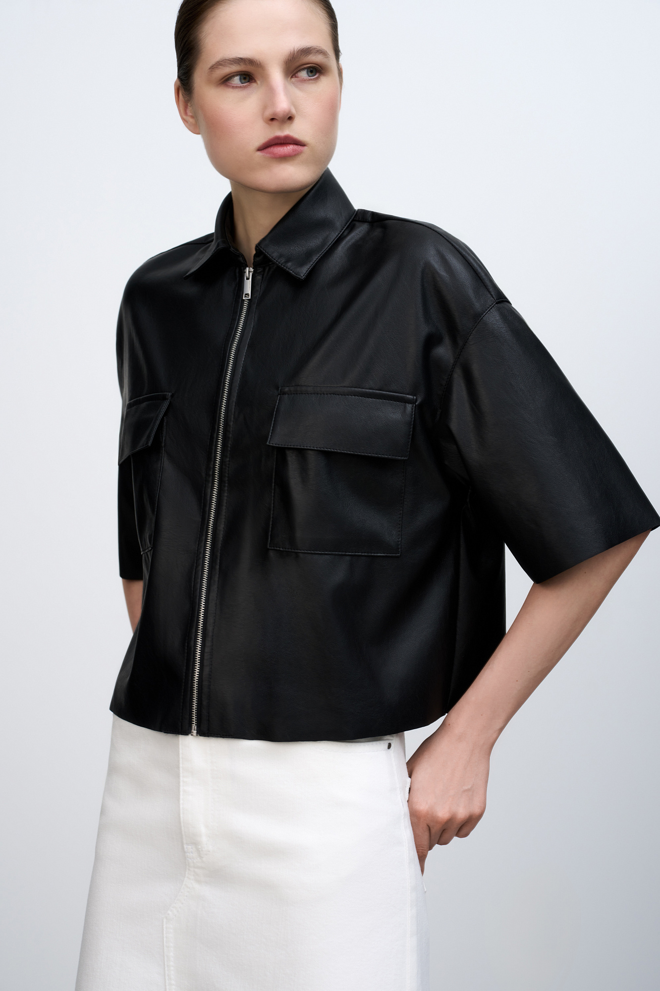 Укороченная рубашка из экокожи. Модель свободного силуэта со спущенной линией плеча, накладными карманами на груди и застежкой на молнию.
