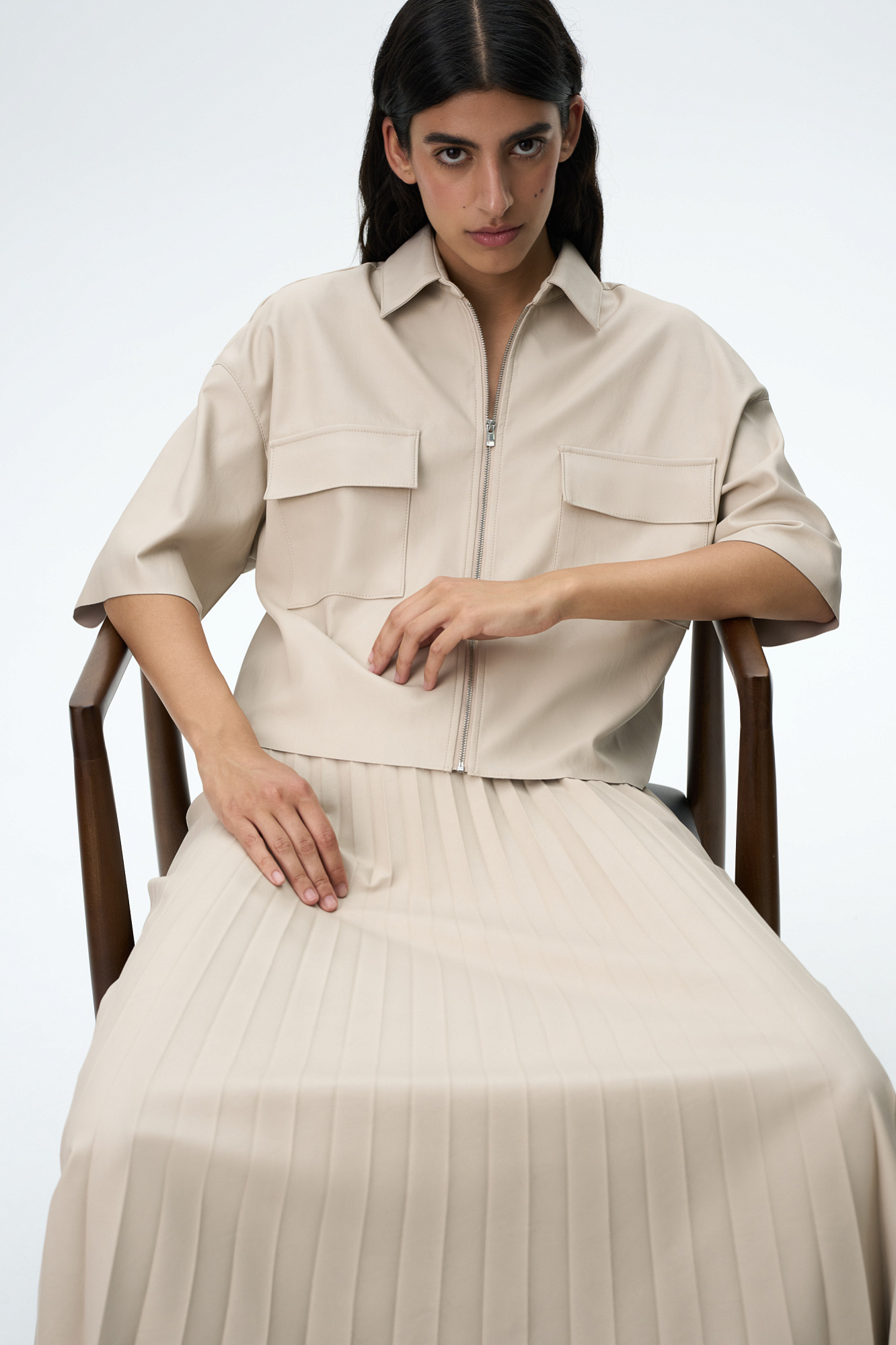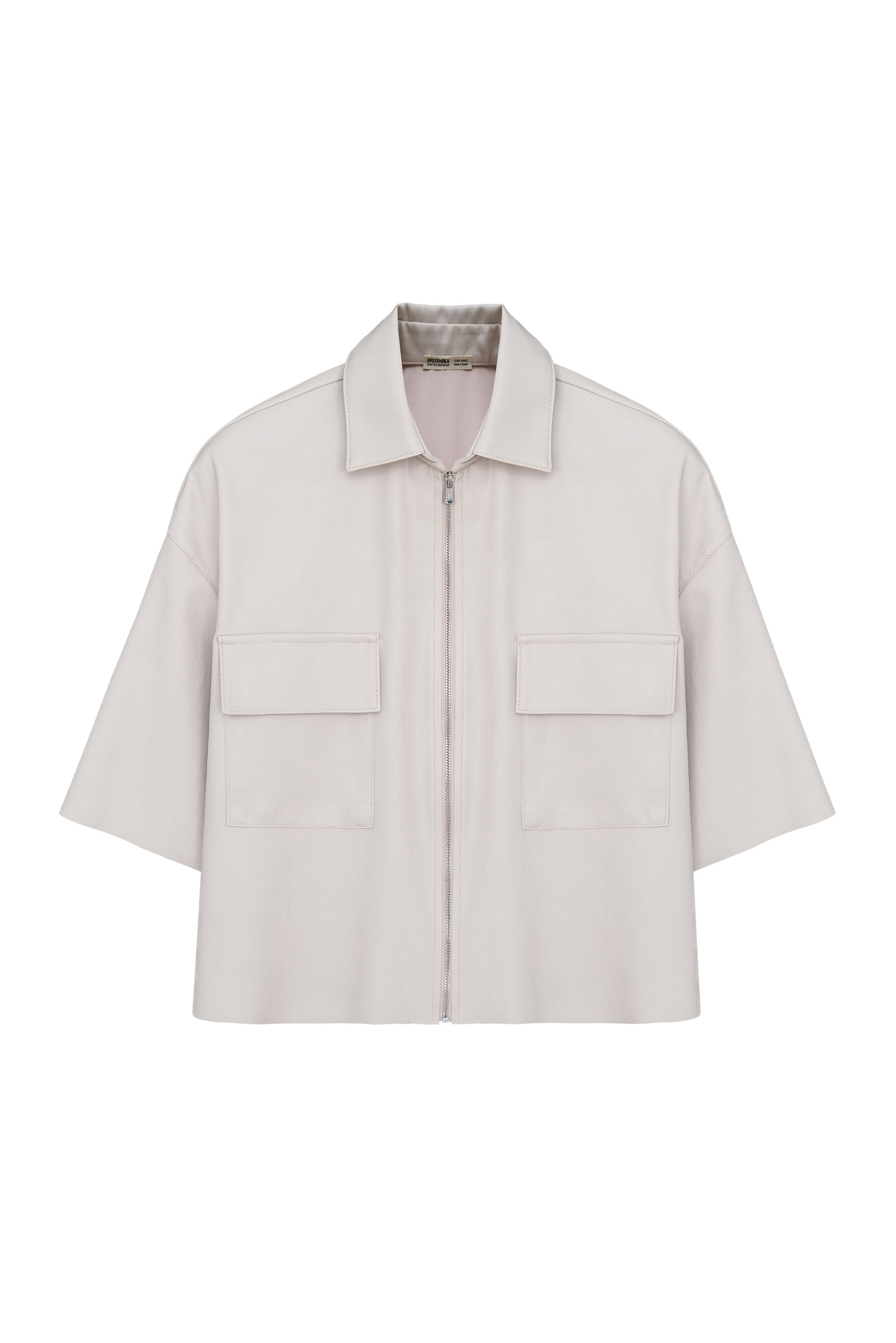 Укороченная рубашка из экокожи. Модель свободного силуэта со спущенной линией плеча, накладными карманами на груди и застежкой на молнию.