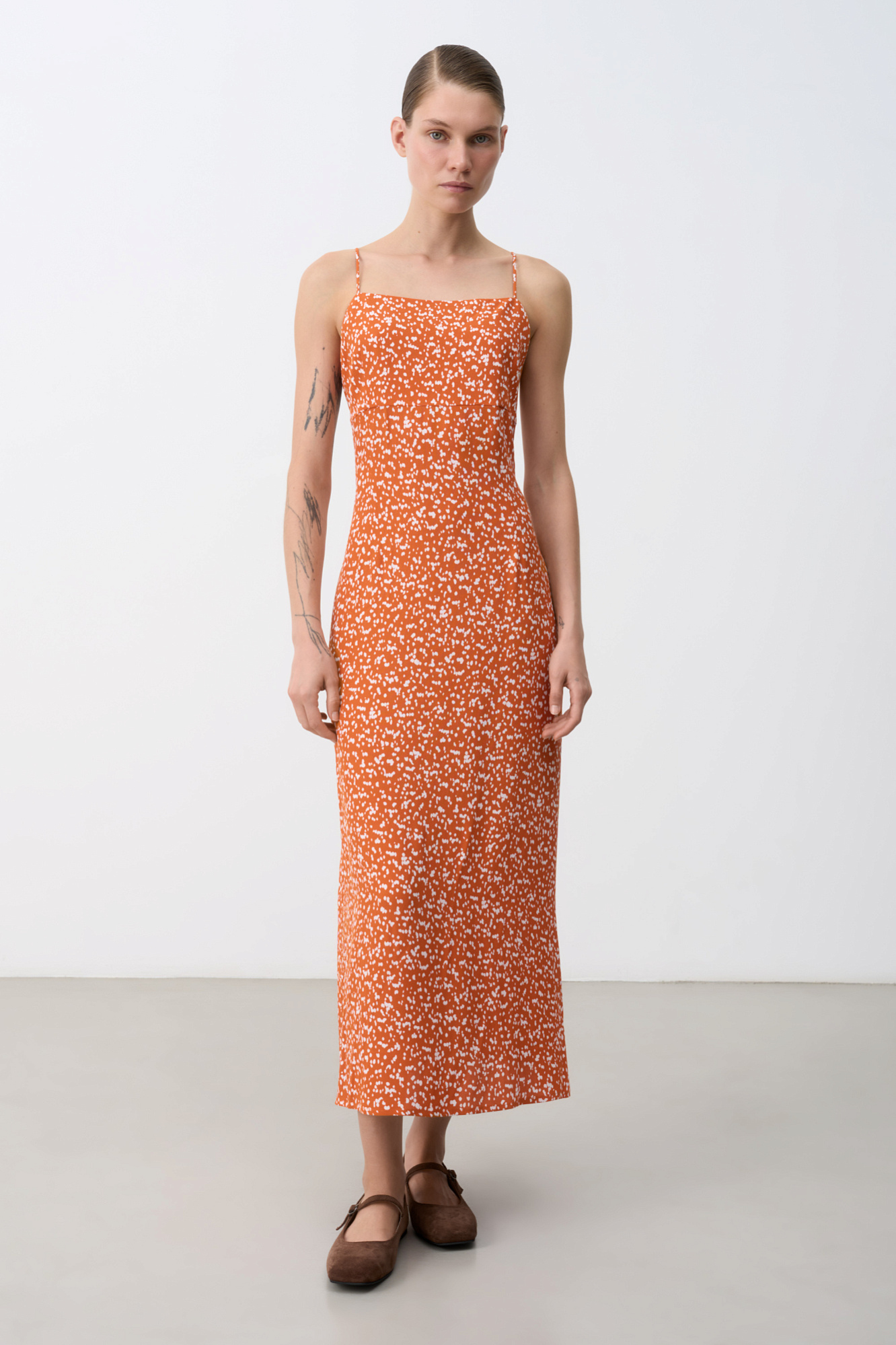 Принтованный сарафан на тонких бретелях