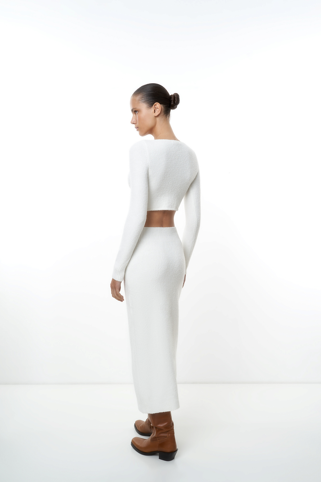 Трикотажный укороченный топ из буклированной пряжи. Модель приталенного силуэта с планкой на пуговицах. Дополнить образ можно юбкой в таком же стиле.