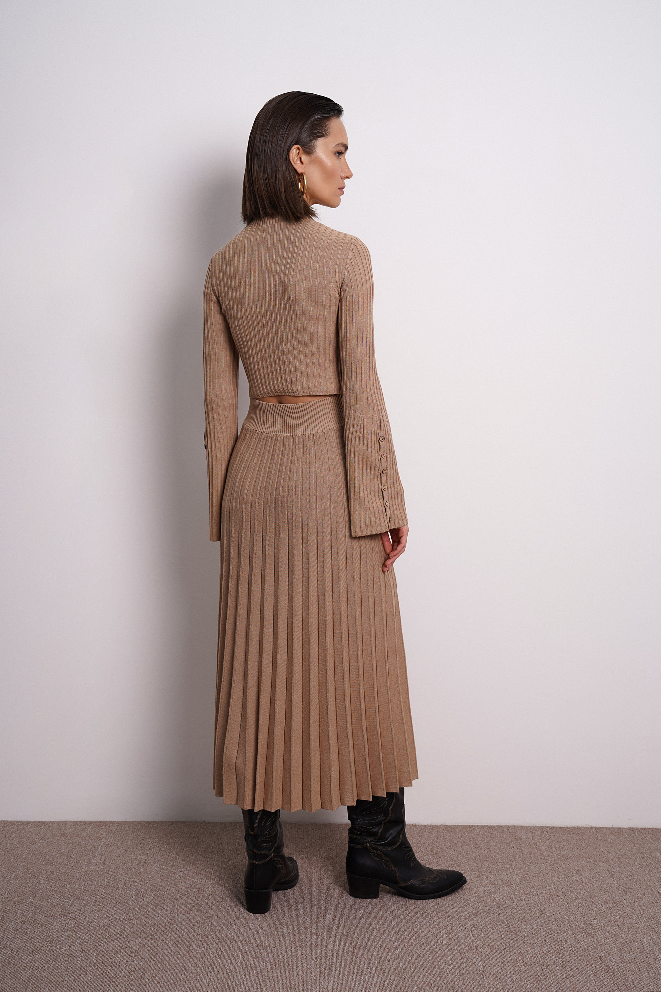 Короткий топ из шерсти с длинными рукавами клеш, на пуговицах. С его помощью можно создать романтичный образ даже с повседневными вещами. В таком топе можно выглядеть эффектно не только на вечернем выходе, но и на рабочем месте.