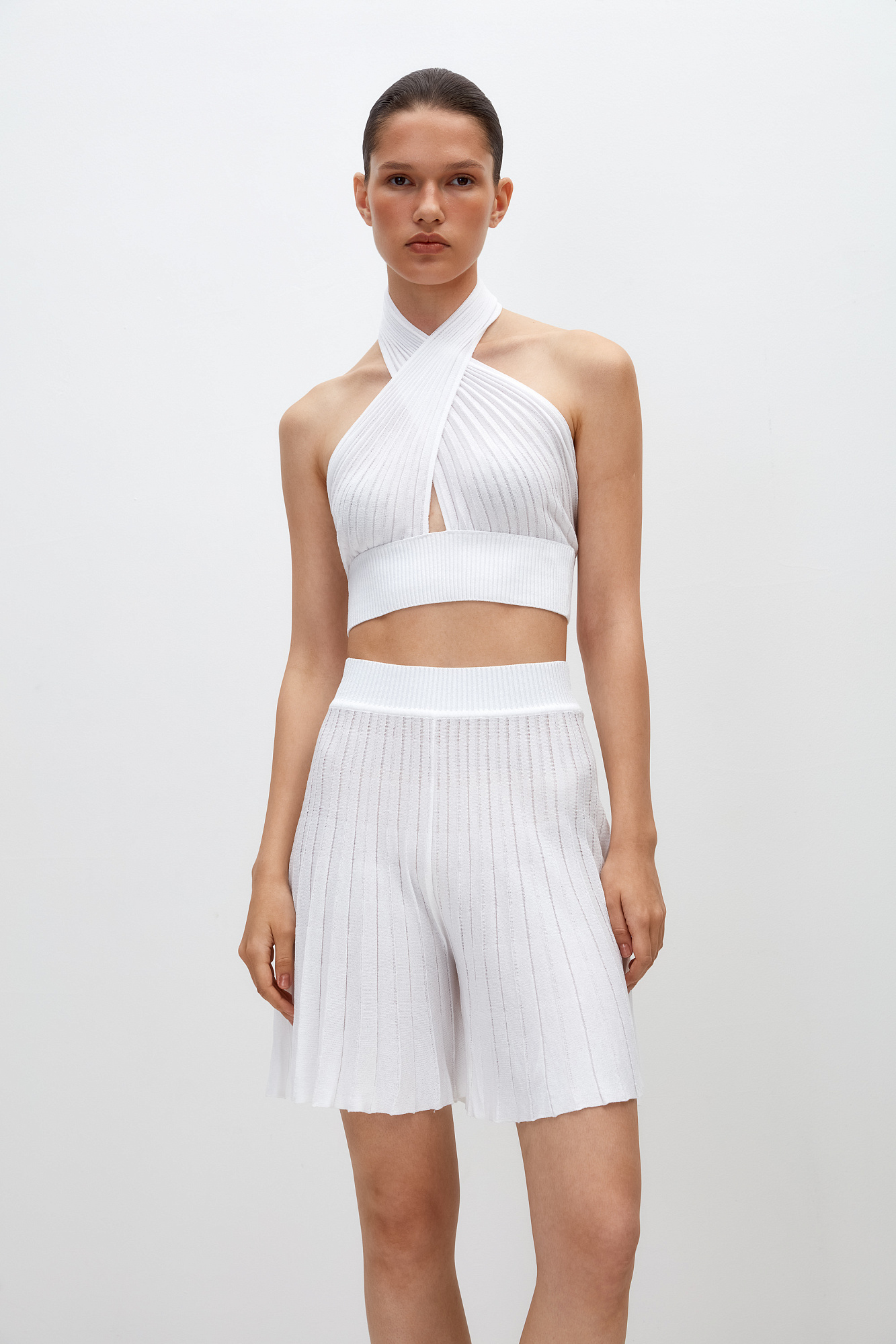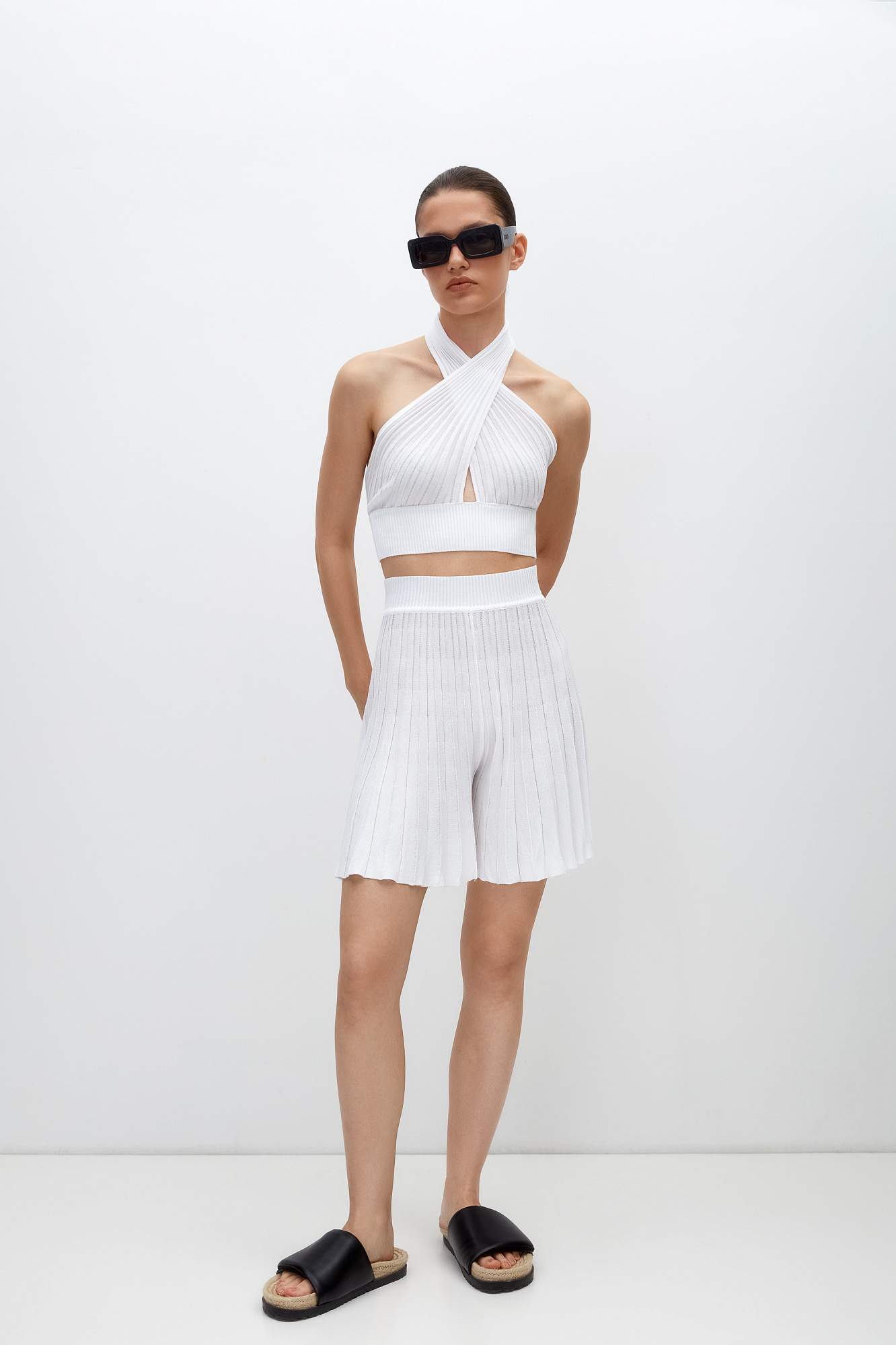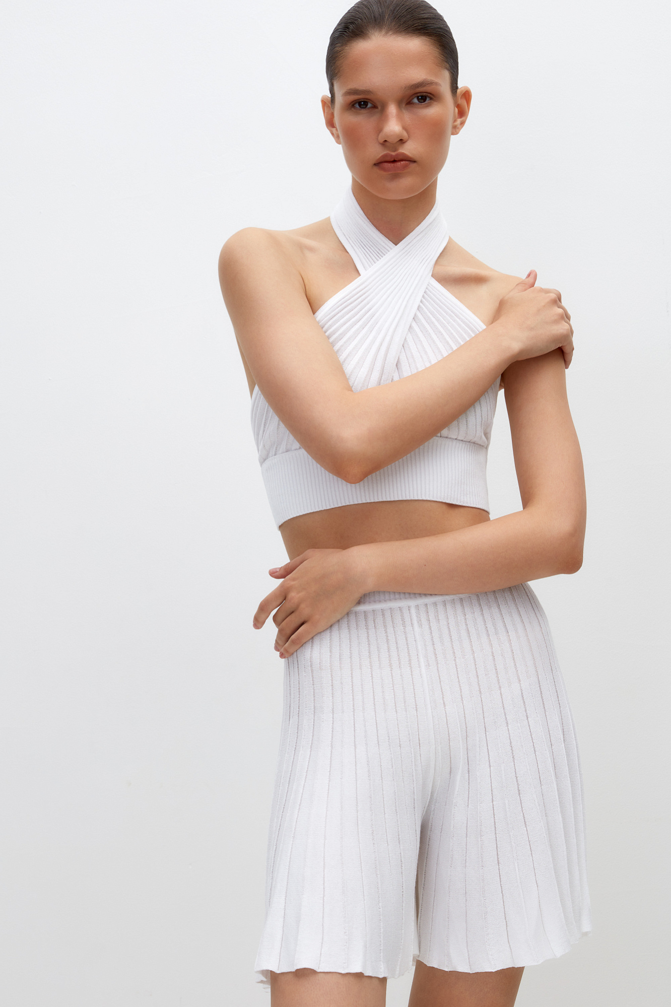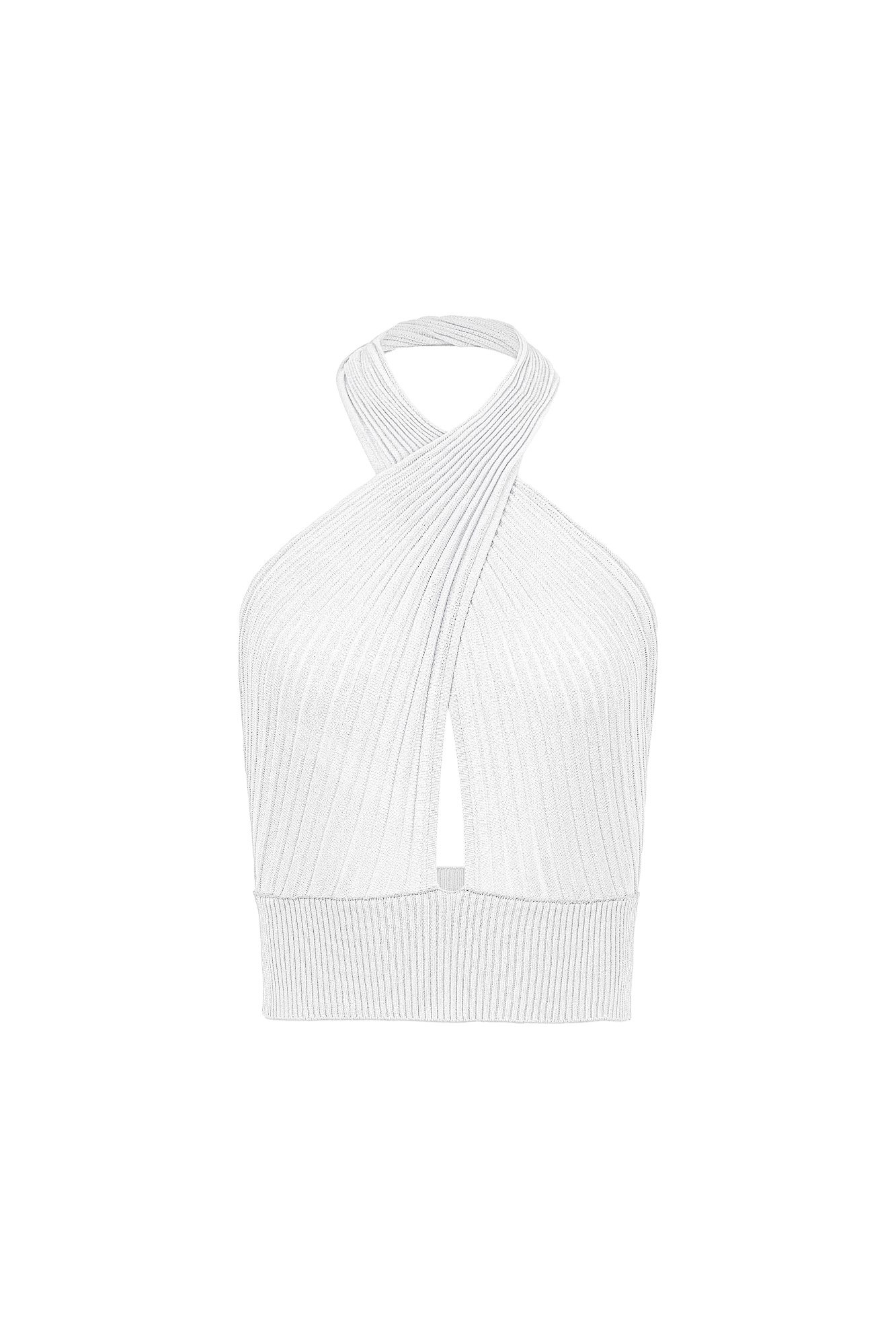 Трикотажный топ из вискозы, главная особенность — перекрещенные детали лифа, которые подчеркивают линию плеч