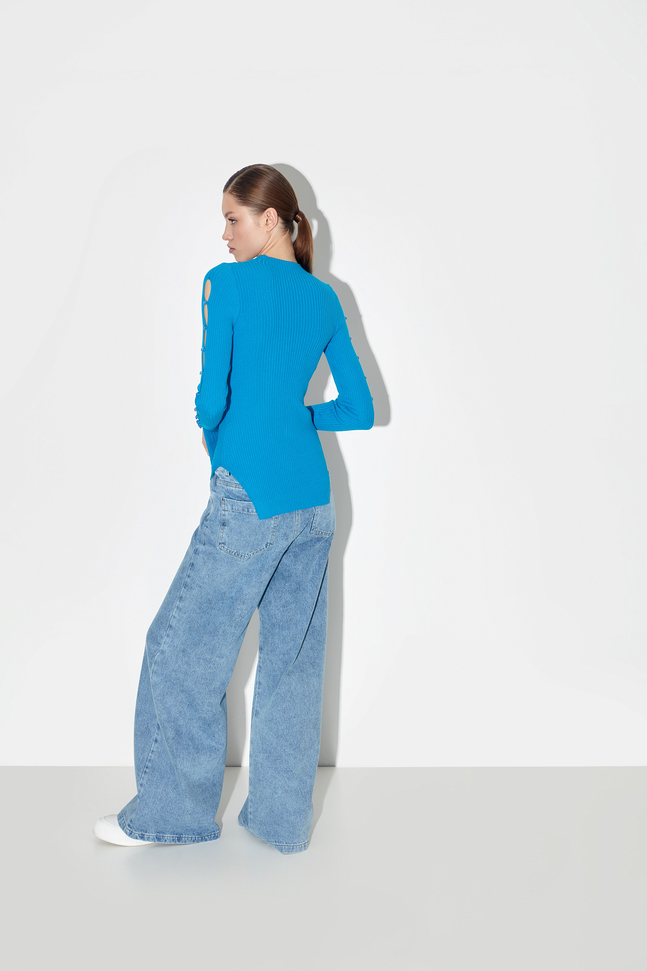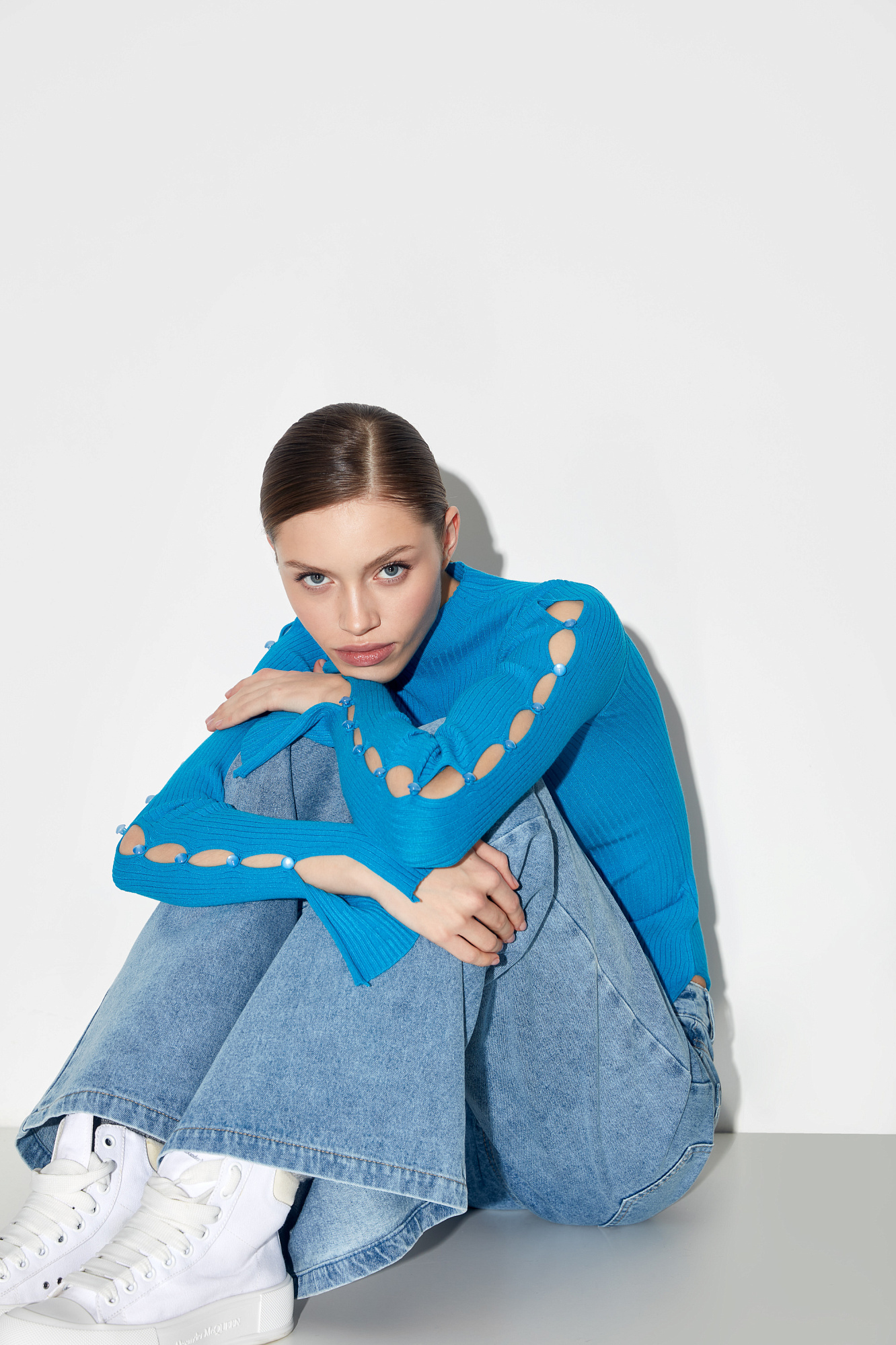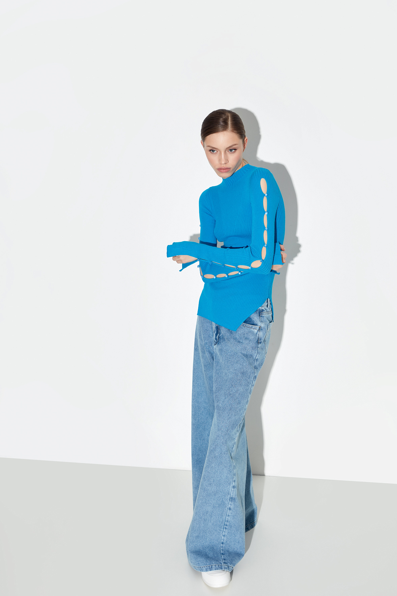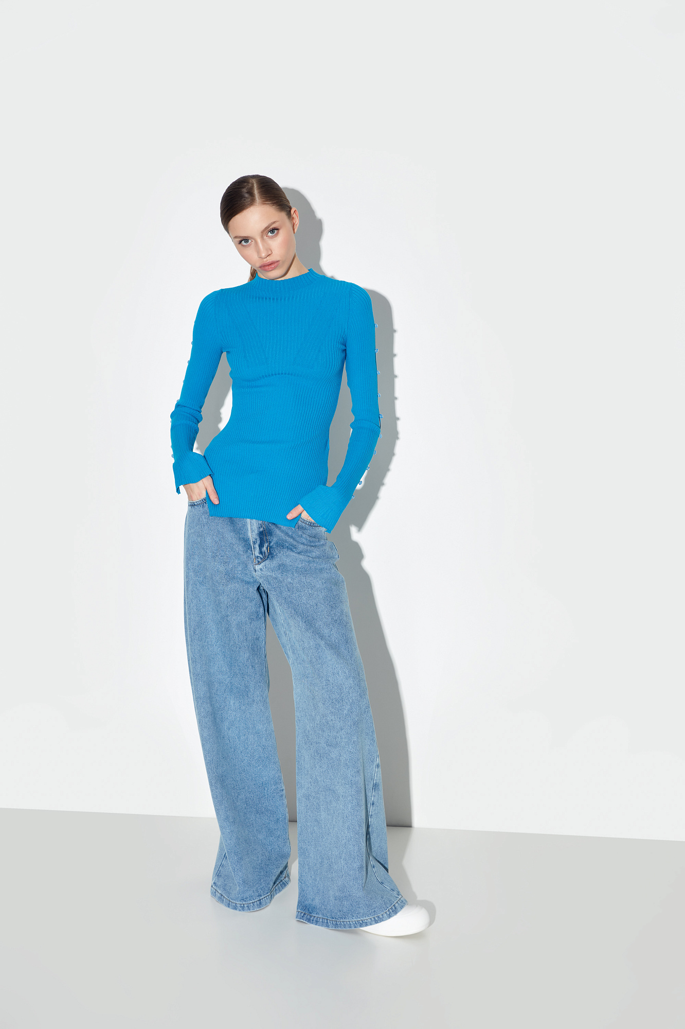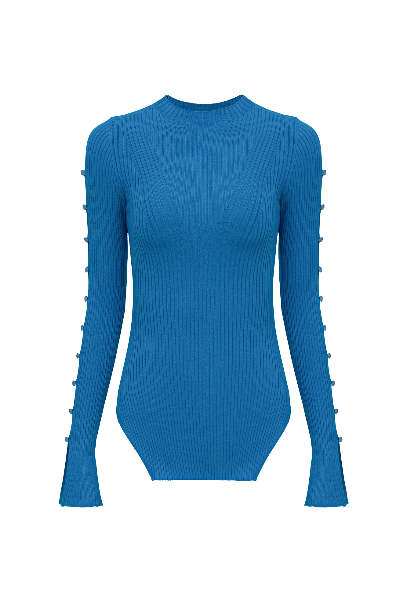 Трикотажный топ из вискозы. Модель приталенного силуэта, разрезами по бокам, с длинными рукавами на пуговицах, невысоким воротником-стойкой и декоративными сбавками на груди.