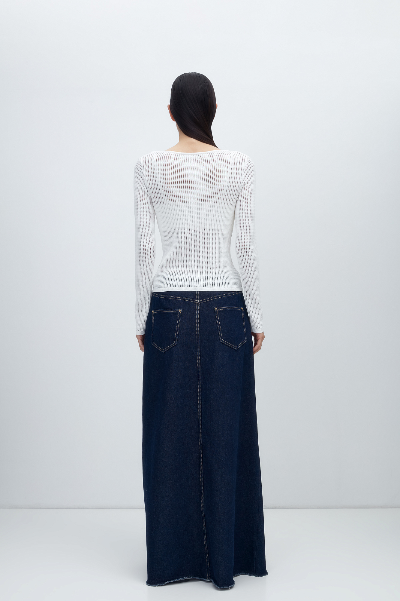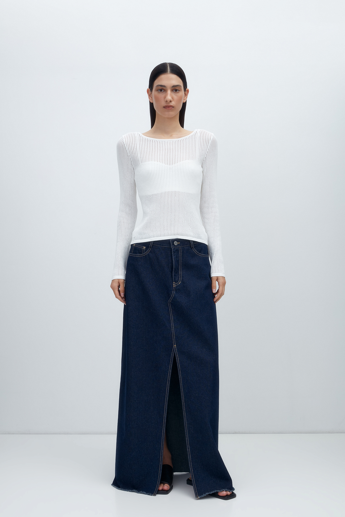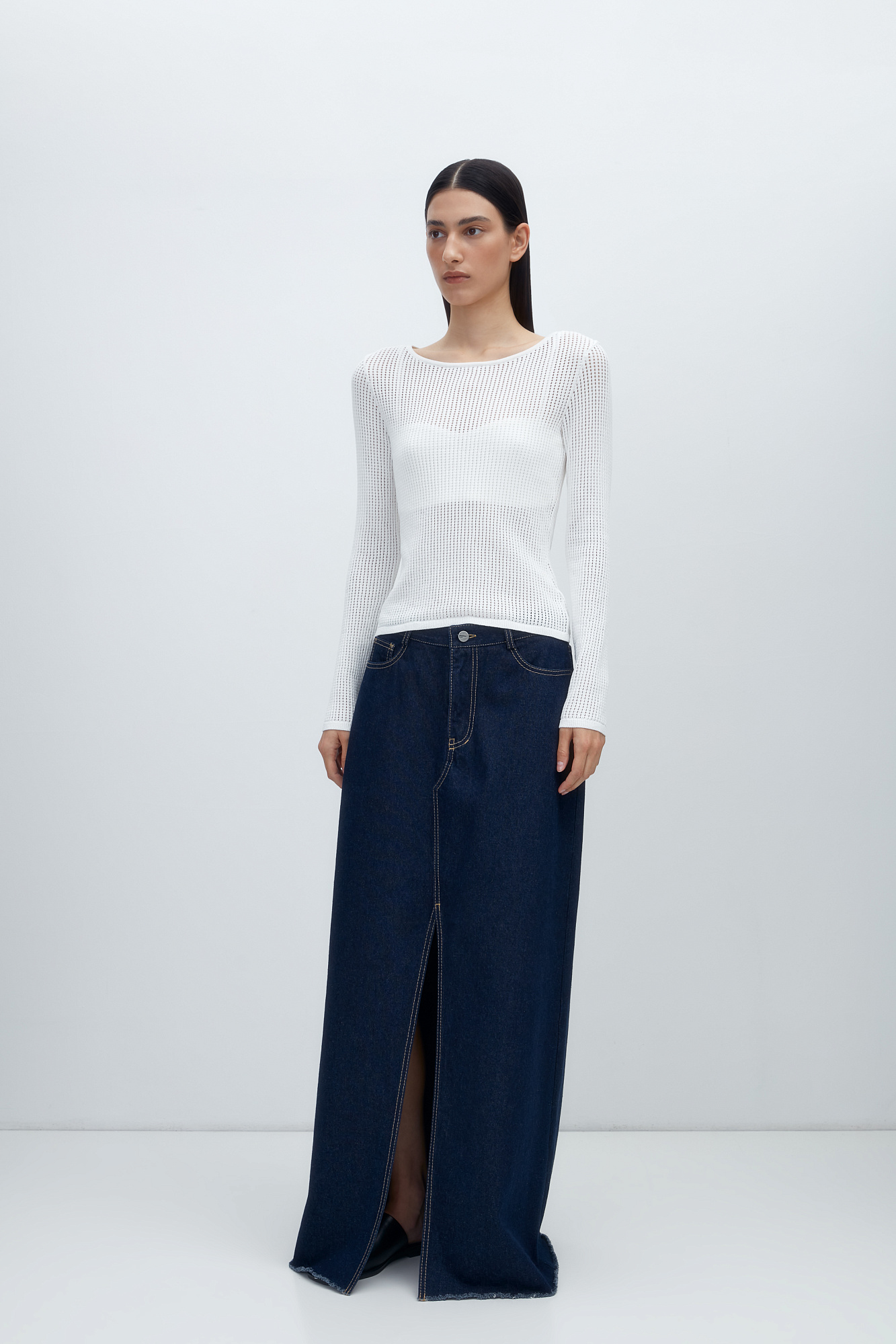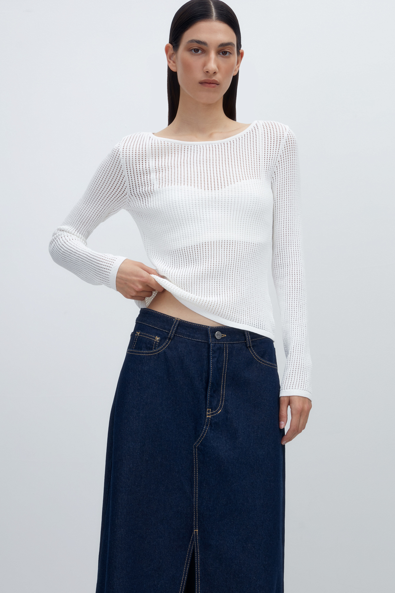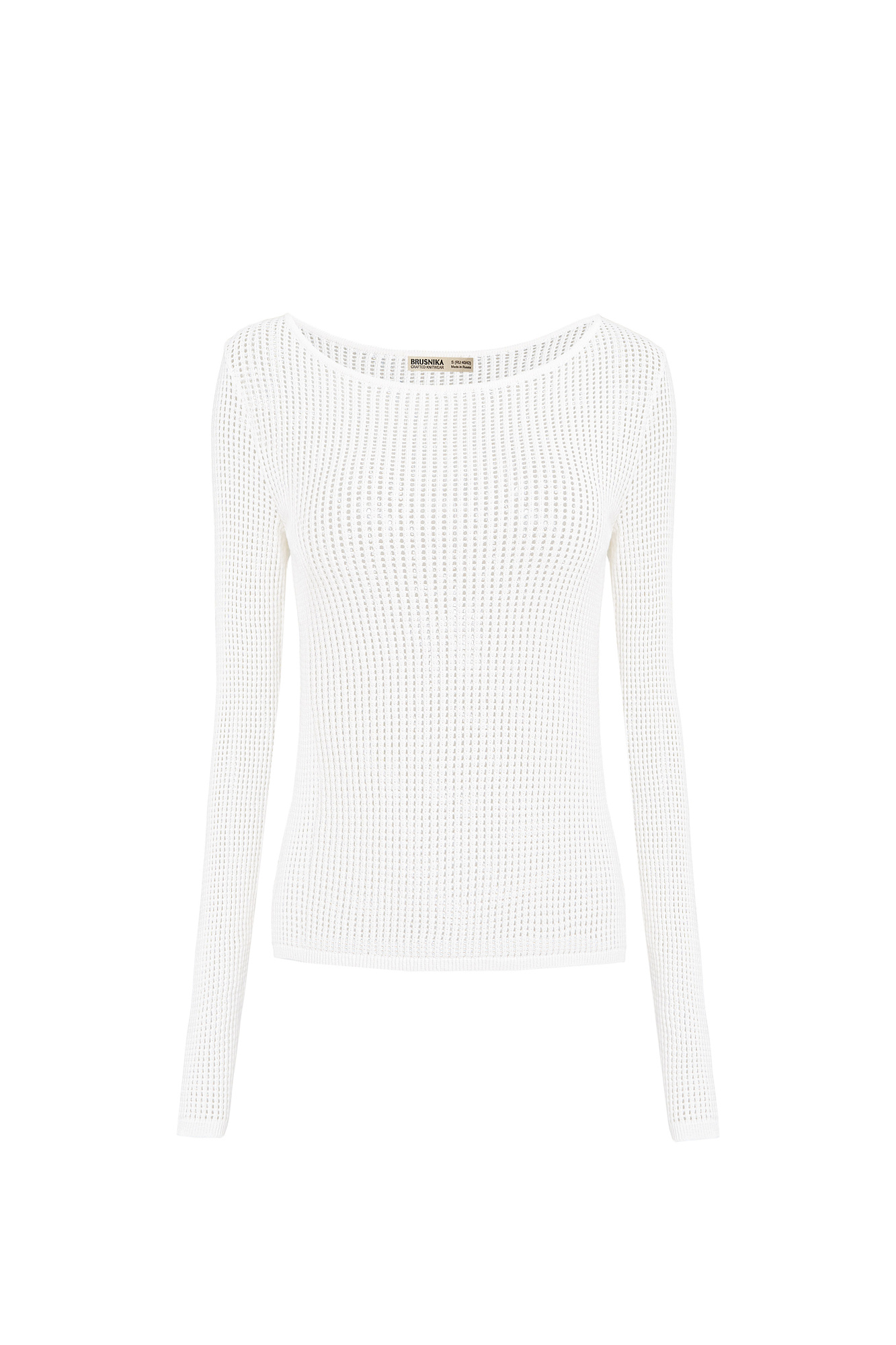 Трикотажный джемпер из органического хлопка. Модель с длинными рукавами и вырезом горловины лодочкой. Ажурное переплетение с имитацией "сетки".