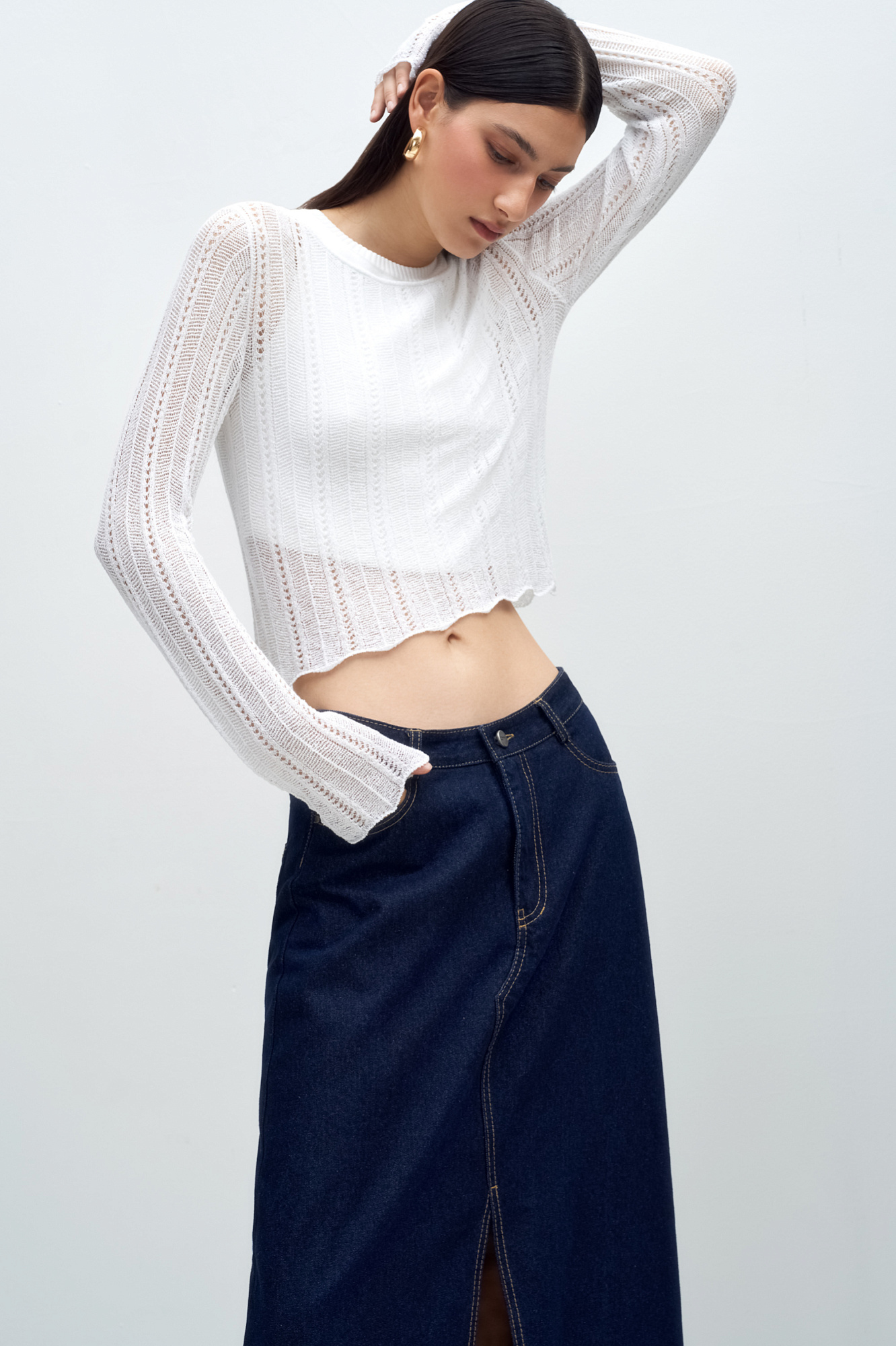 Трикотажный укороченный топ с длинным рукавом. Модель выполнена ажурным переплетением.