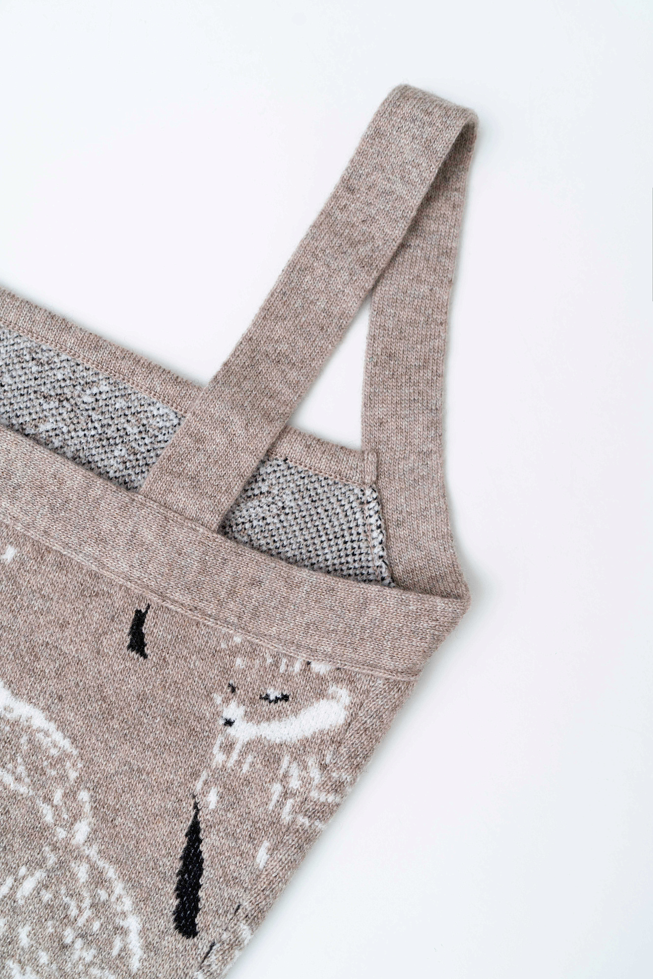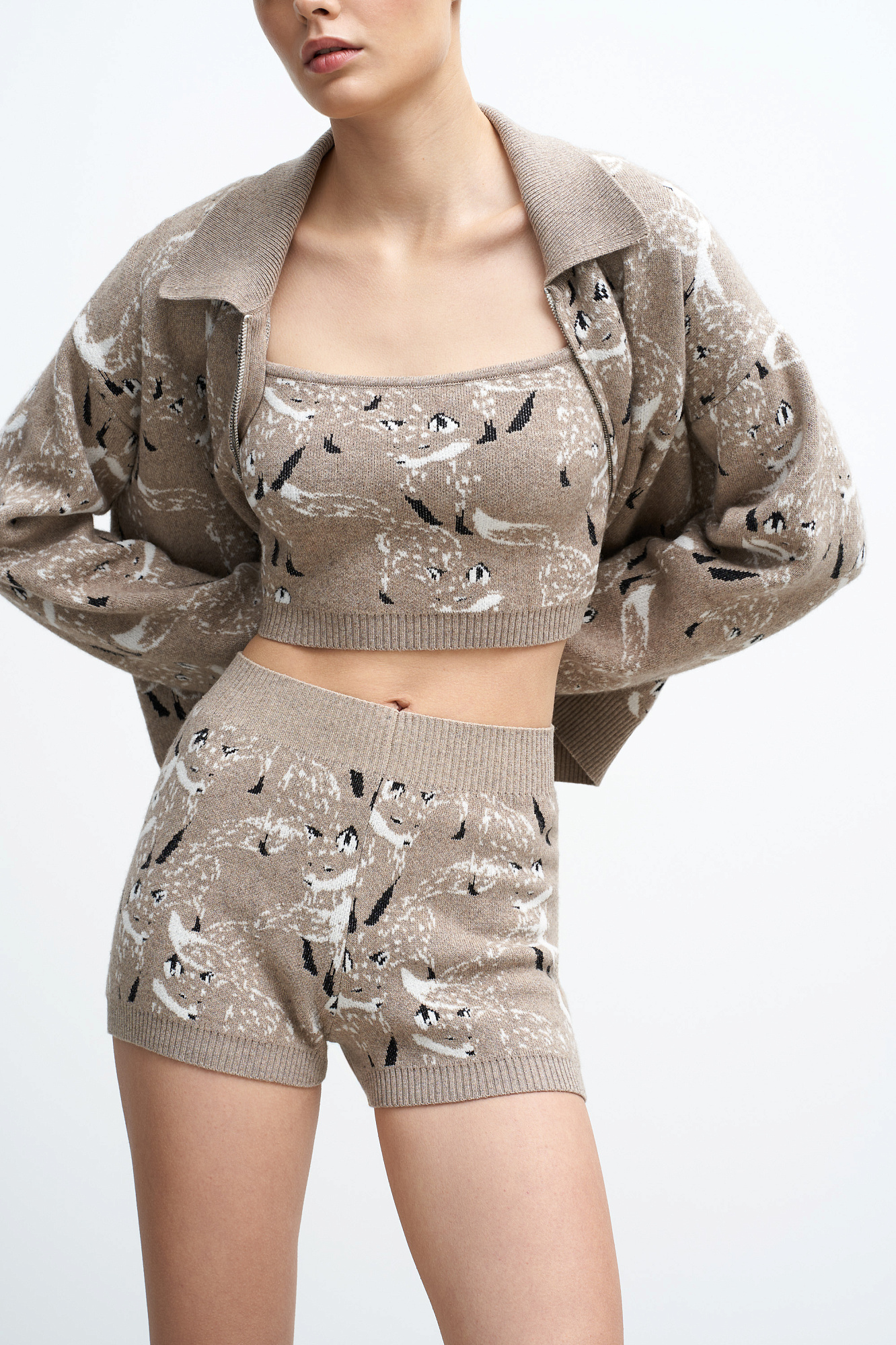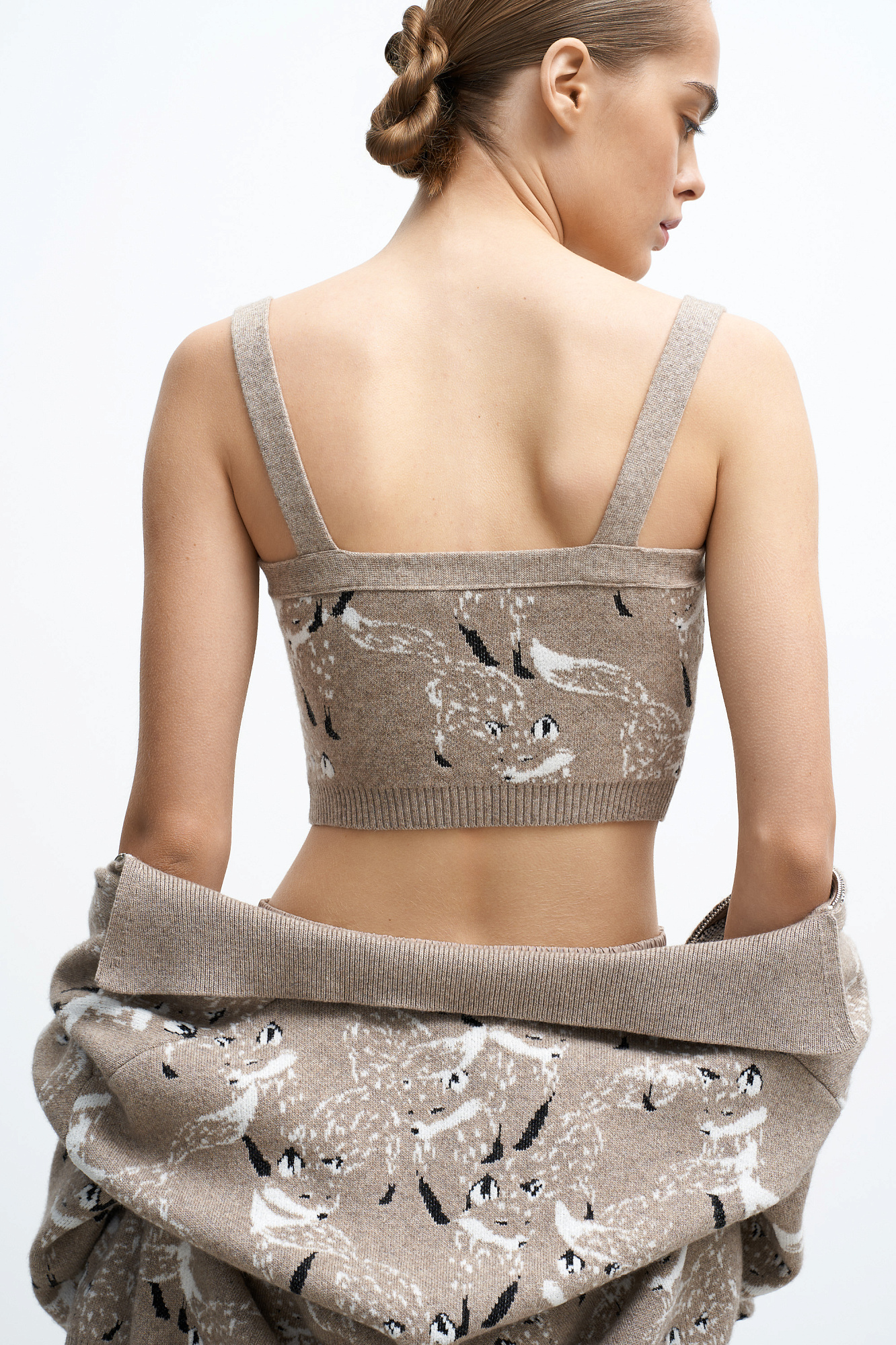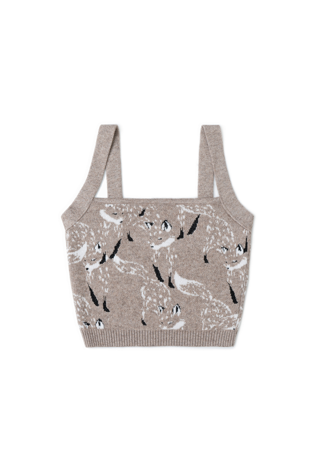 Кроп топ из шерсти и кашемира. Модель прямого кроя на широких бретельках с принтом. Края изделия выполнены в рубчик. Дополнить образ можно шортами и бомбером в том же стиле.