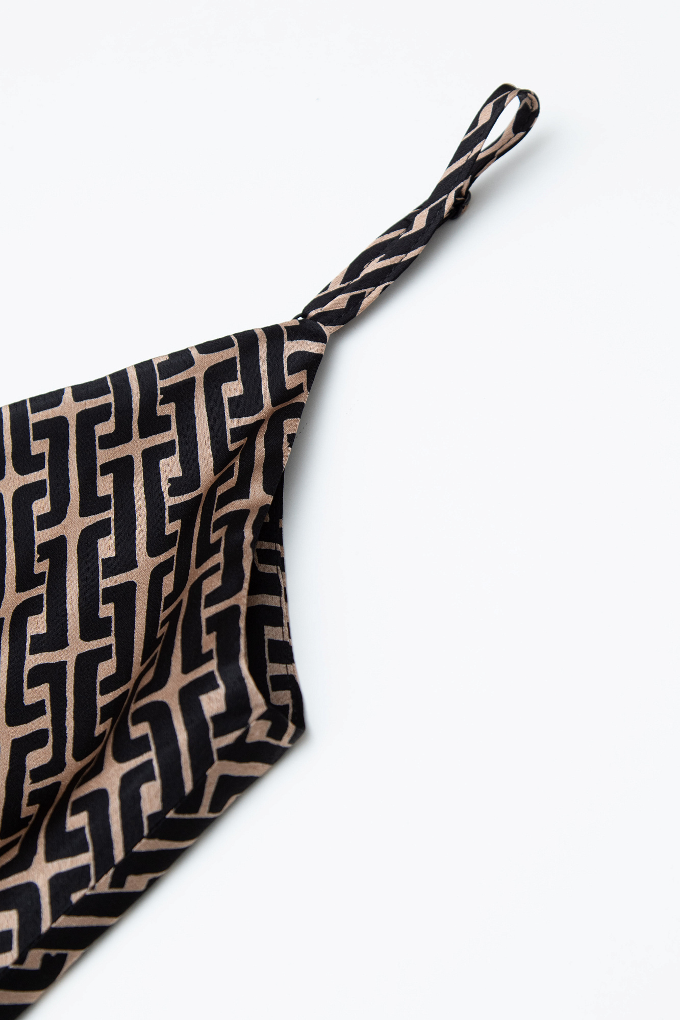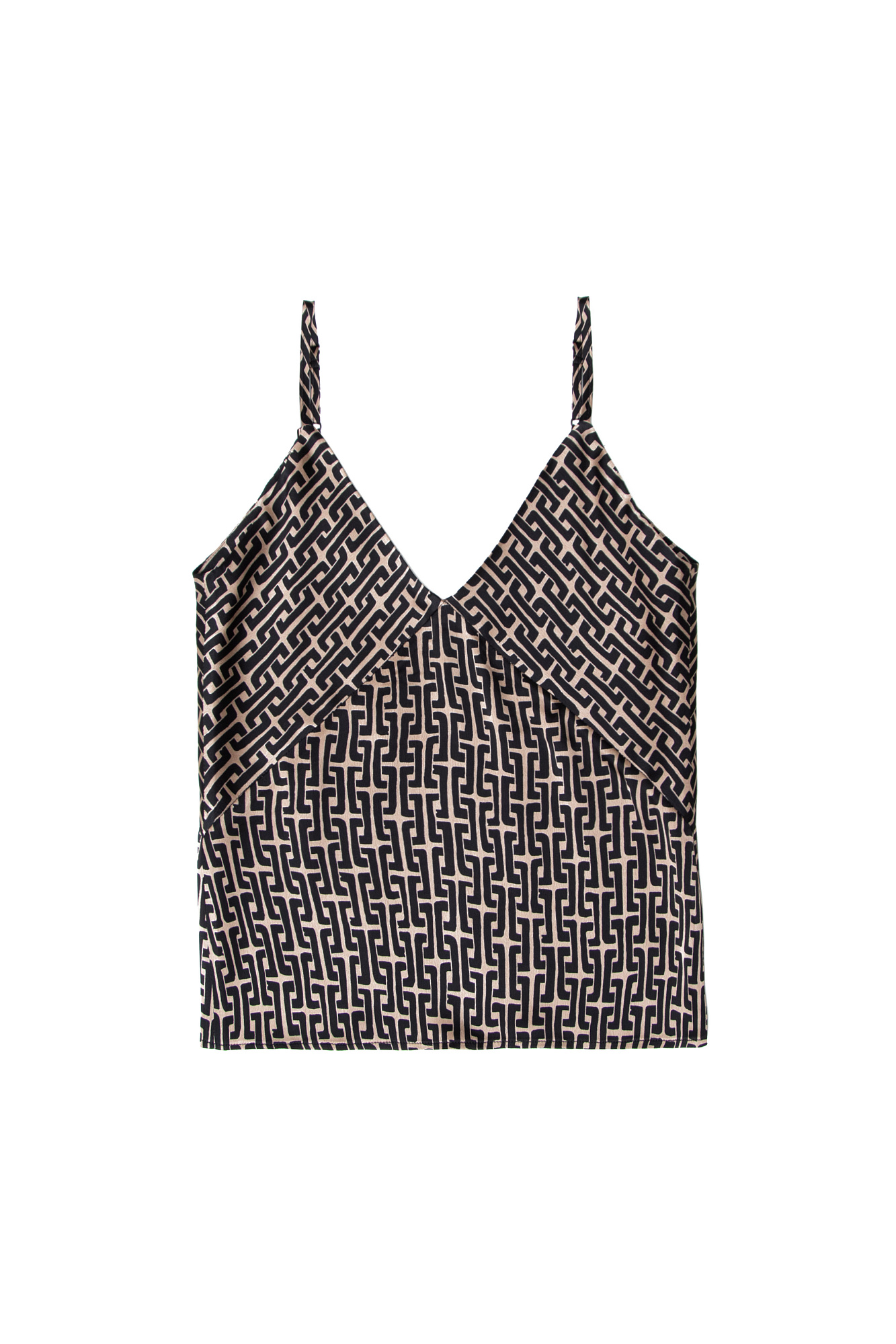 Атласный топ с принтом на тонких регулируемых бретелях. Дополнить образ можно атласной юбкой.