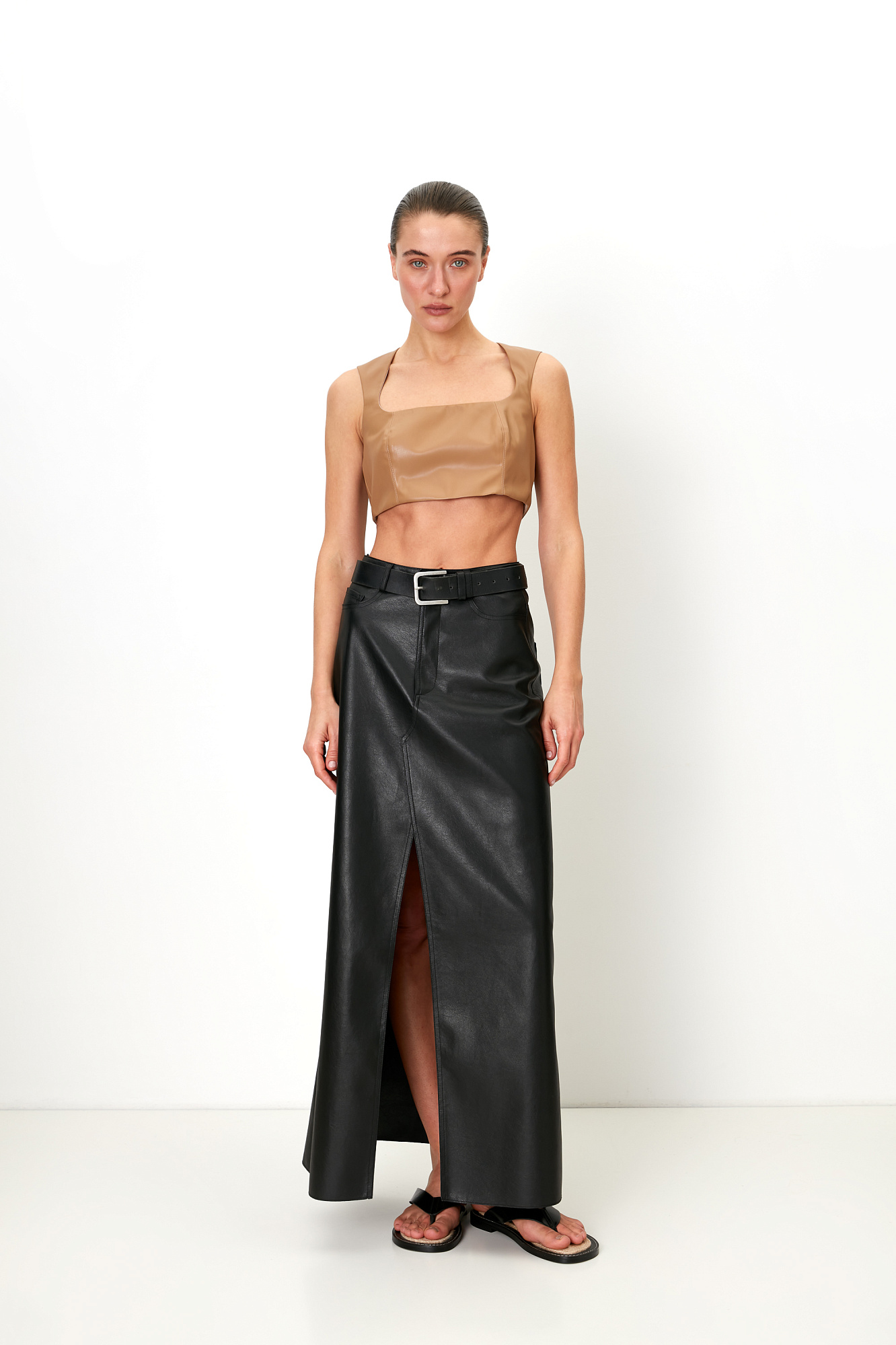 Топ из экокожи с квадратным вырезом и застежкой на молнии сзади. Дополнить образ можно плиссированной юбкой.