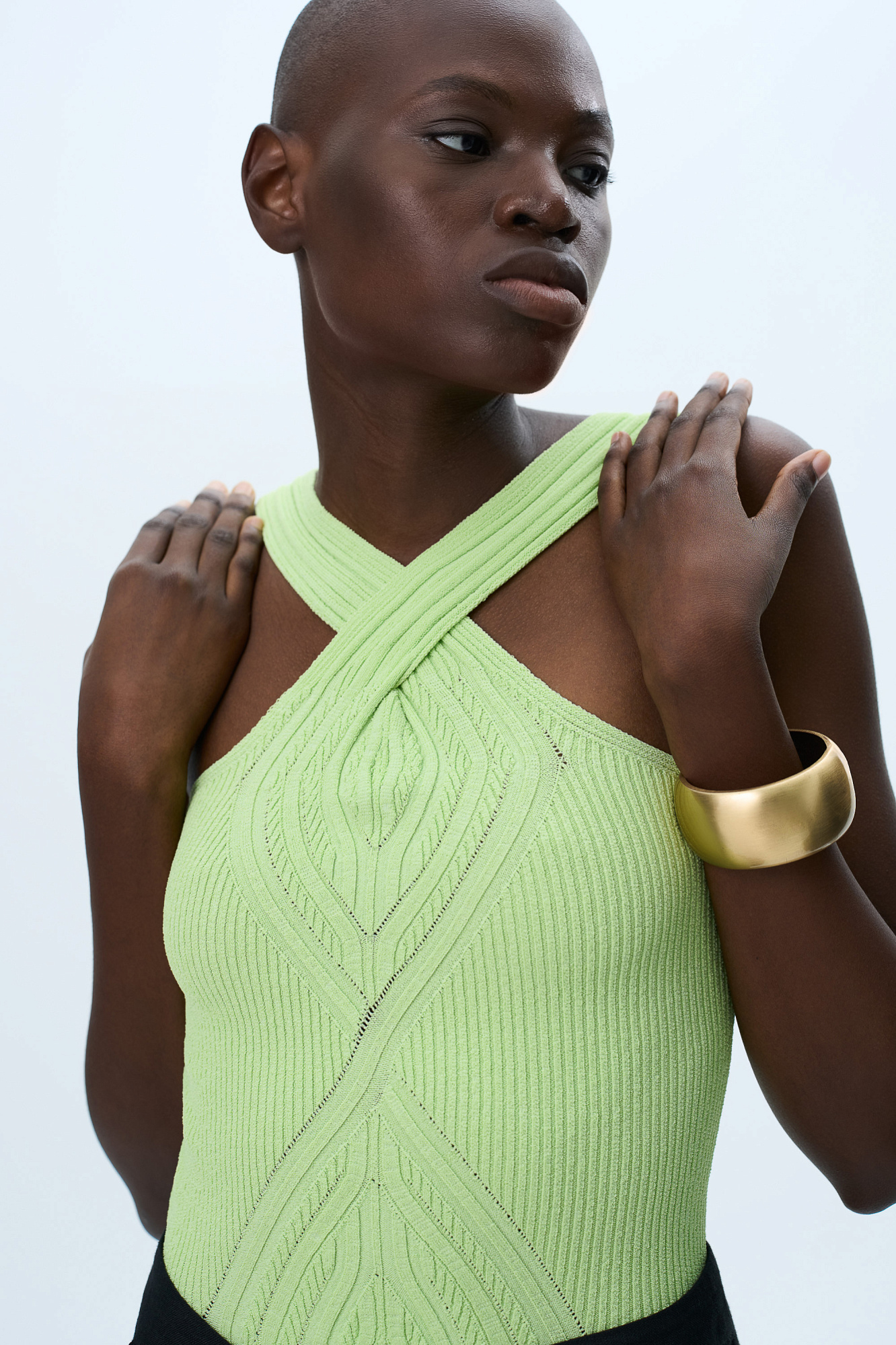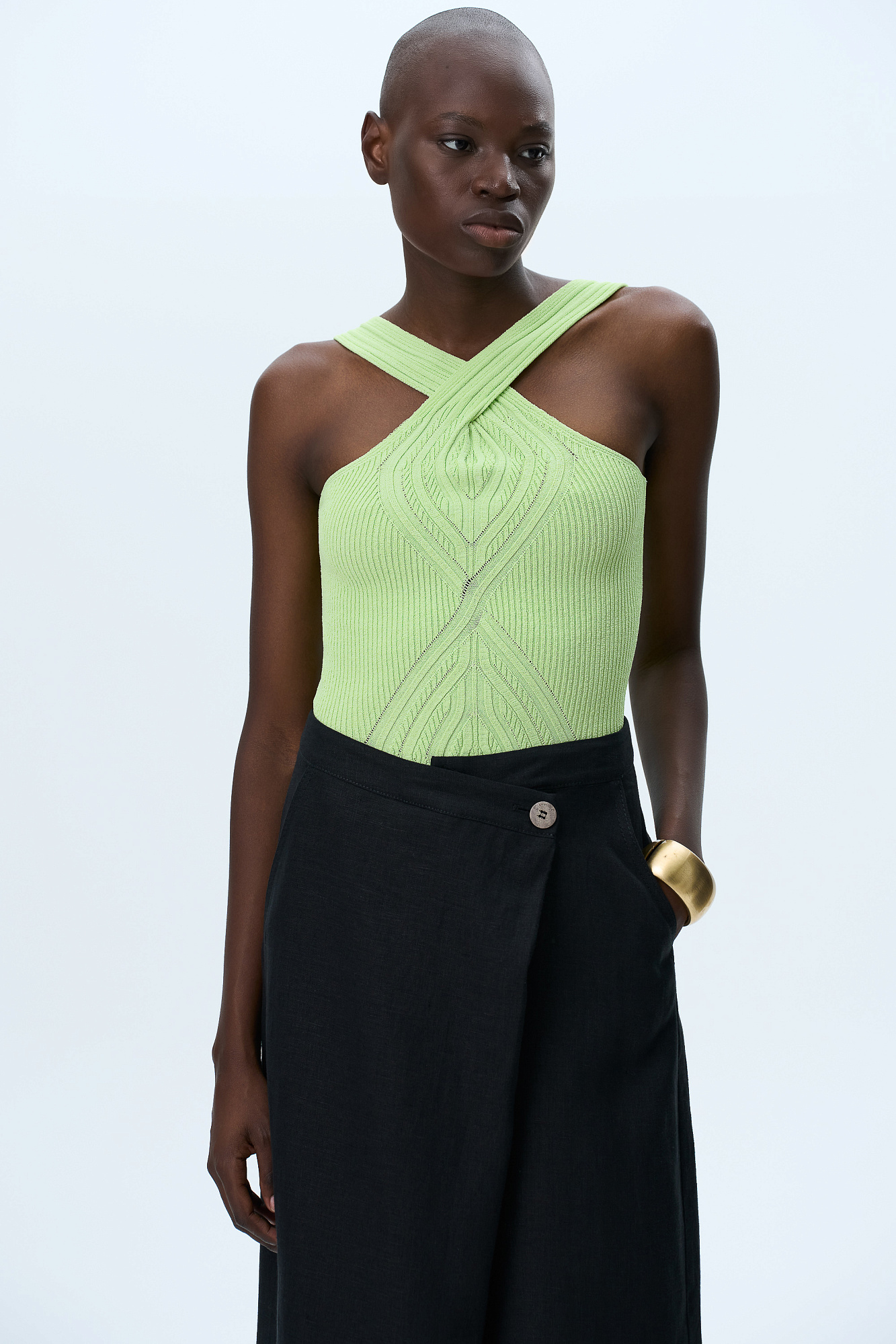 Трикотажный топ из вискозы с вывязанным орнаметном и перекрутом спереди.