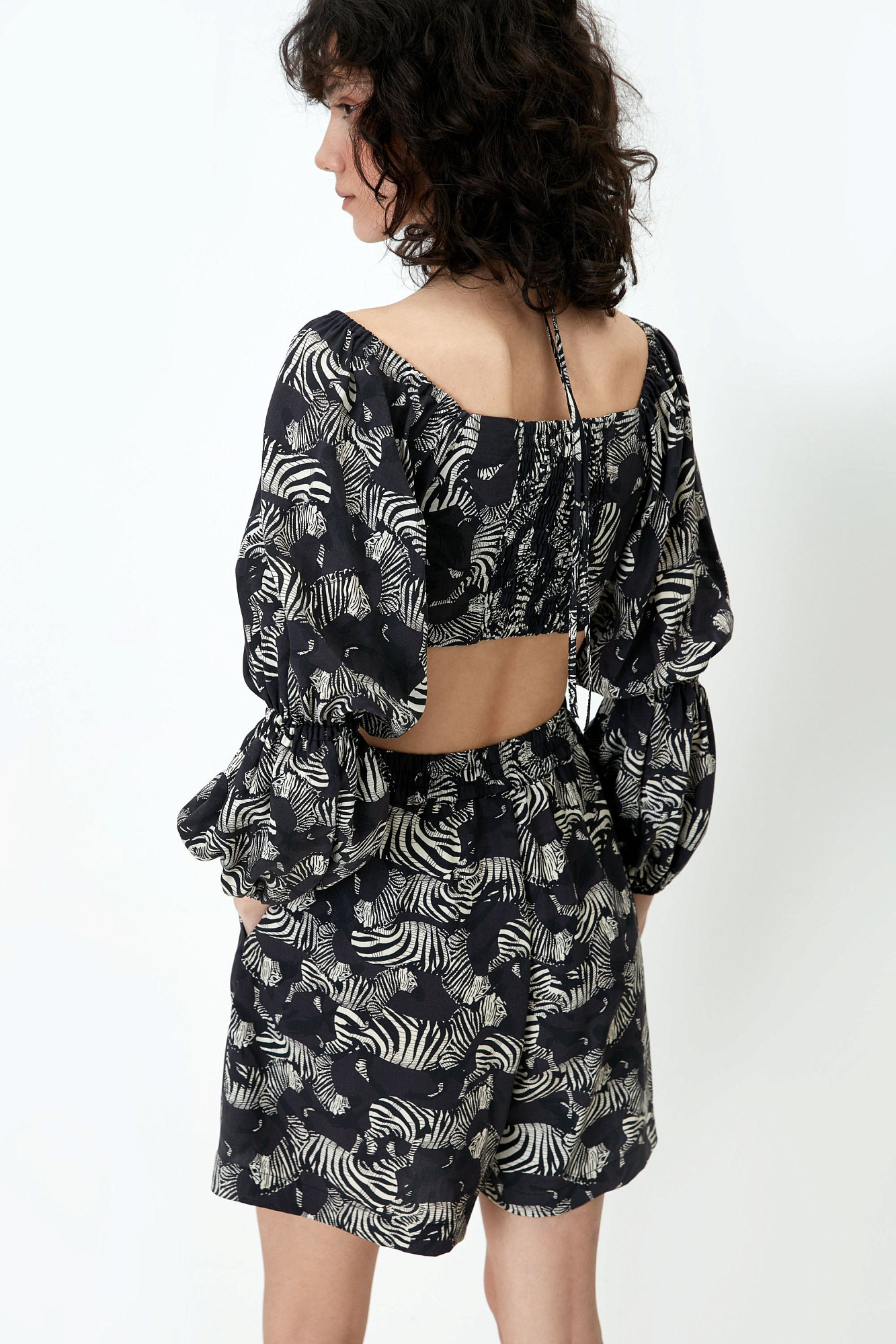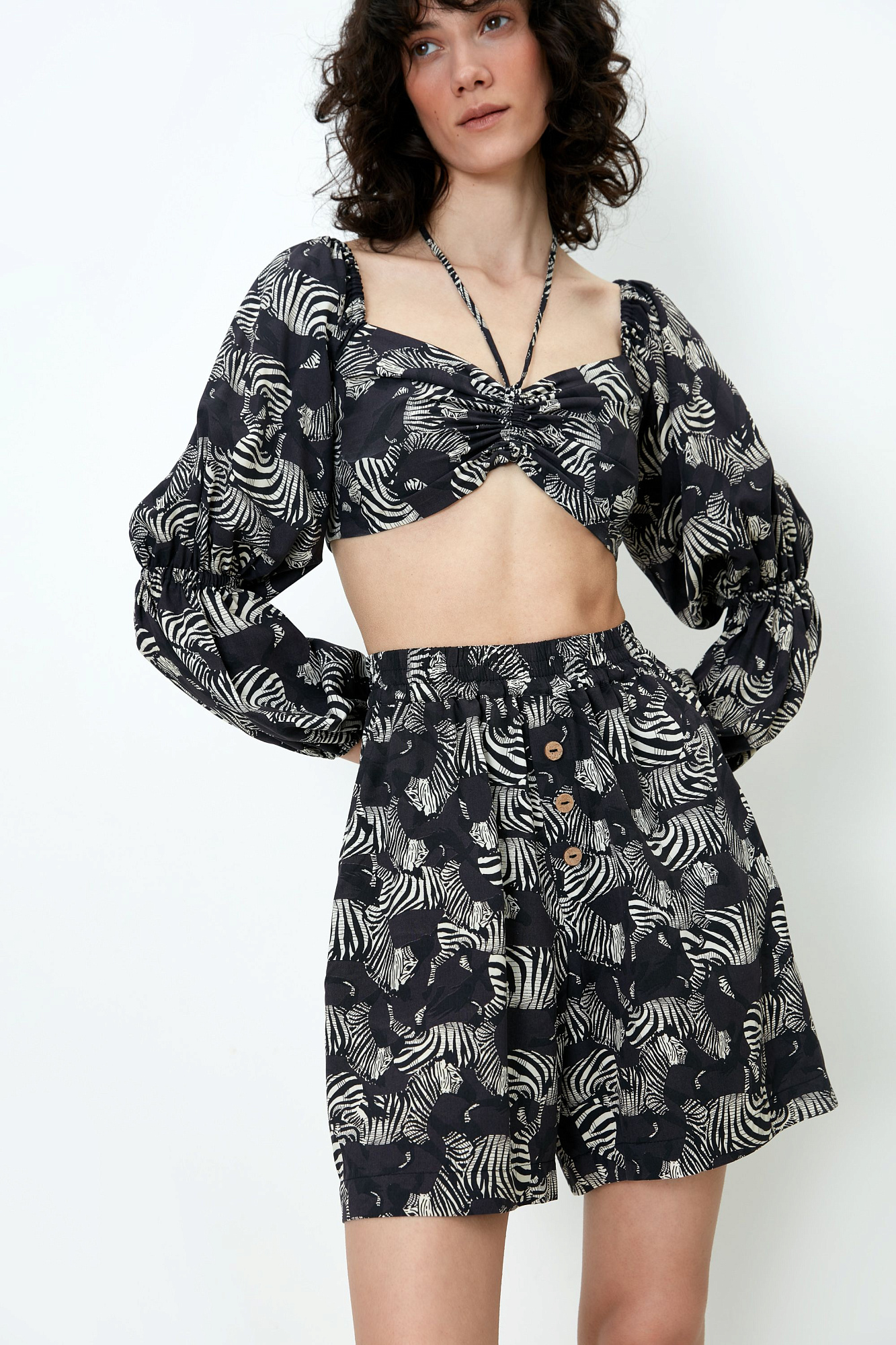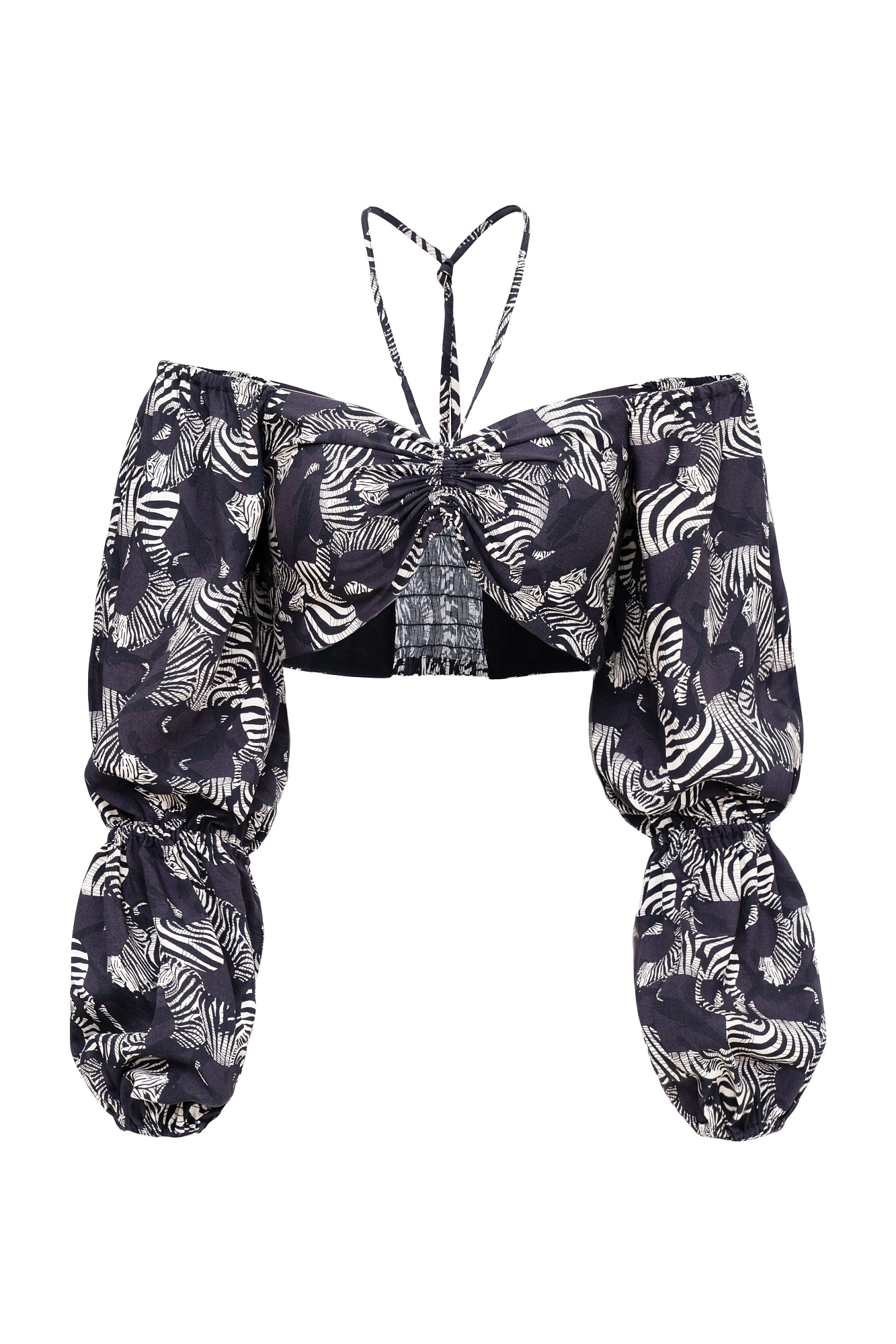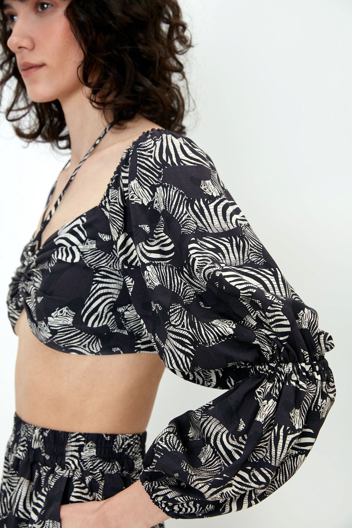 Короченный топ из 100% вискозы. Модель на кулиске, с длинным рукавом. Спинка изделия выполнена на резинке.
