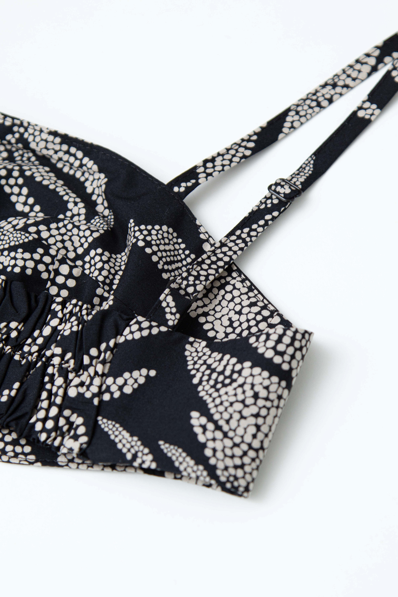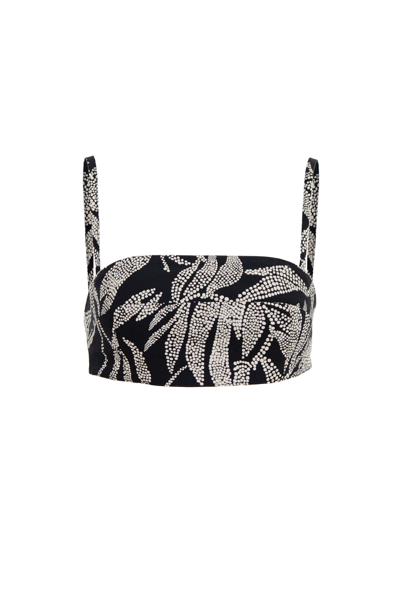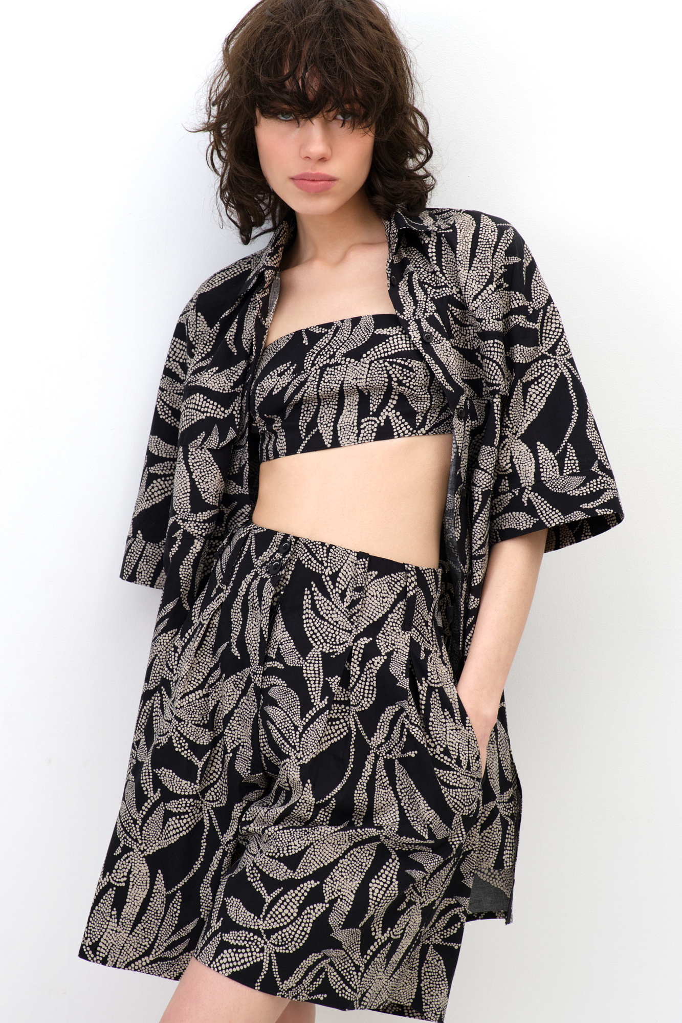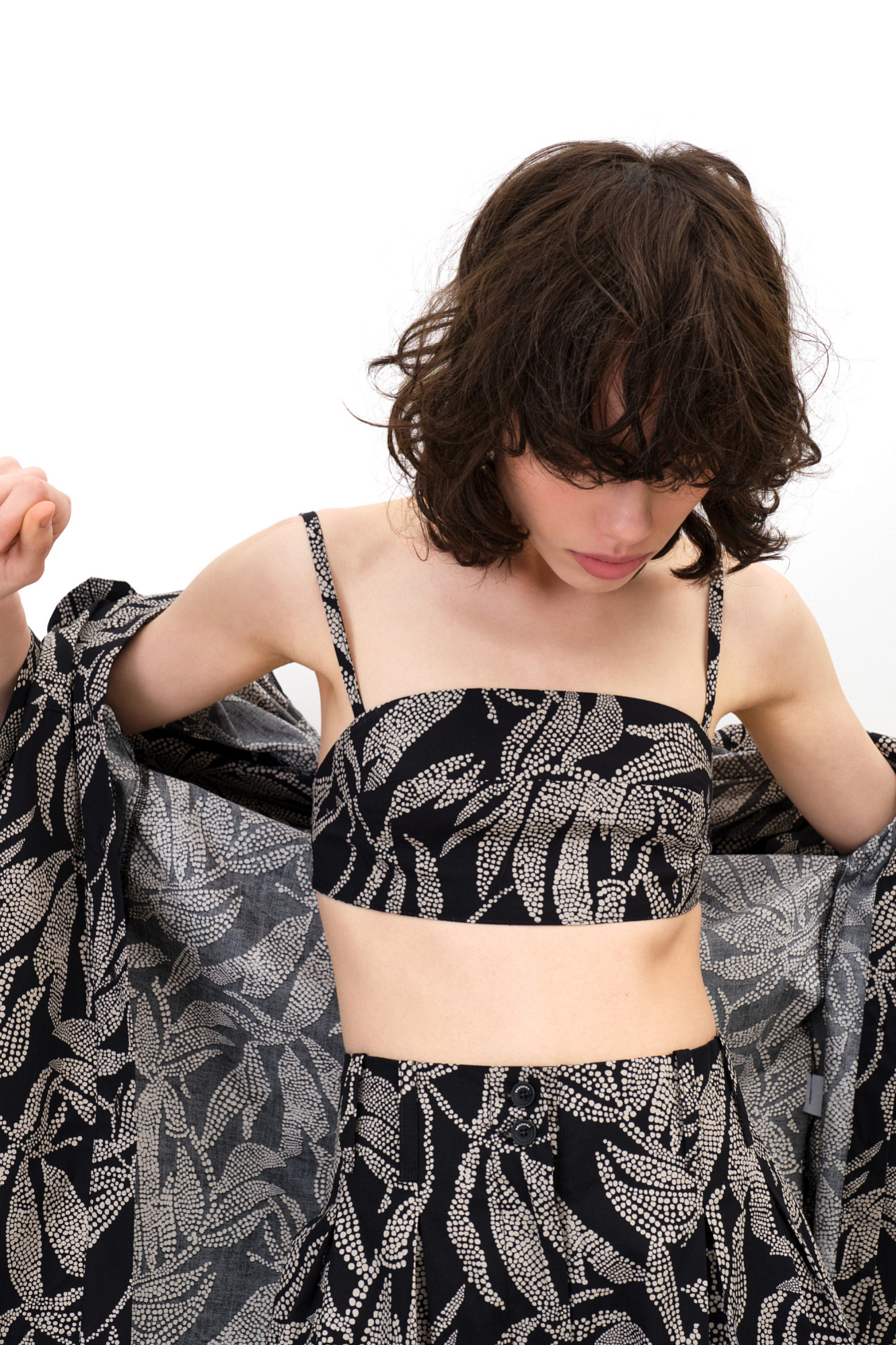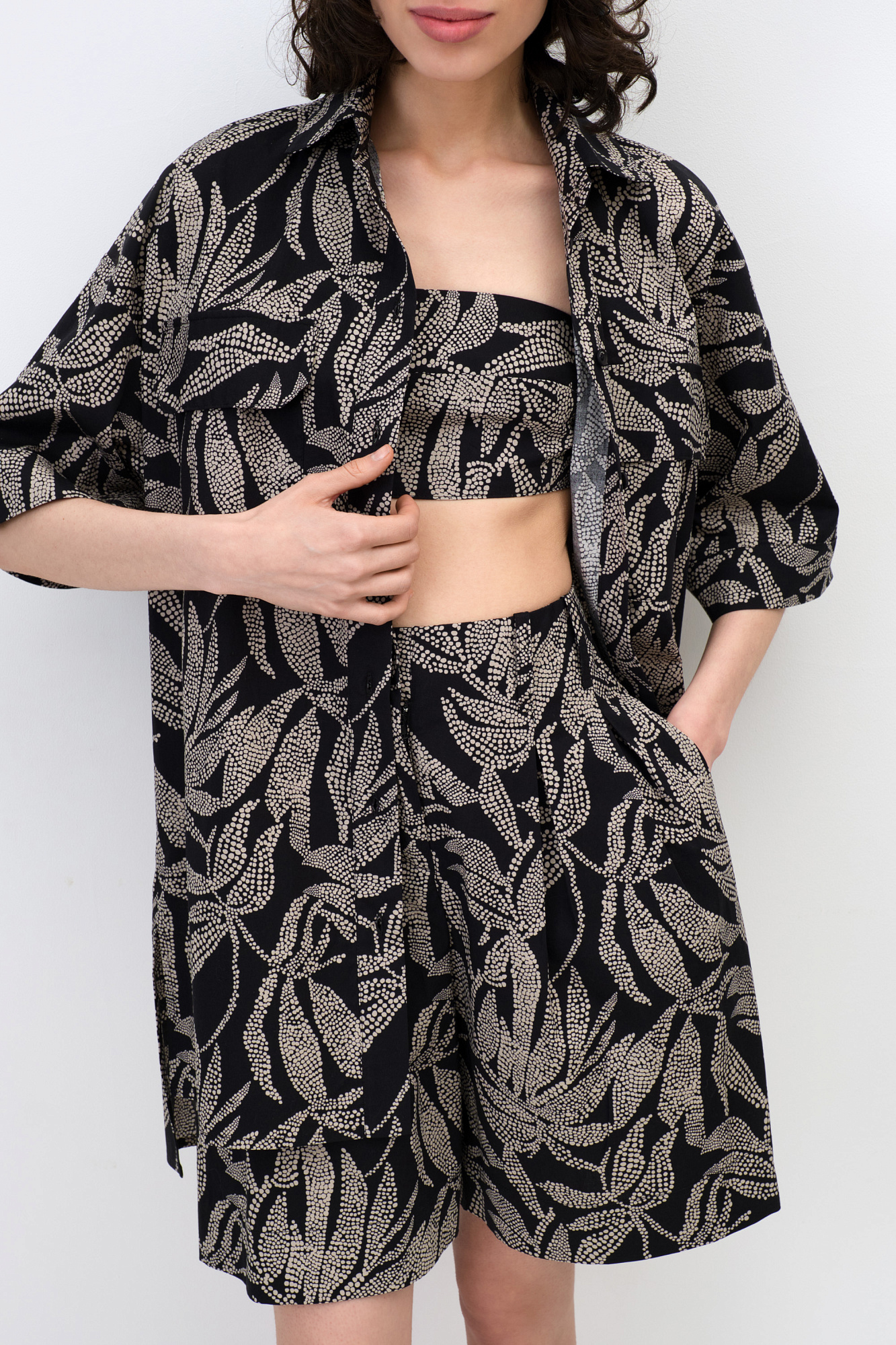 Принтованный топ из 100% хлопка на бретелях и эластичной ленте на спине. Дополнить образ можно рубашкой и шортами в таком же стиле.