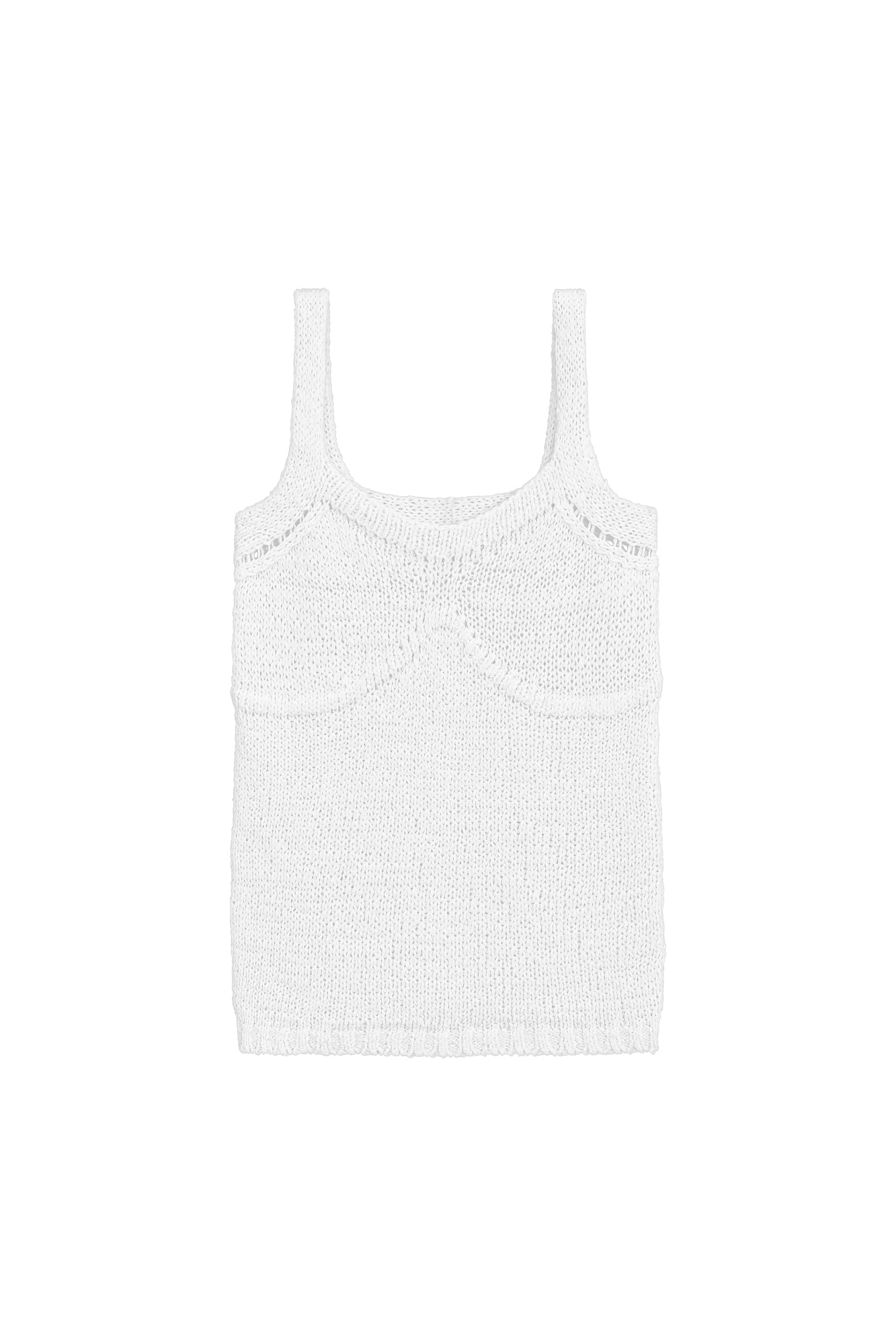 Трикотажный топ из хлопка с добавлением акрила. Модель на тонких бретелях с вывязанным лифом.
