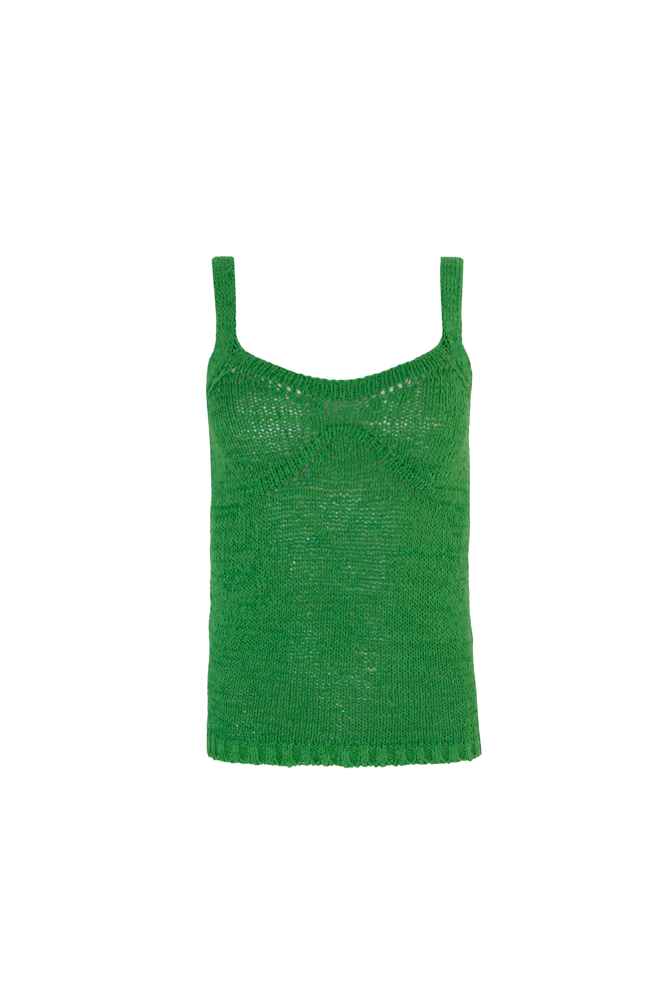 Трикотажный топ из хлопка с добавлением акрила. Модель на тонких бретелях с вывязанным лифом.