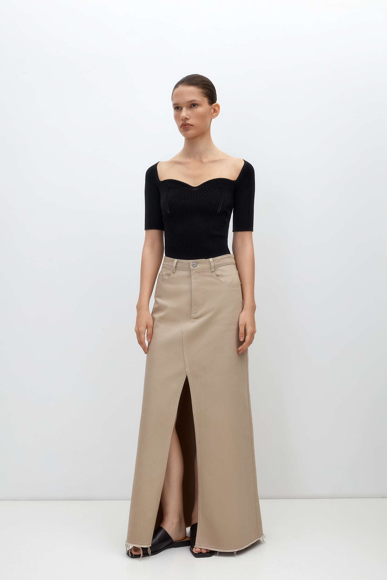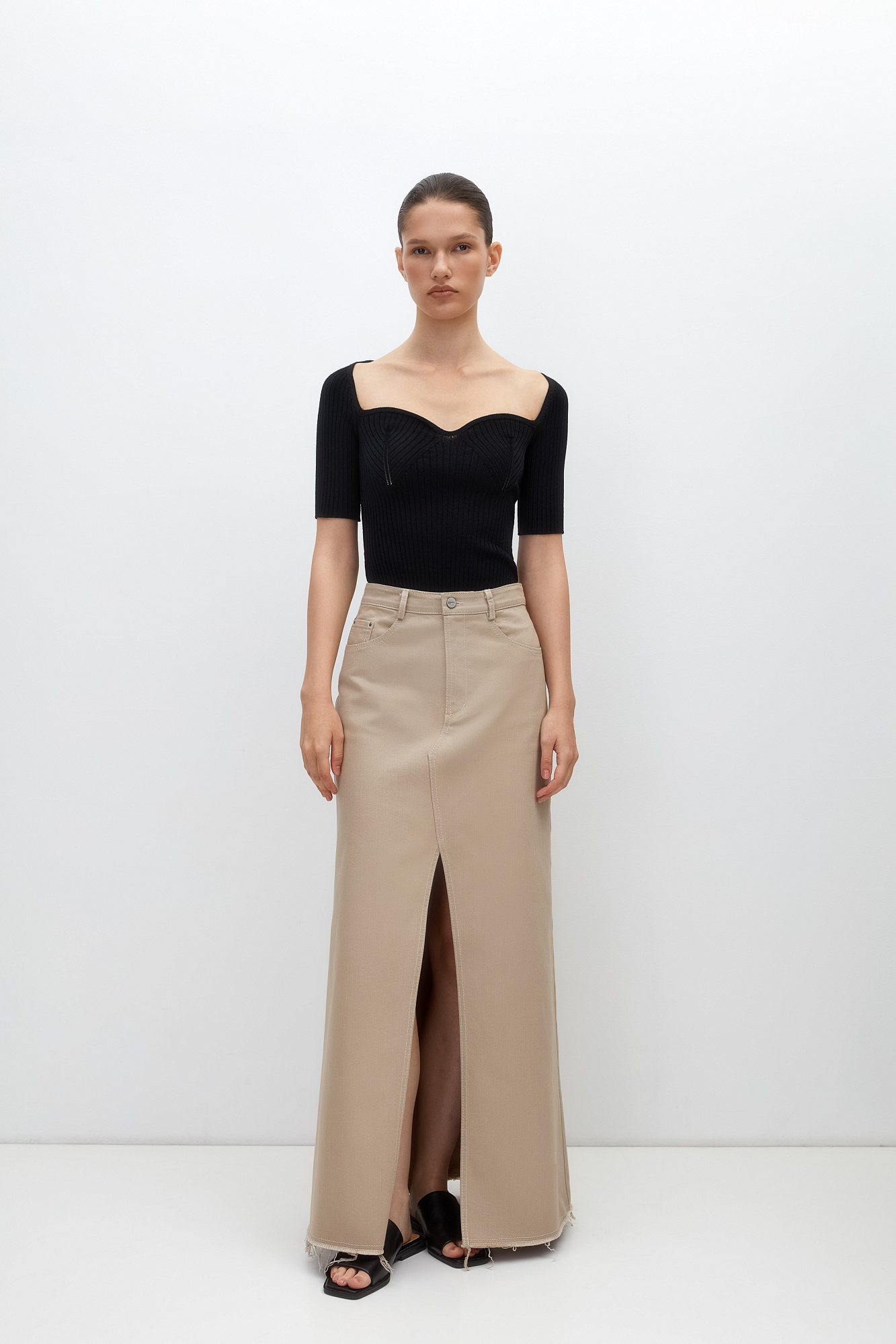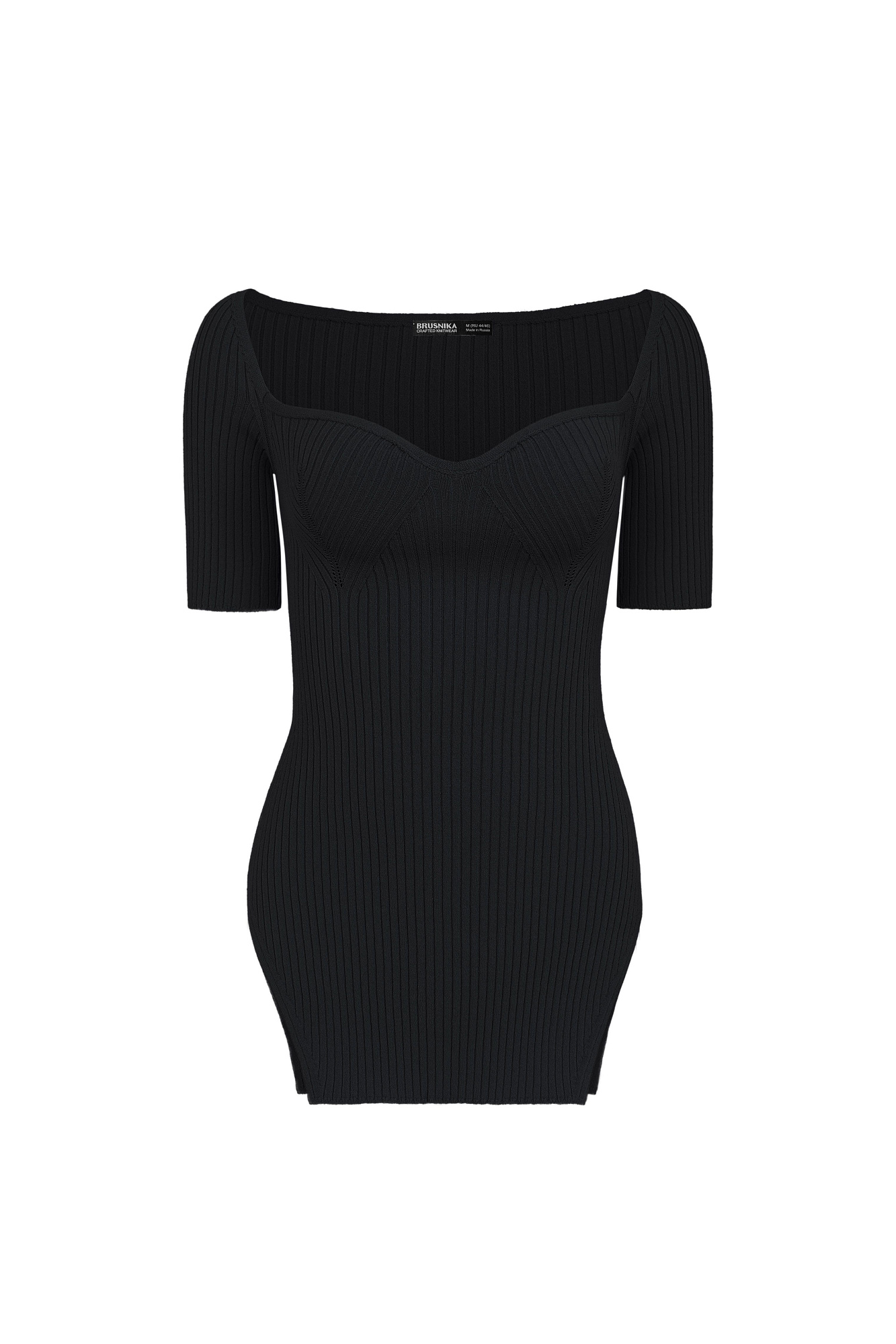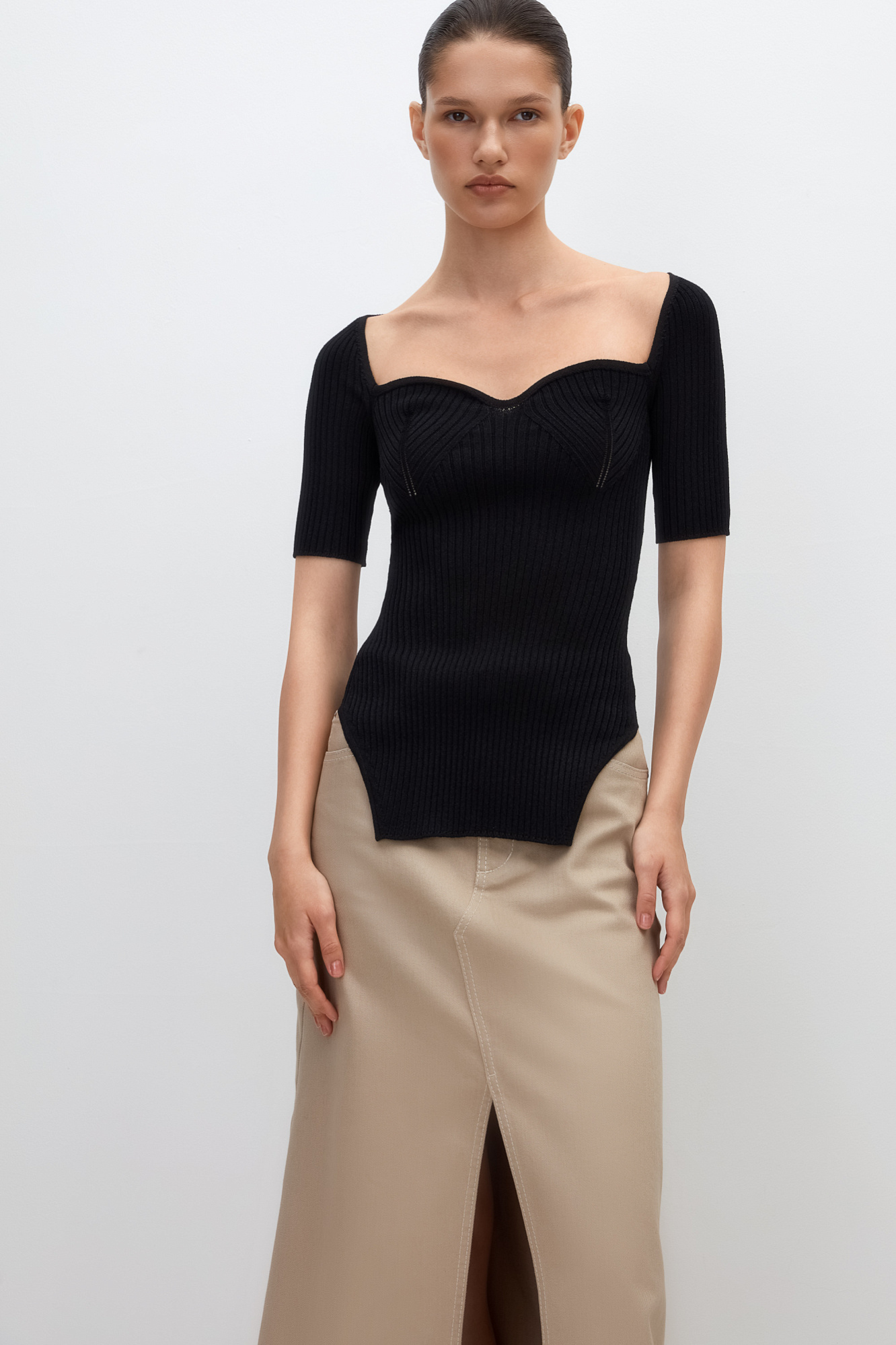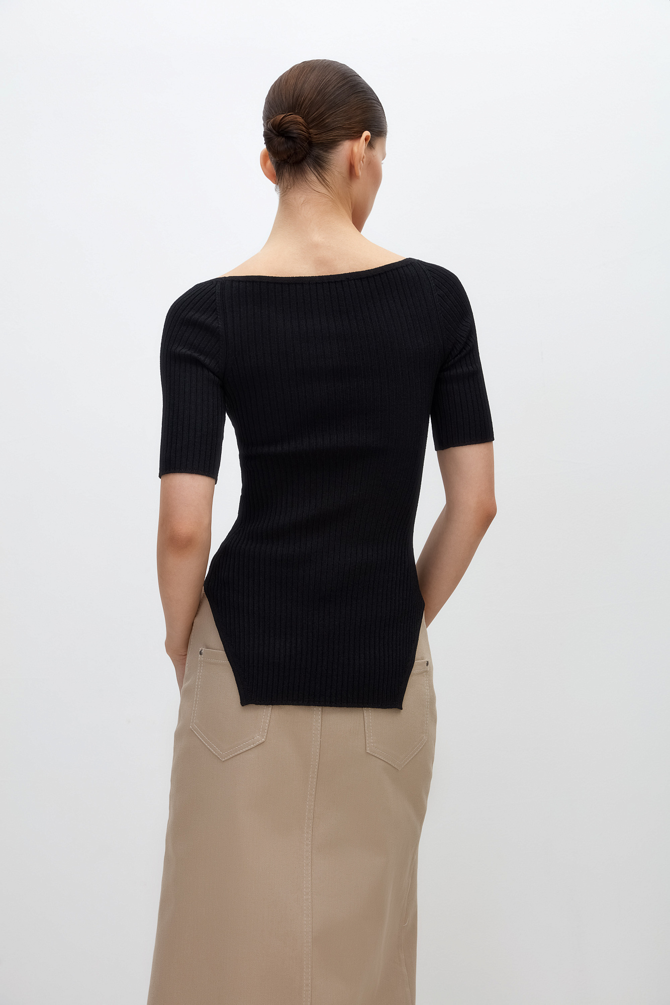Трикотажный удлиненный топ из вискозы. Модель с вывязанным декольте и короткими рукавами.