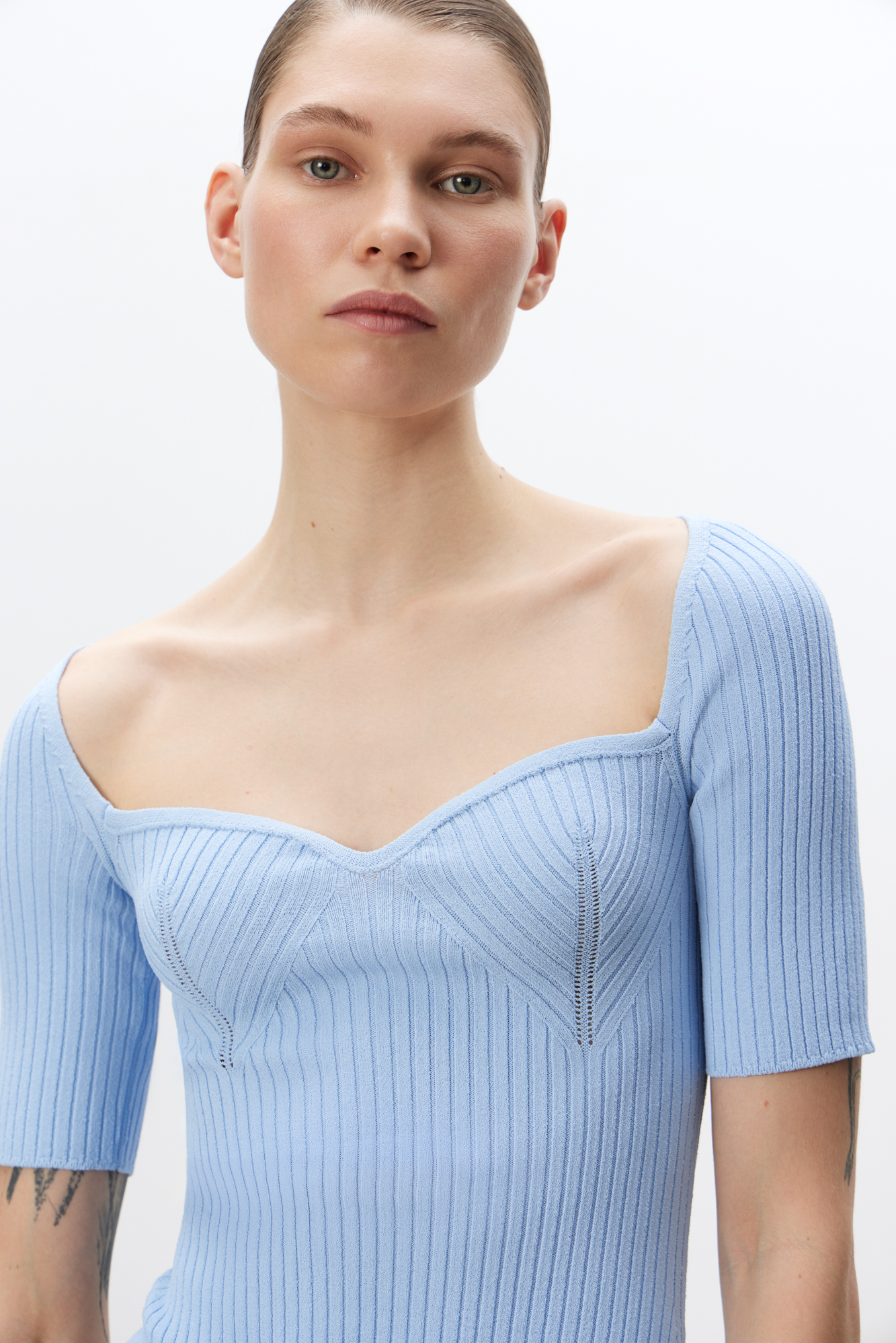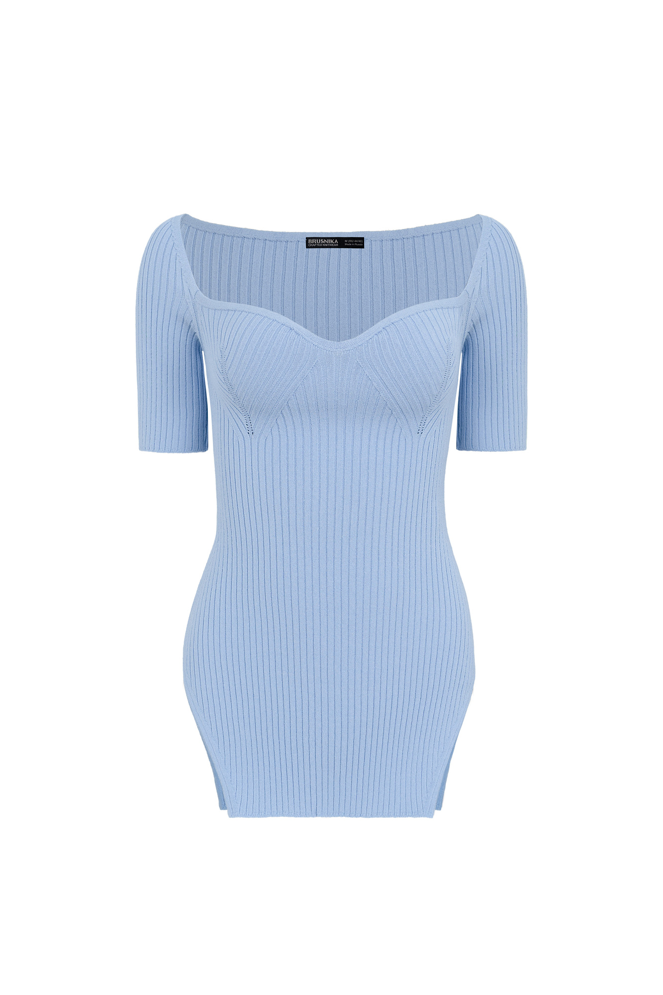 Трикотажный удлиненный топ из вискозы. Модель с вывязанным декольте и короткими рукавами.