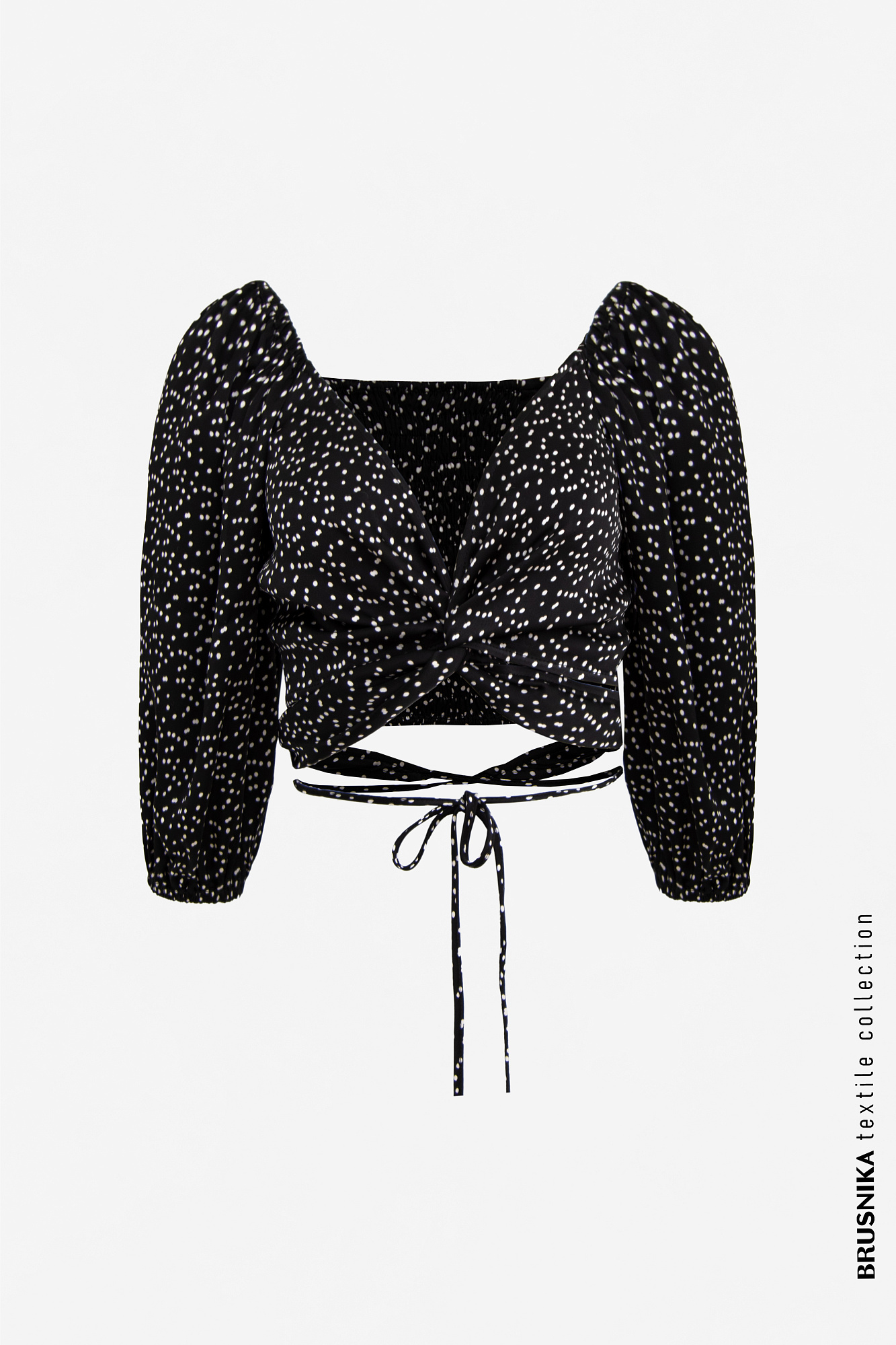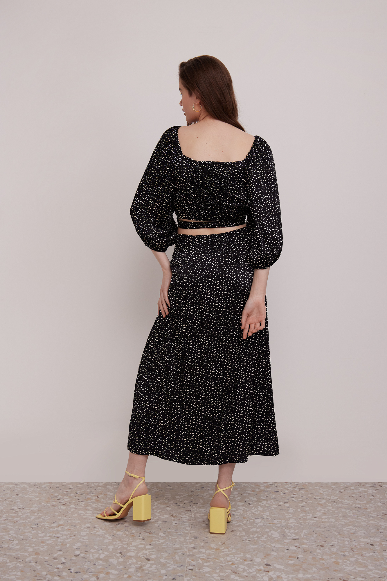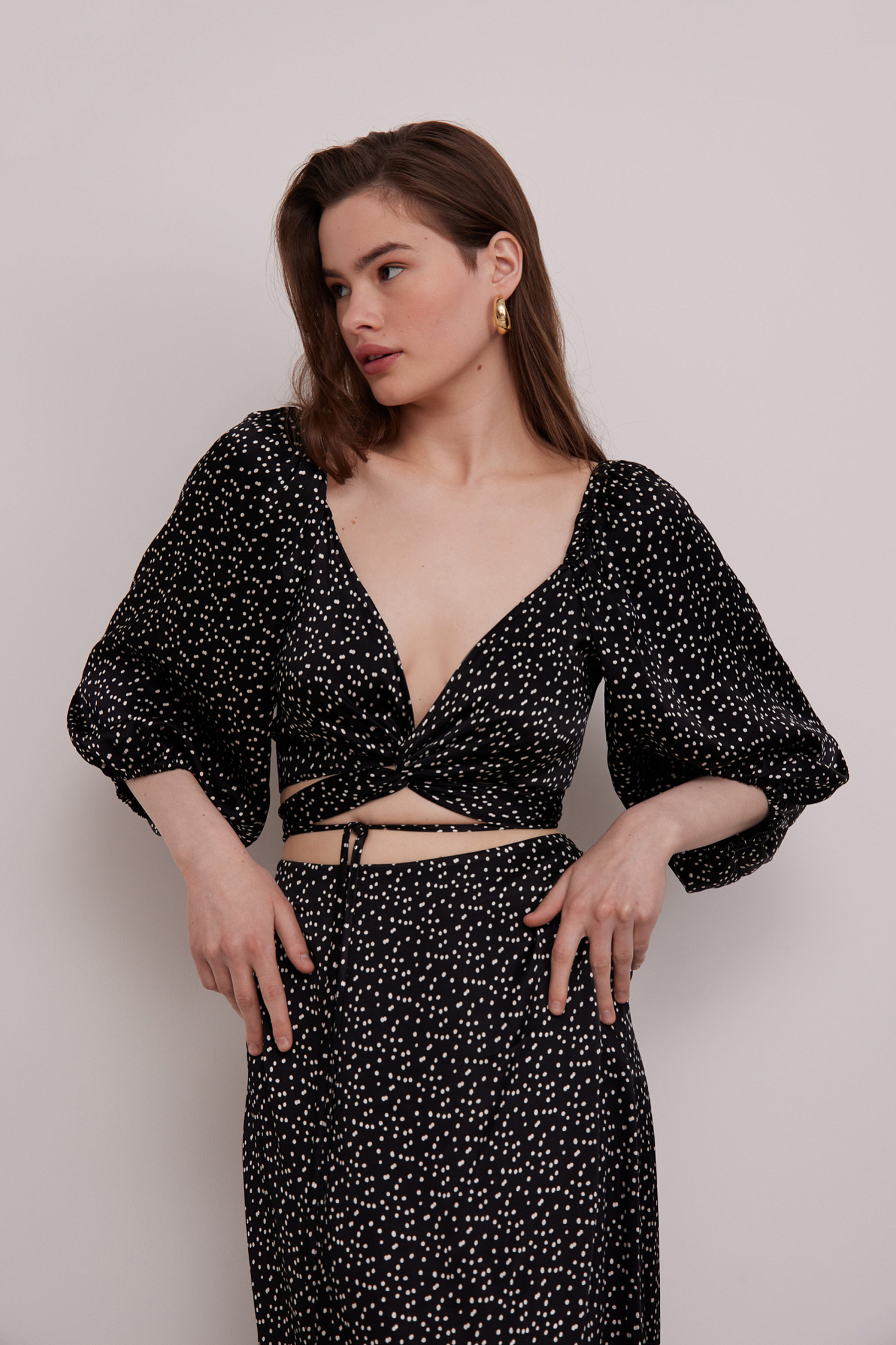 Атласный топ в горошек из 100% вискозы с открытым декольте и длинными рукавами.