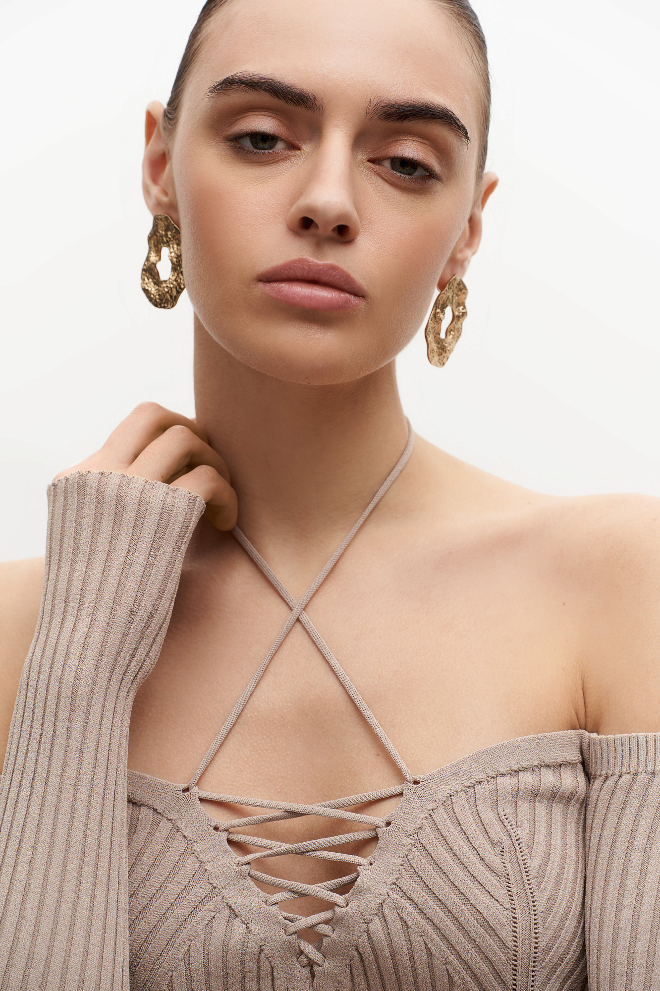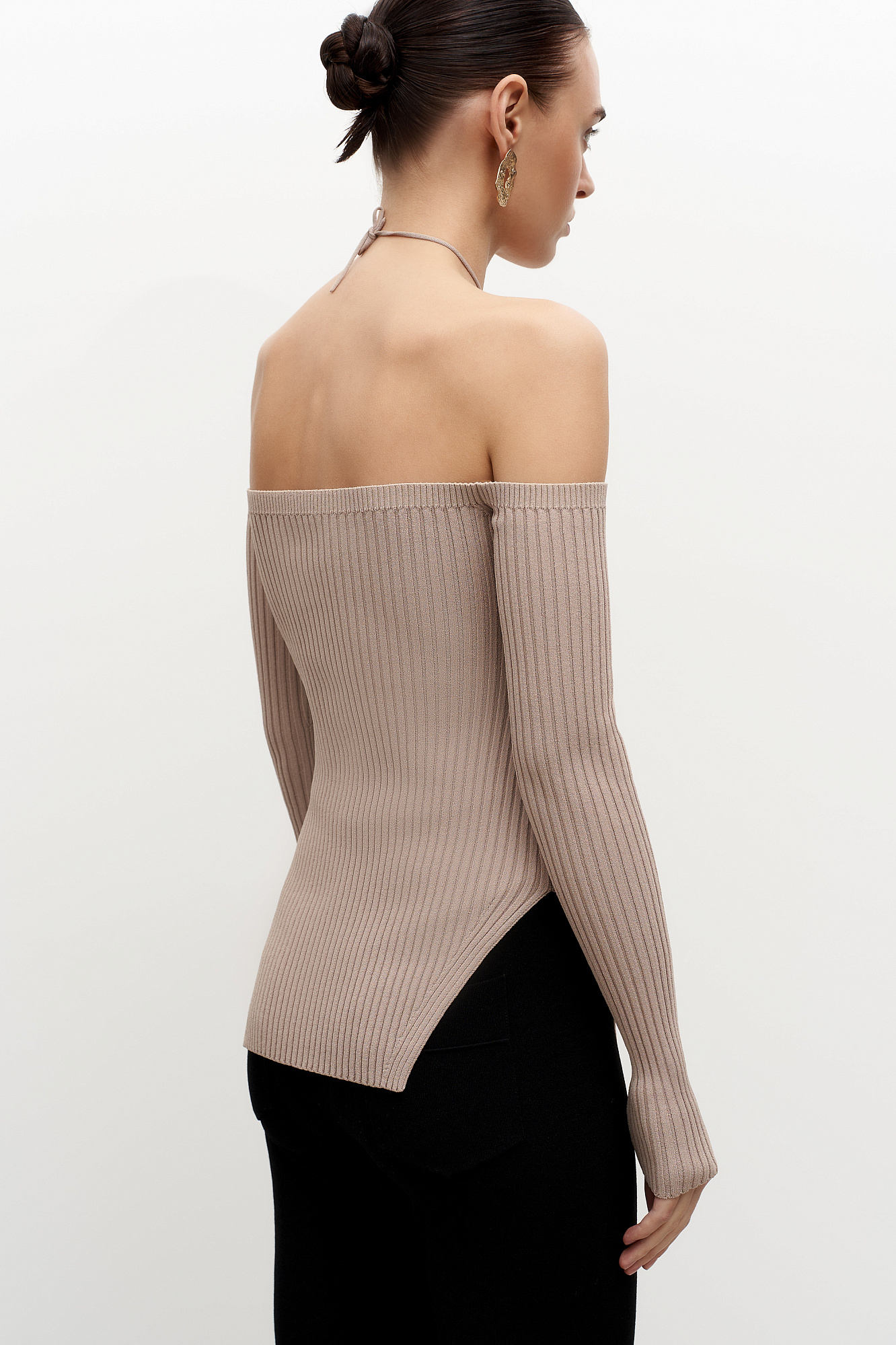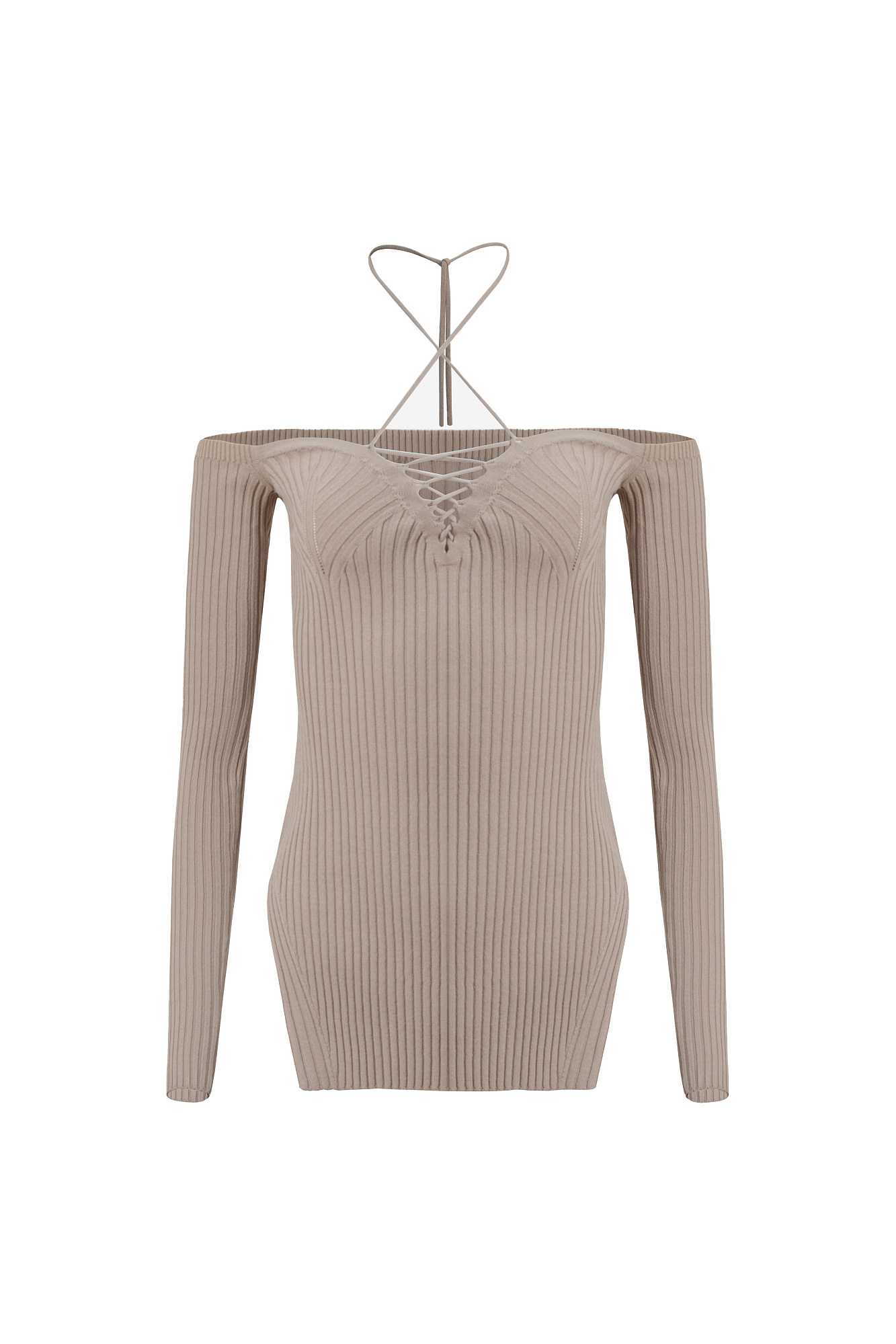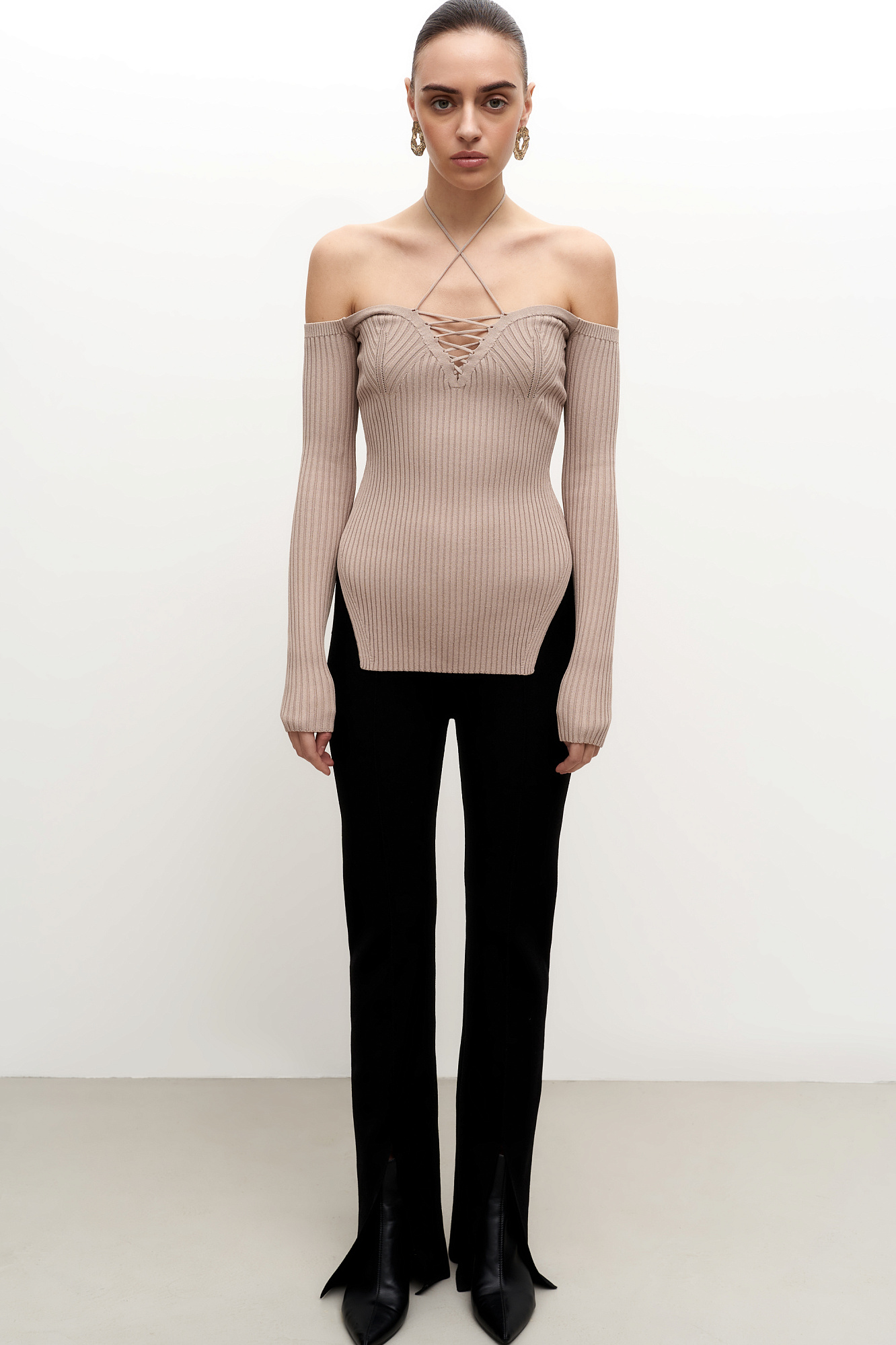 Трикотажные топ из вискозы. Модель с длинными рукавами, разрезами по бокам и глубоким декольте со шнуровкой.