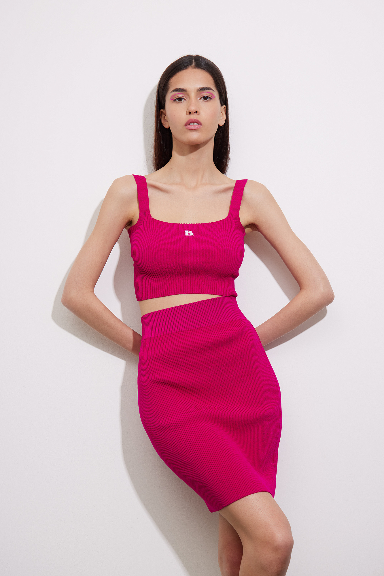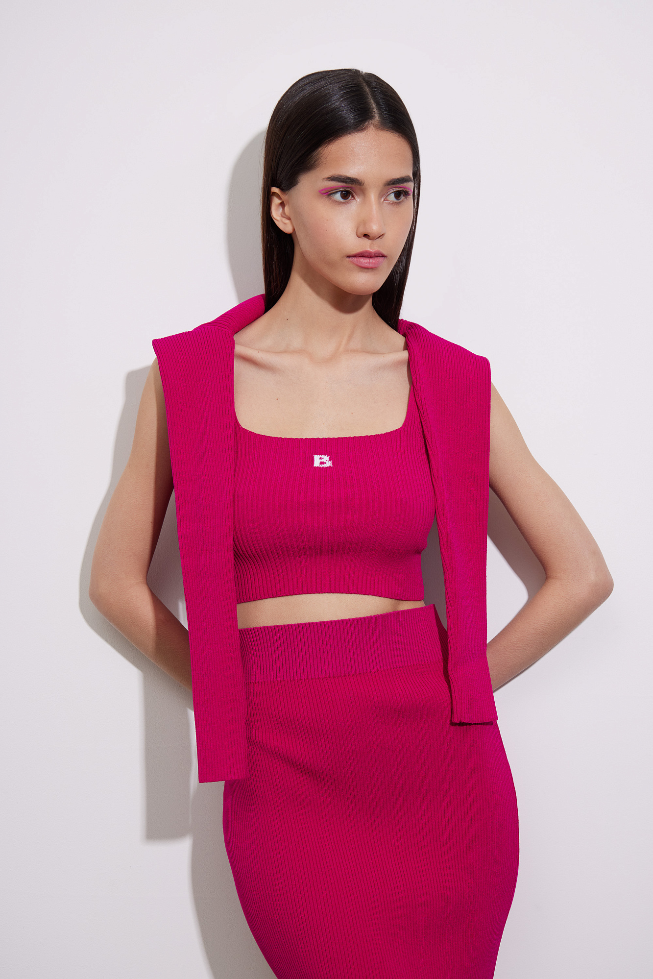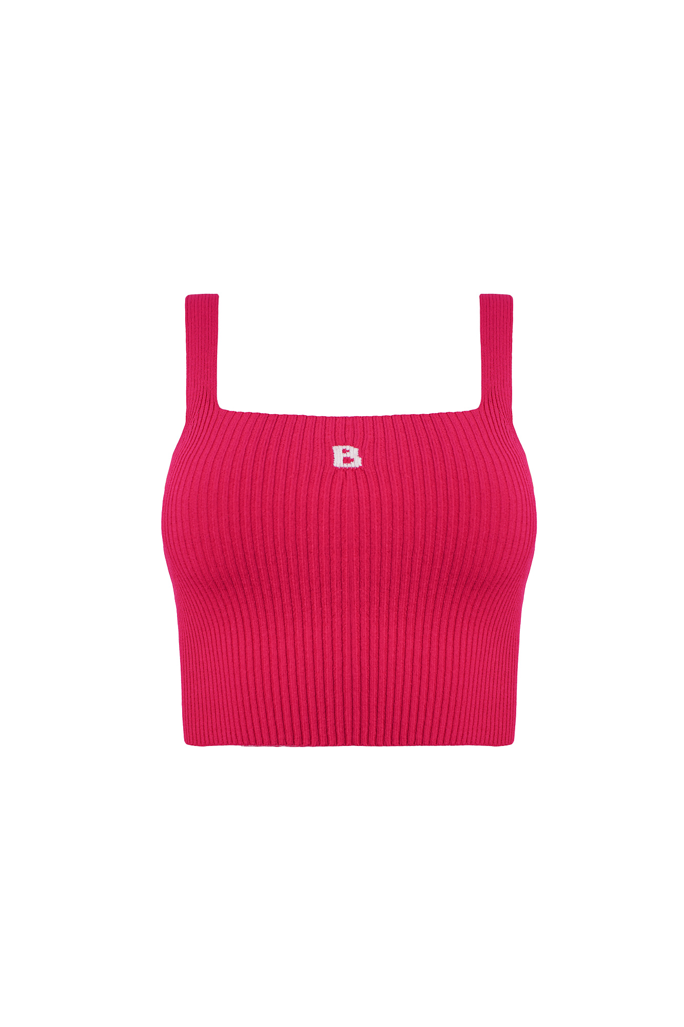 Облегающий короткий топ из вискозы. Модель на тонких бретельках с буквой "B" на груди.