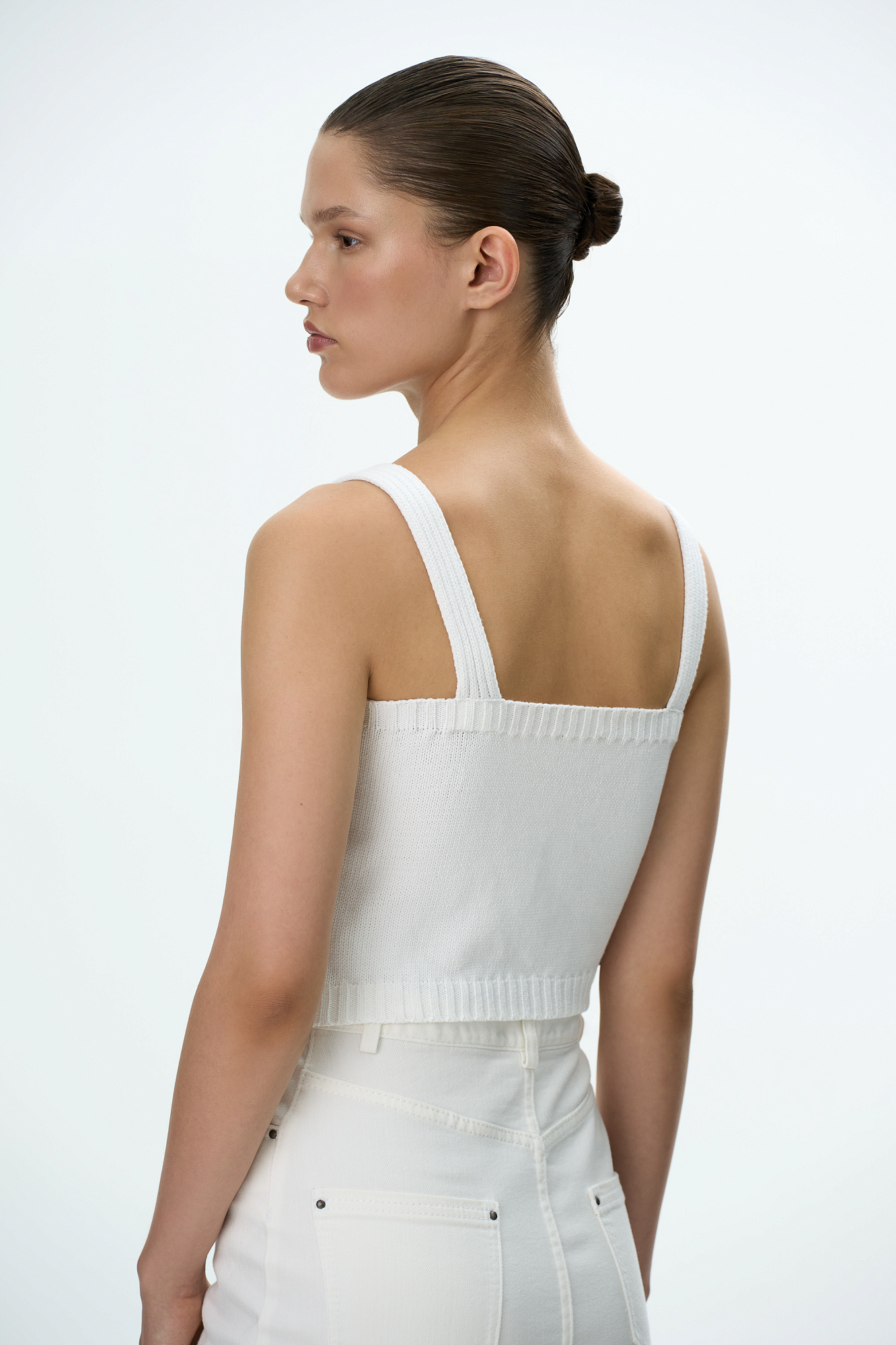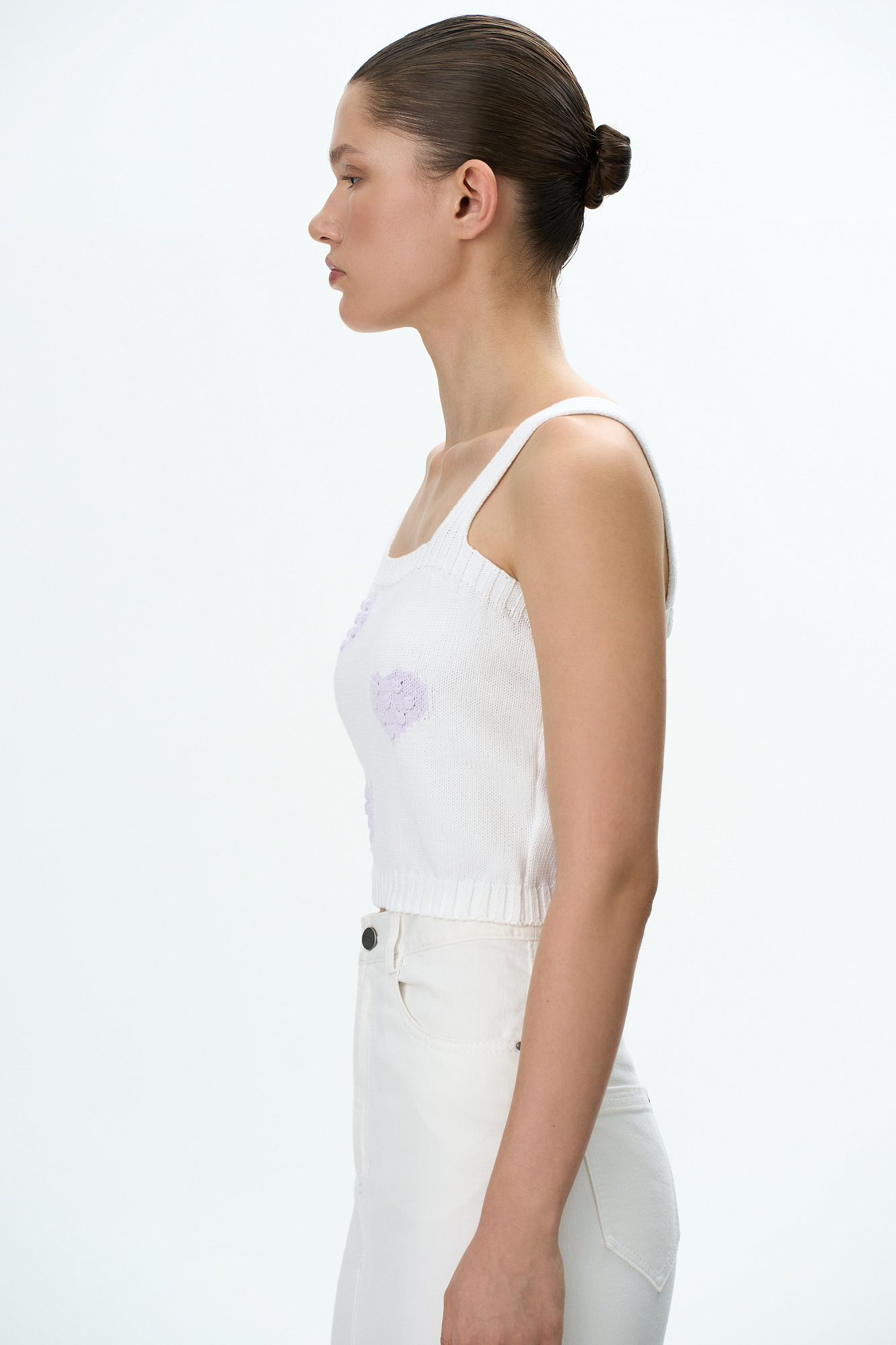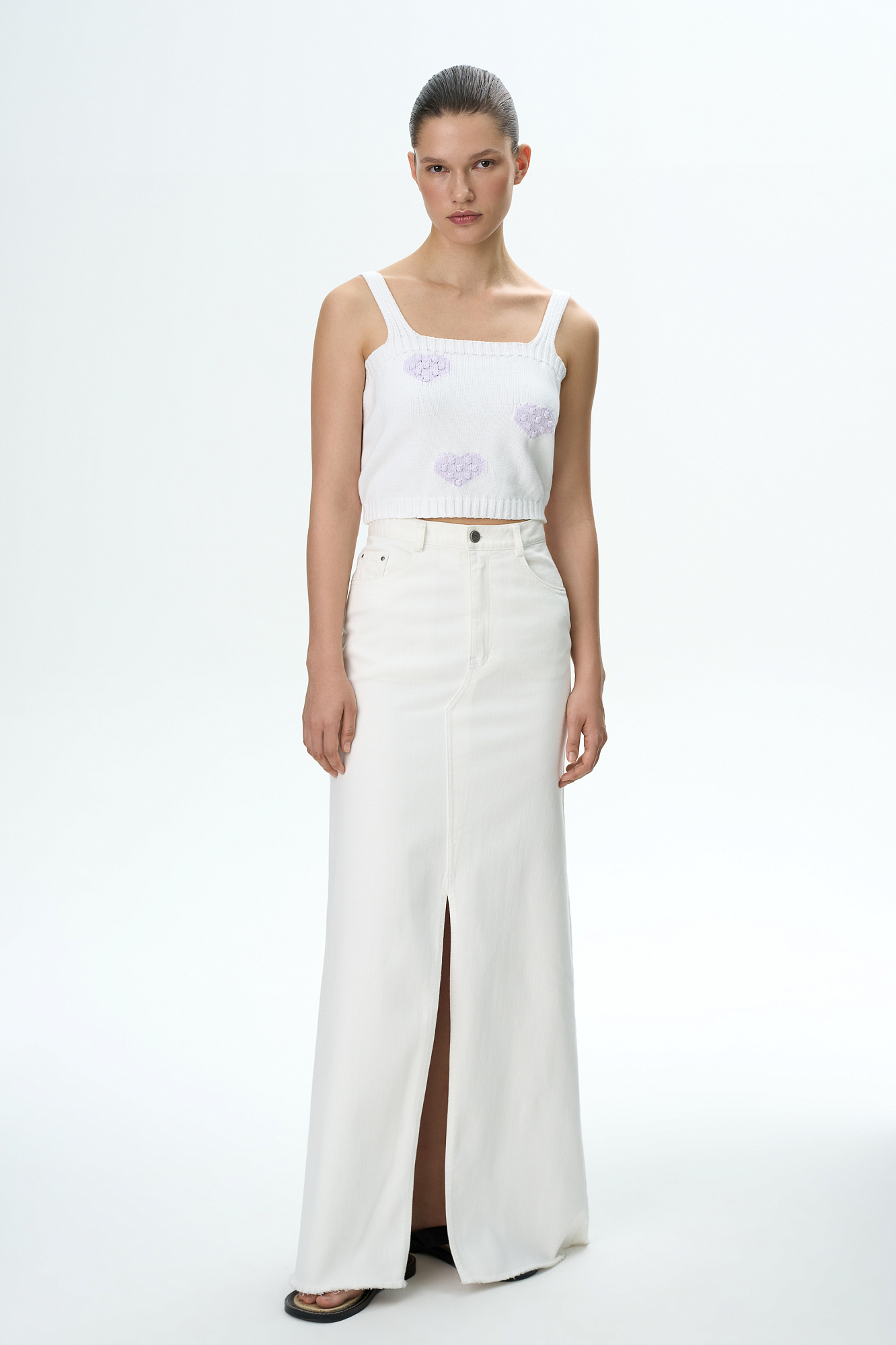 Трикотажный топ из хлопка с фактурными сердцами на бретелях. Края изделия в рубчик.