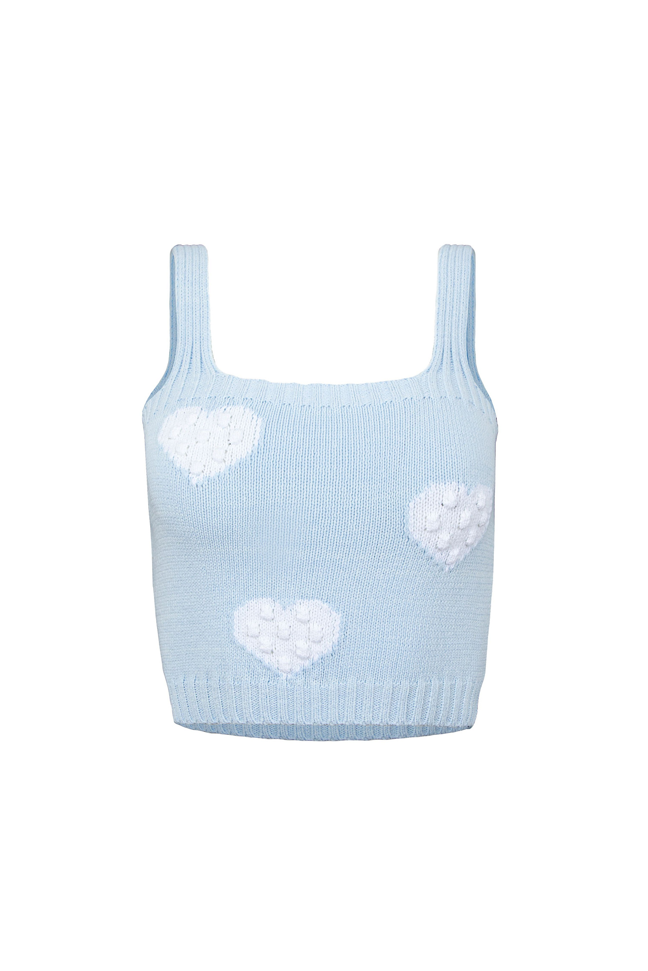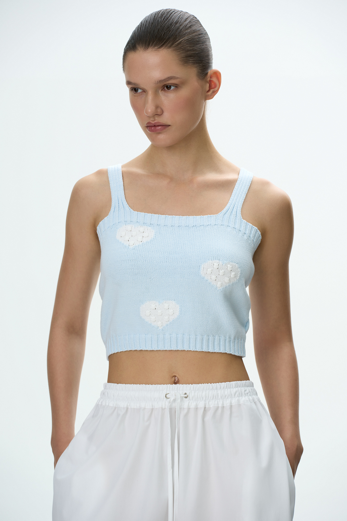 Трикотажный топ из хлопка с фактурными сердцами на бретелях. Края изделия в рубчик.