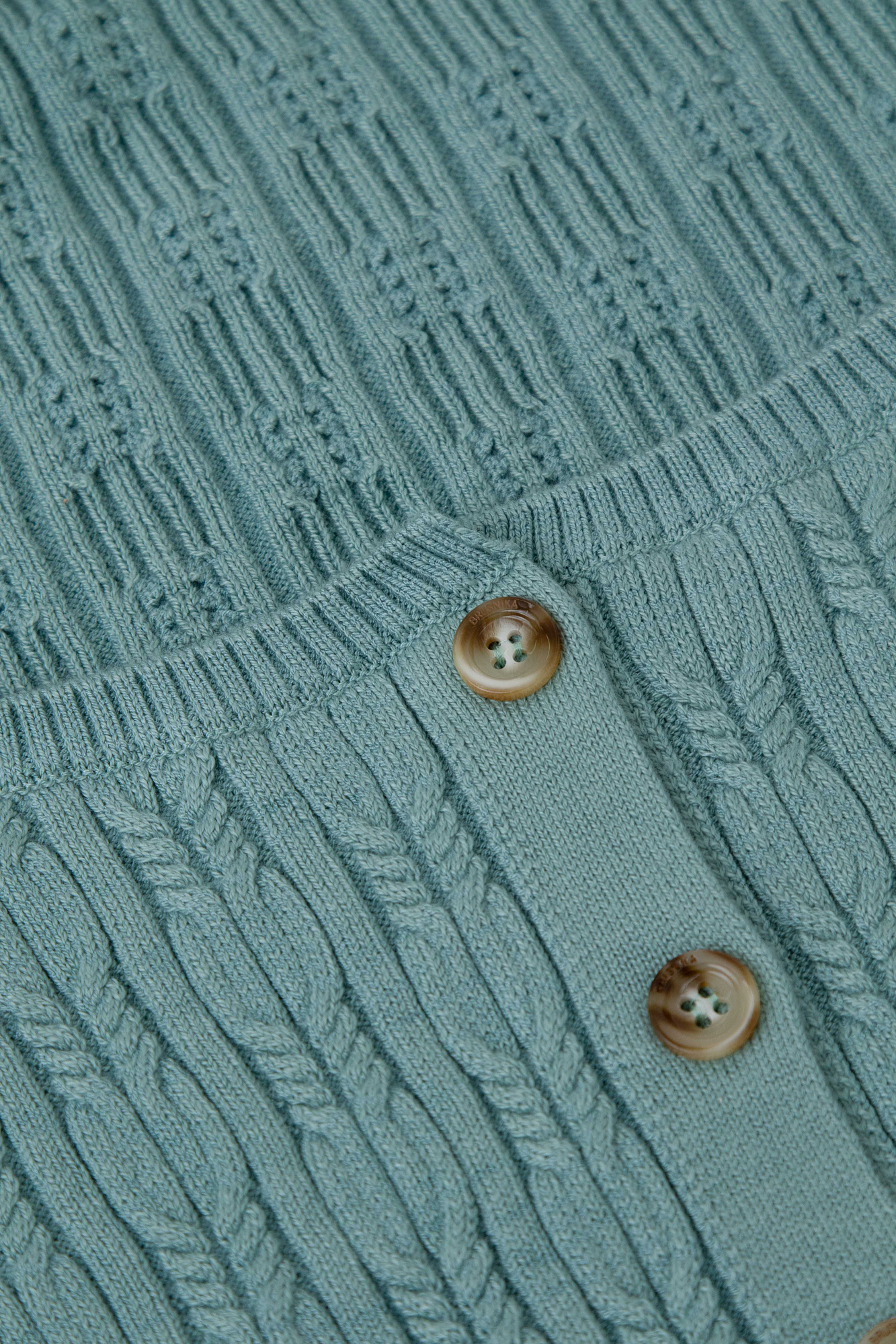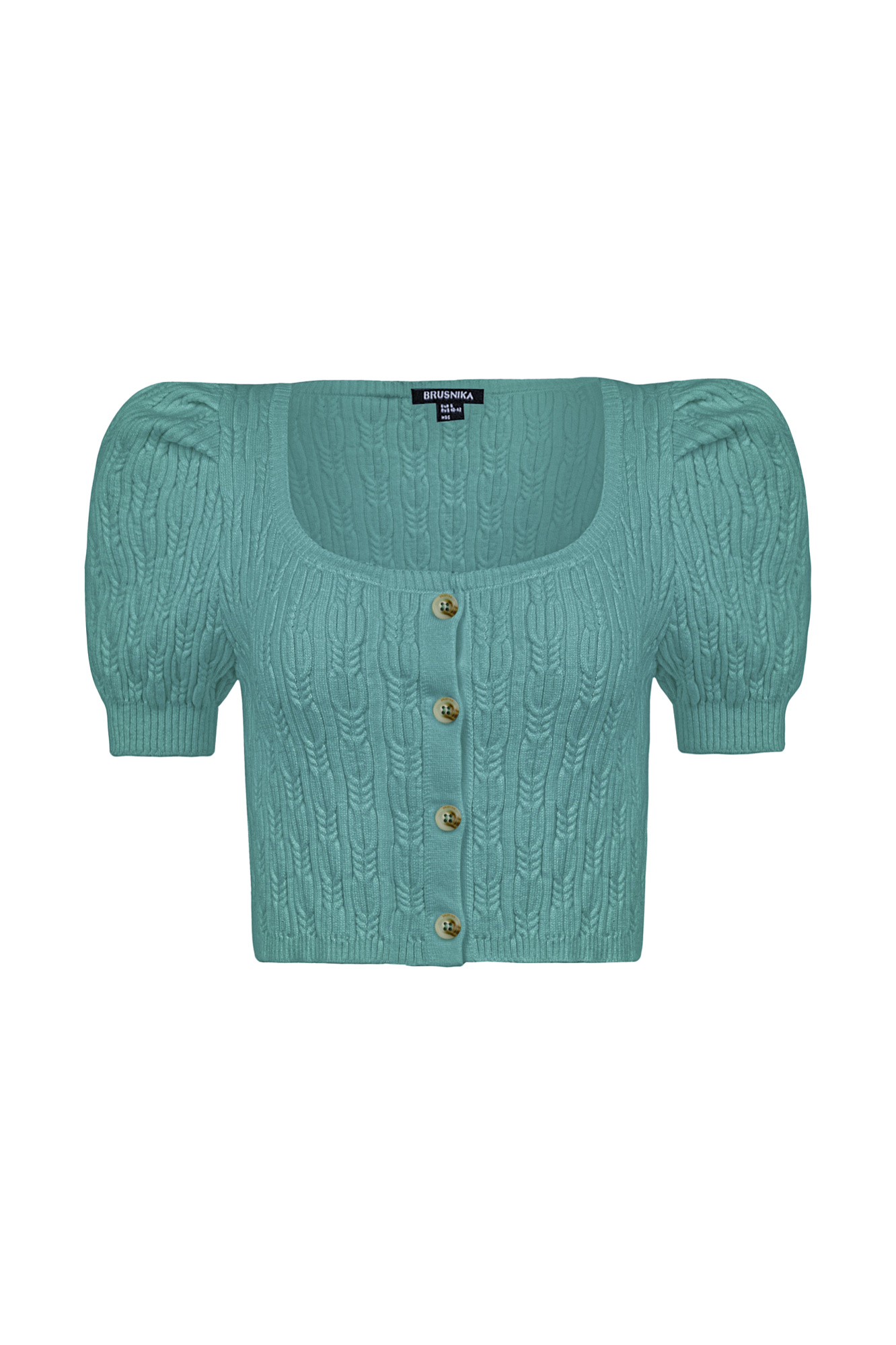 Трикотажный топ из хлопка с добавлением вискозы. Короткие рукава-фонарики и застежка на пуговицах.