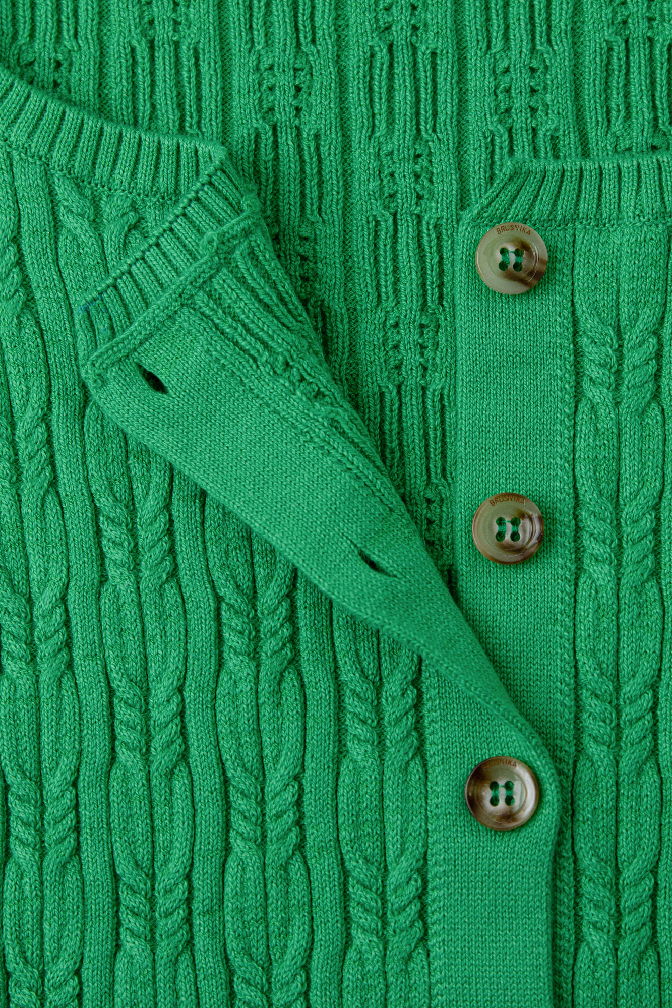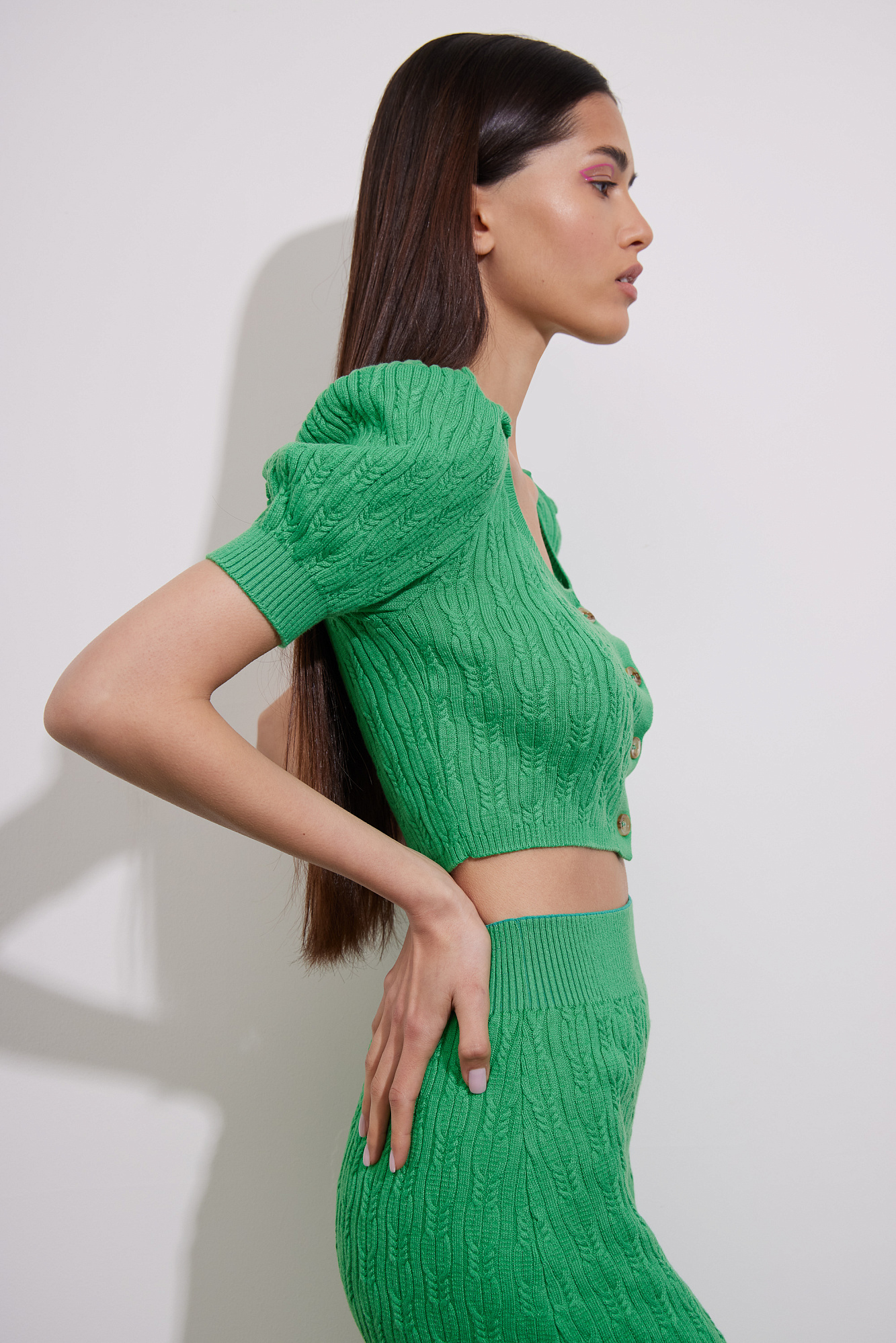 Трикотажный топ из хлопка с добавлением вискозы. Короткие рукава-фонарики и застежка на пуговицах.