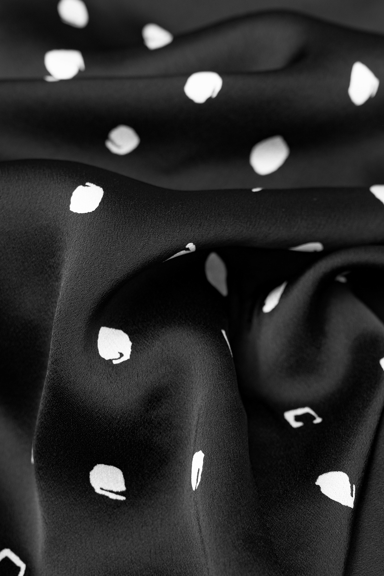 Атласный топ из 100% вискозы в горошек, с рукавами-фонариками и кулиской. Дополнить образ можно брюками в таком же стиле.