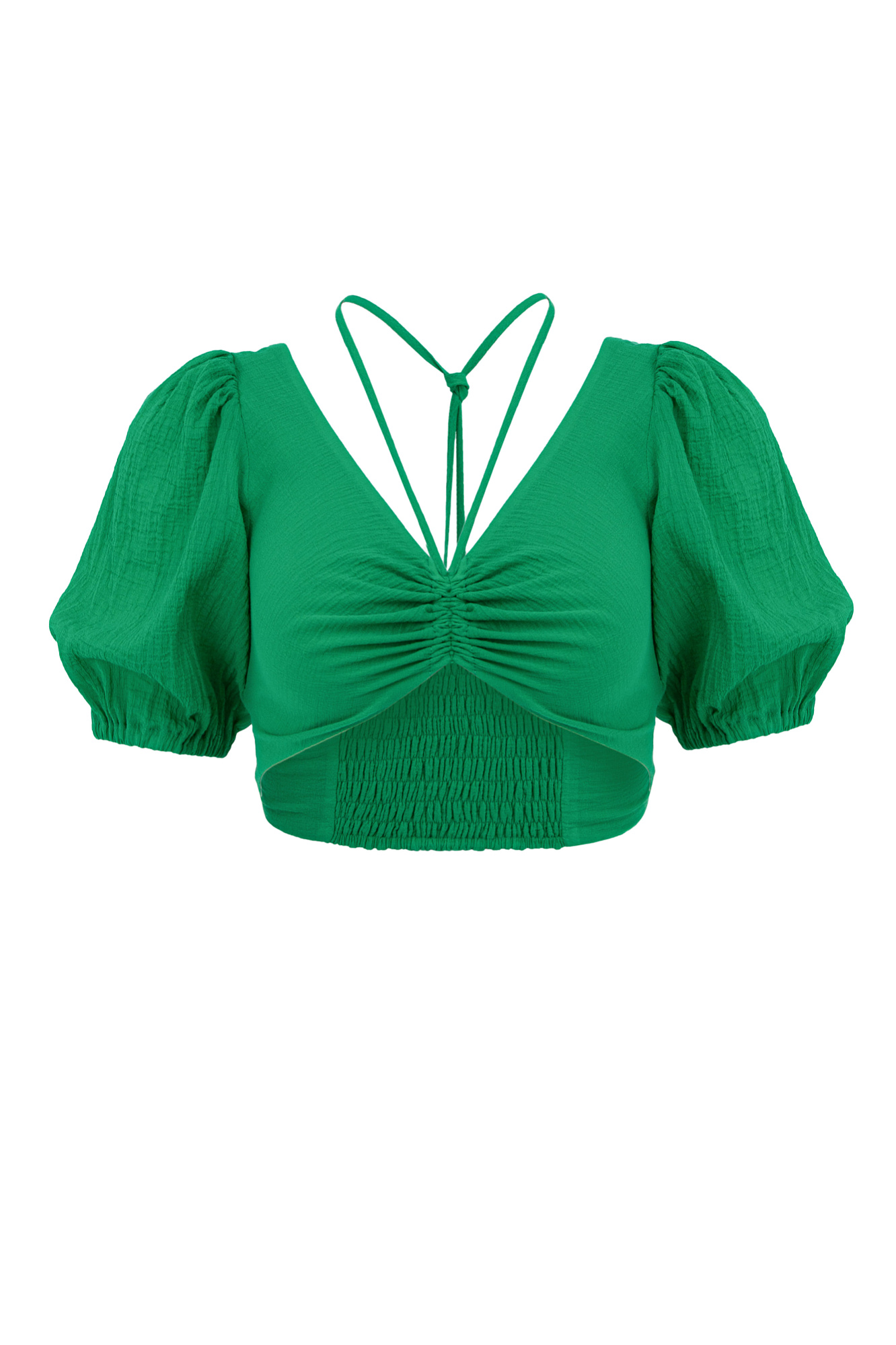 Короткий топ из 100% хлопка на тонкой кулиске вокруг шеи.
