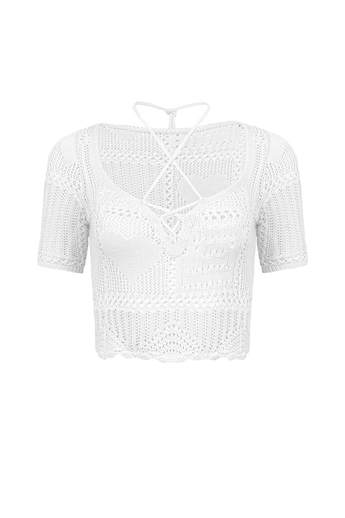 Короткий ажурный топ в стиле пэчворк. Модель с коротким рукавом, круглым вырезом горловины и кулиской.