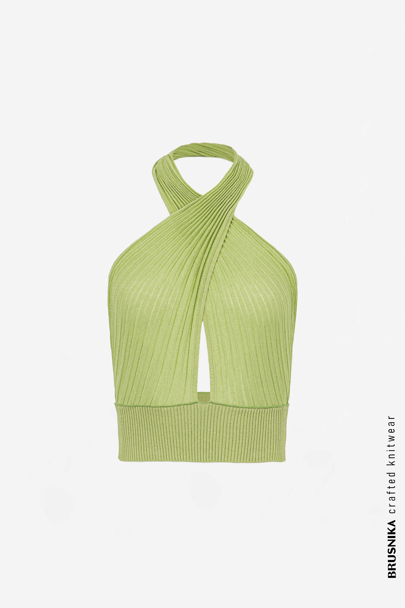 Трикотажный топ из вискозы, главная особенность — перекрещенные детали лифа, которые подчеркивают линию плеч