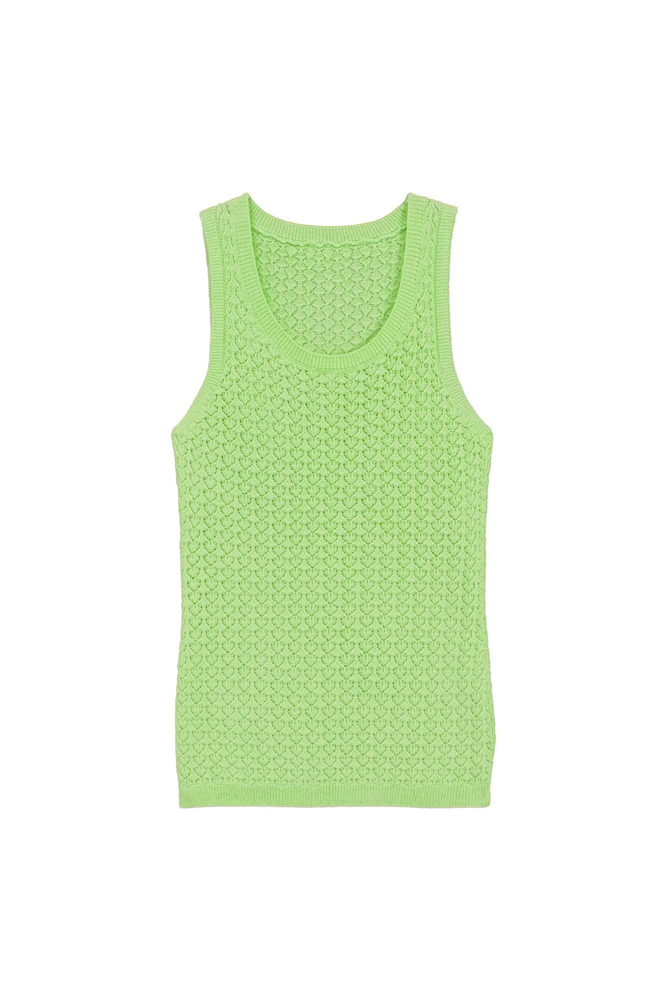 Трикотажный ажурный топ из вискозы с вывязанным орнаментом сердечками. Модель приталенного силуэта, с круглым вырезом горловины, без рукавов, на широких лямках. Края изделия выполнены в рубчик.