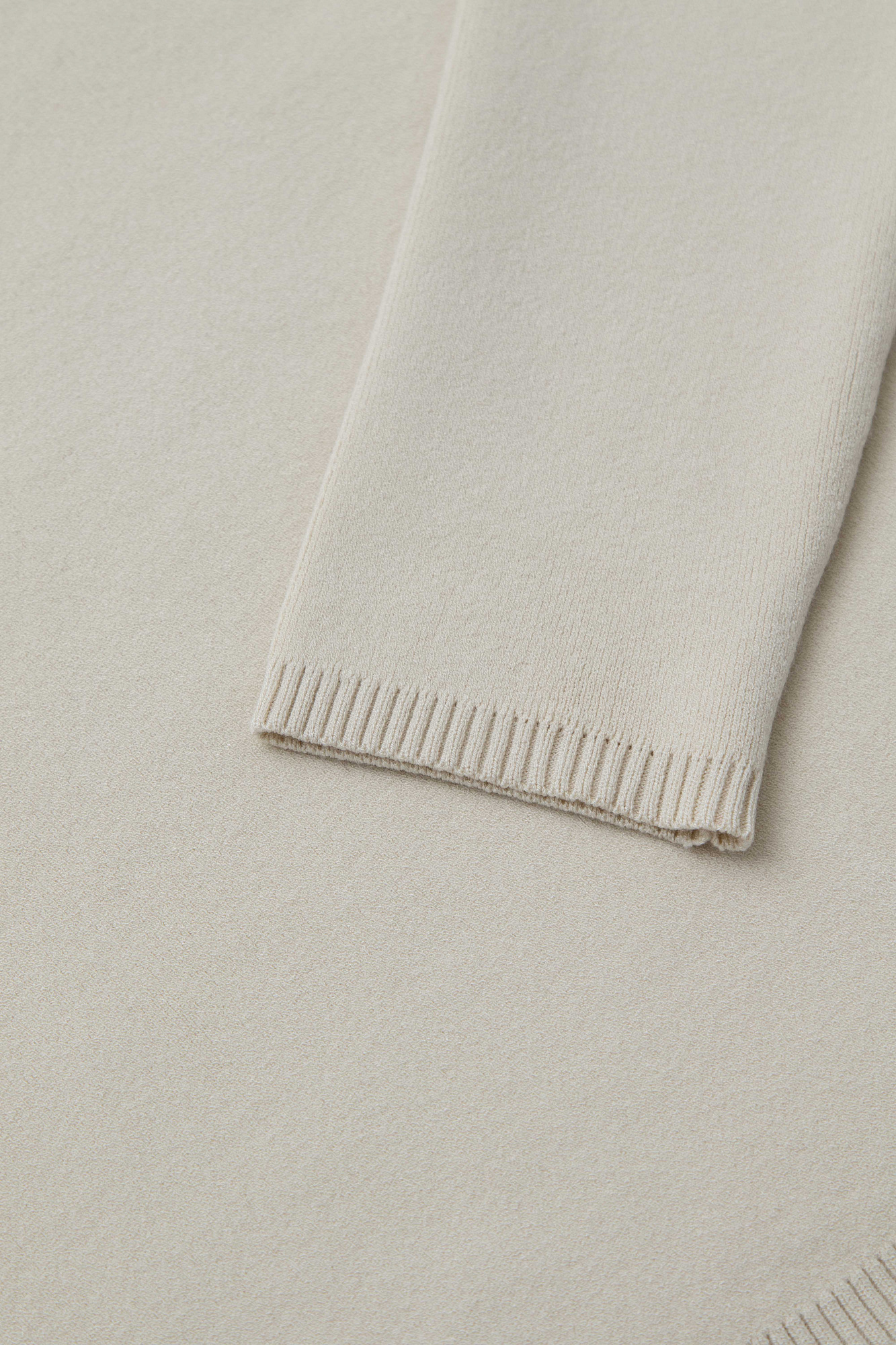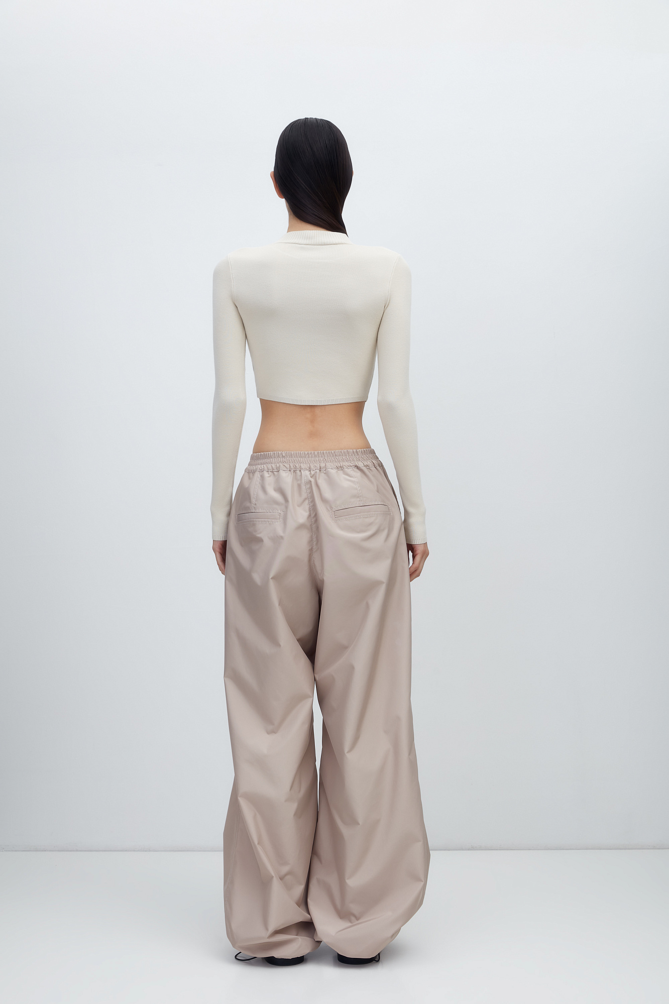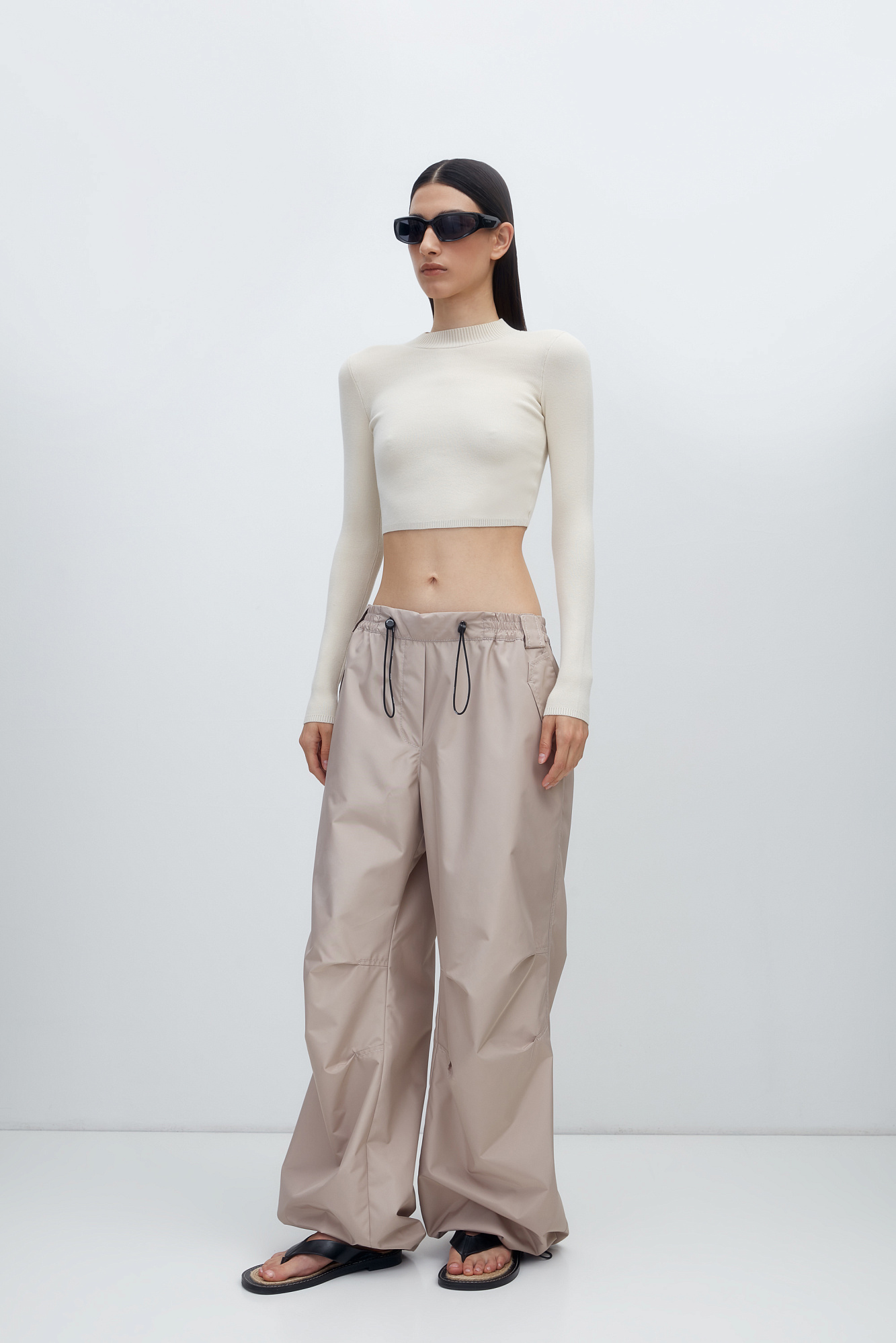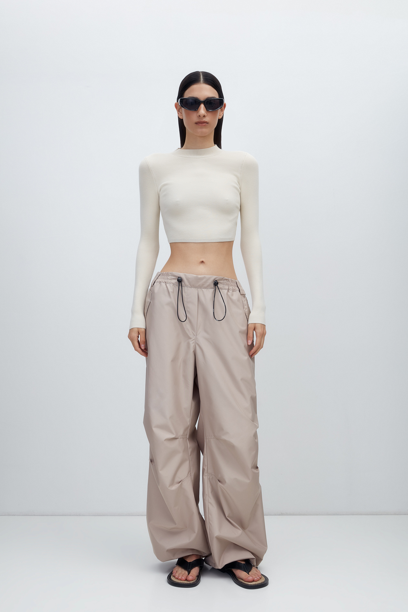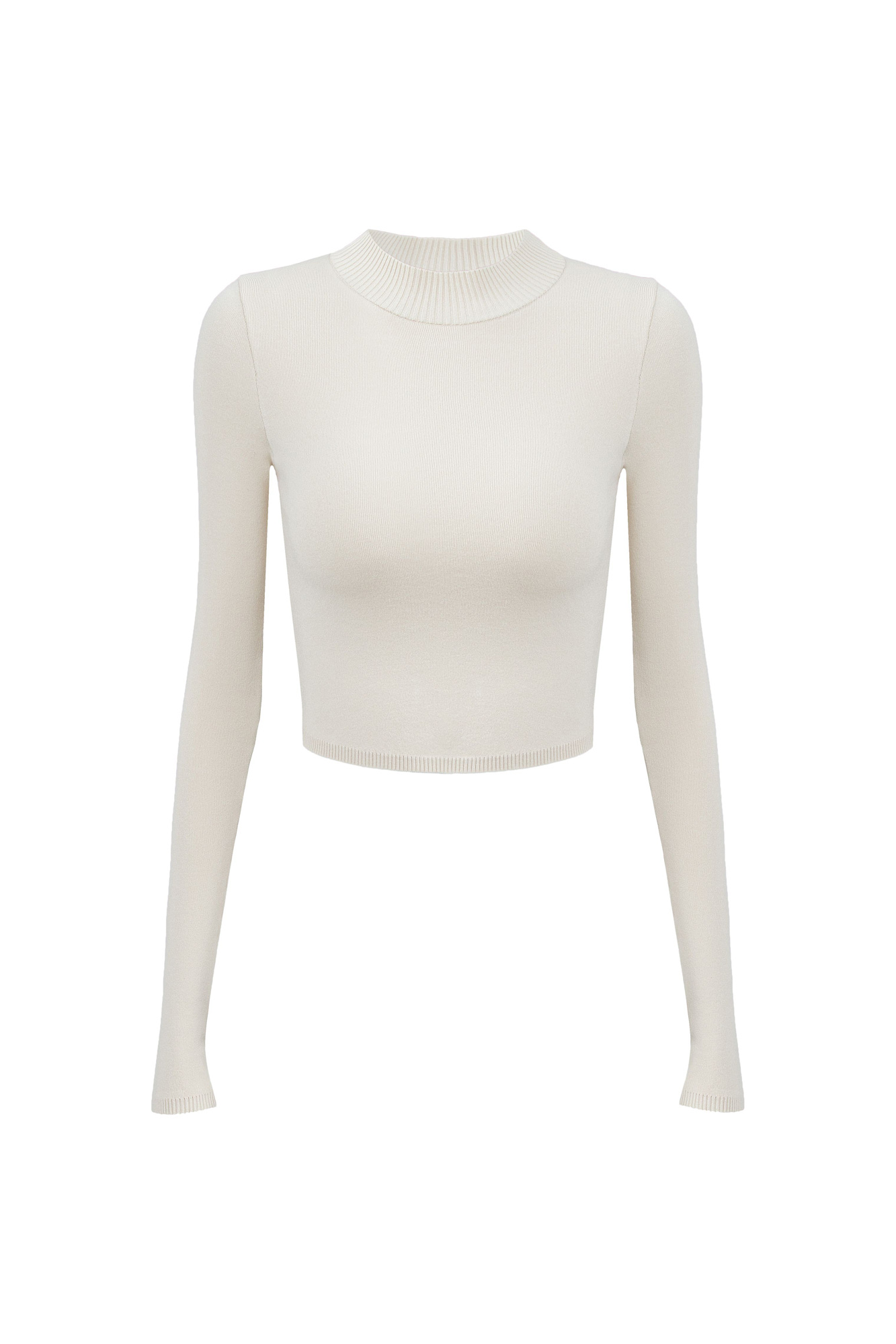 Трикотажный кроп-топ из вискозы с длинным рукавом, круглым вырезом горловины и фигурным низом. Края изделия выполнены в рубчик.