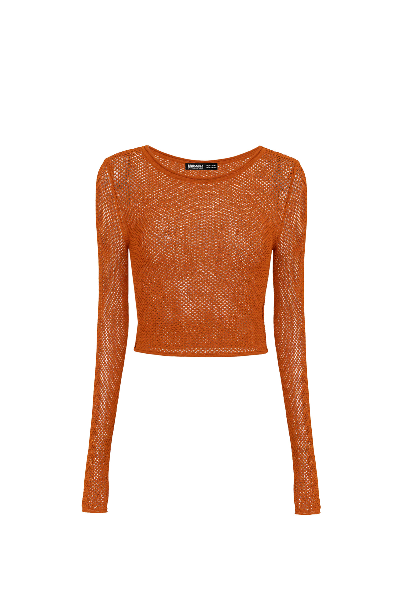 Трикотажный топ из вискозы. Модель прямого силуэта, с длинными рукавами и круглым вырезом горловины. Изделие выполнено ажурной вязкой.