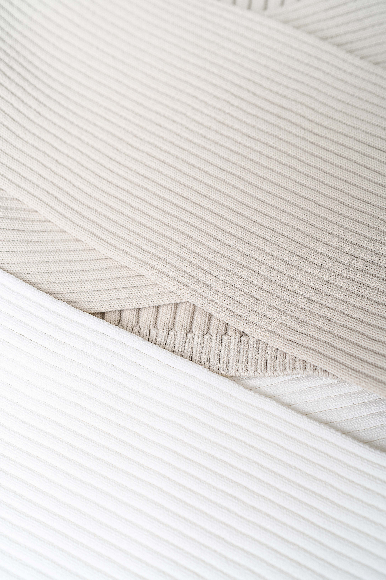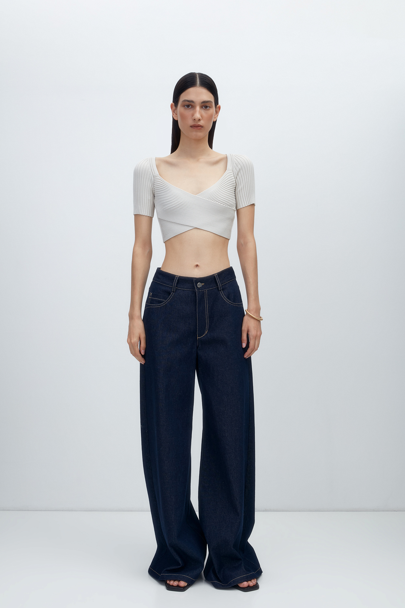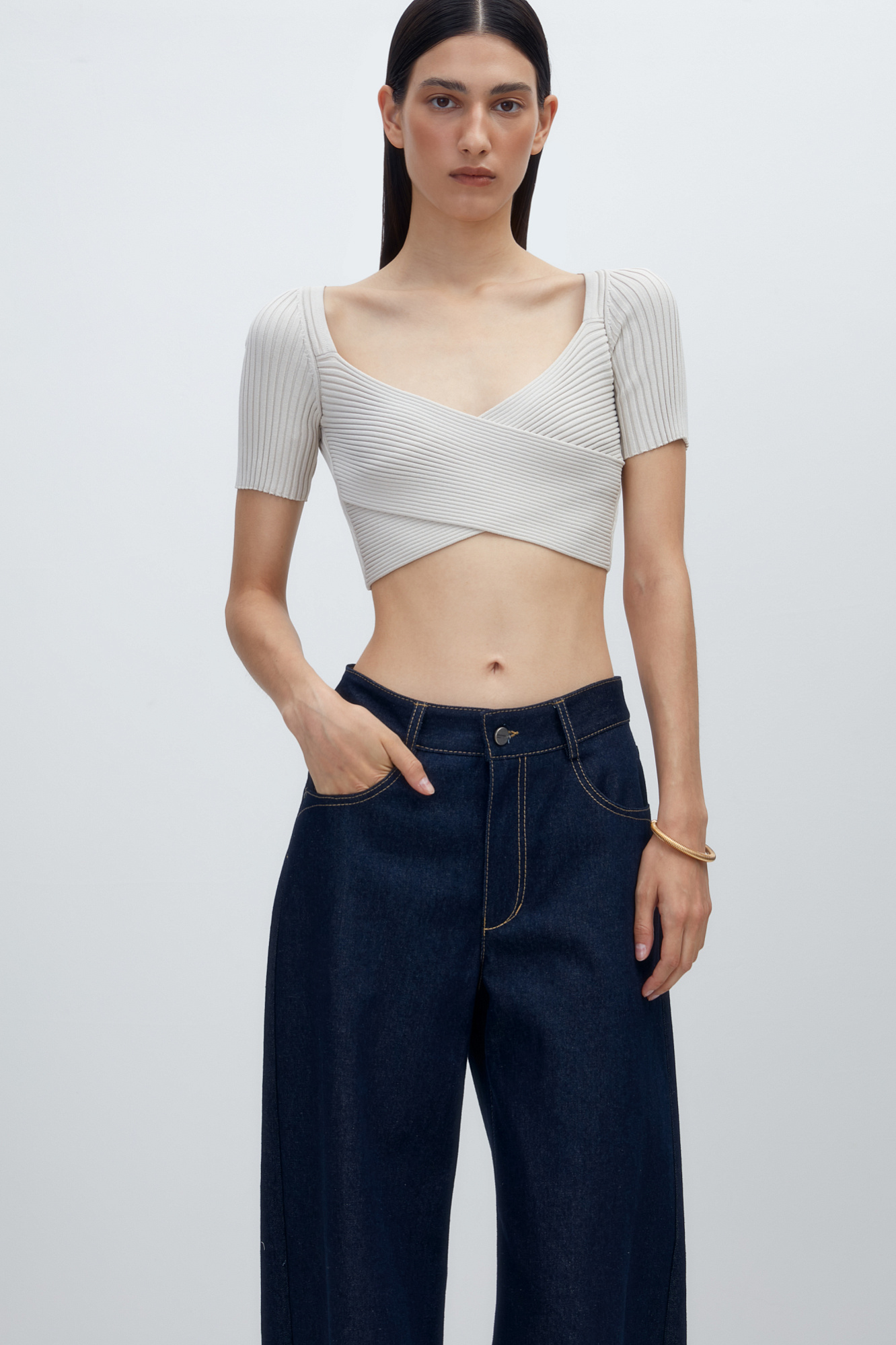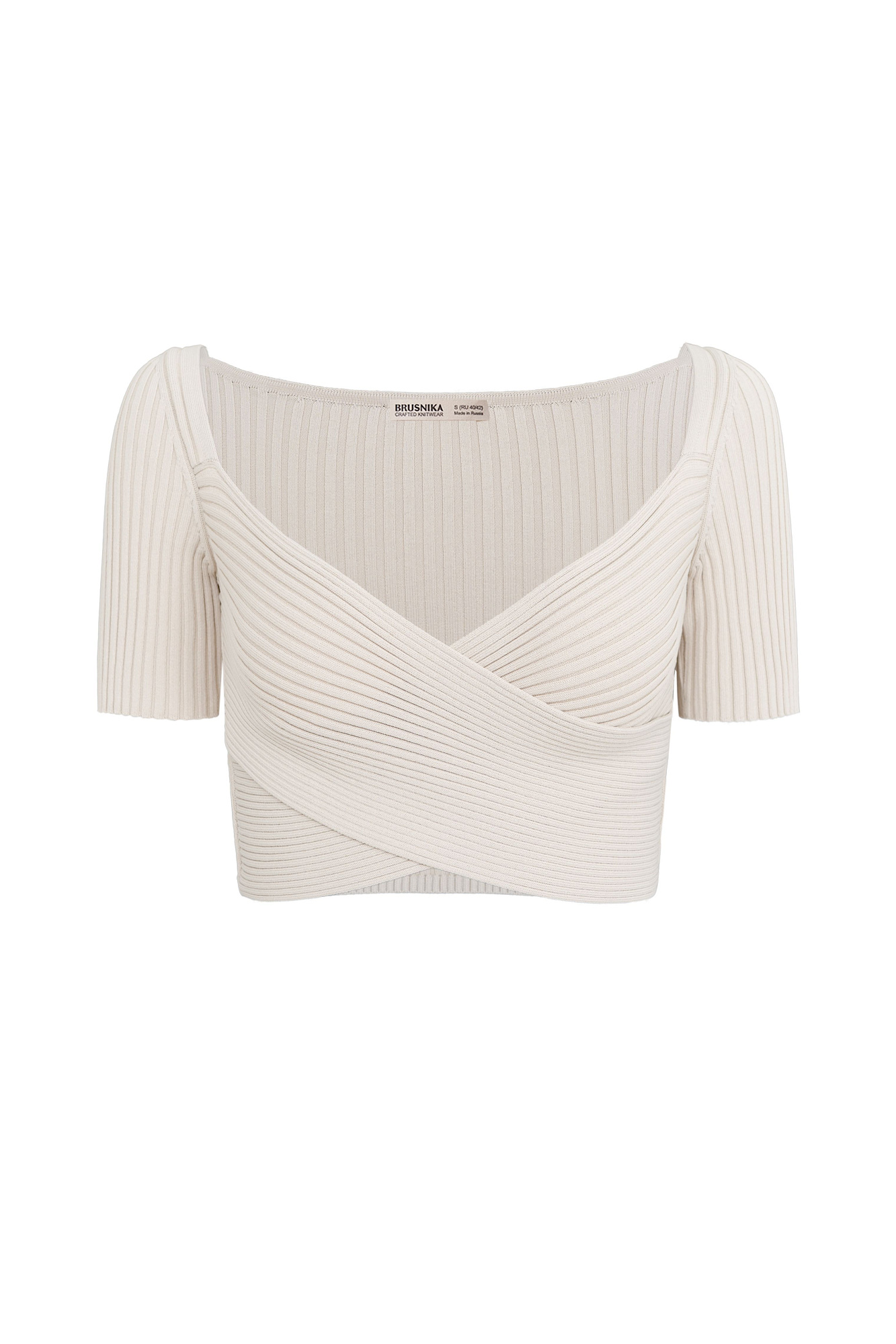 Короткий трикотажный топ из вискозы. Модель приталенного силуэта, с коротким рукавом, глубоким вырезом и скрещенным лифом. Изделие выполнено в рубчик.