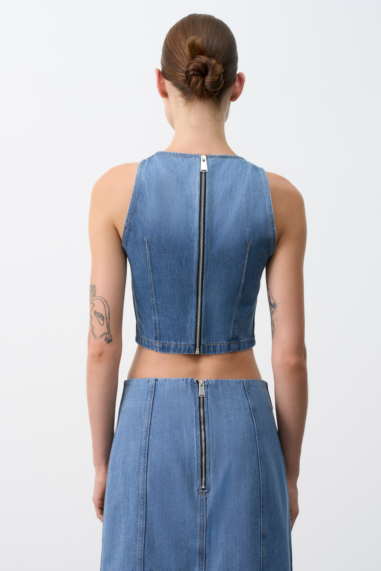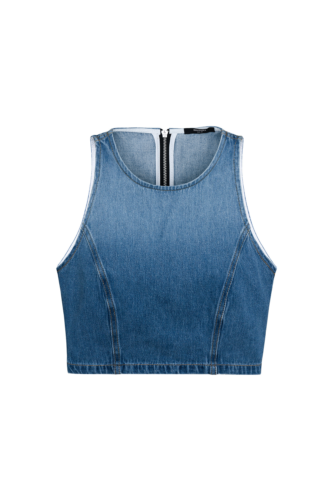 Джинсовый короткий топ из 100% хлопка. Модель приталенного силуэта, без рукавов, глубокой проймой и застежкой на молнию сзади. Цвет полотна изделия сменяется с темного на светлый, создавая градиент. Дополнить образ можно юбкой.
