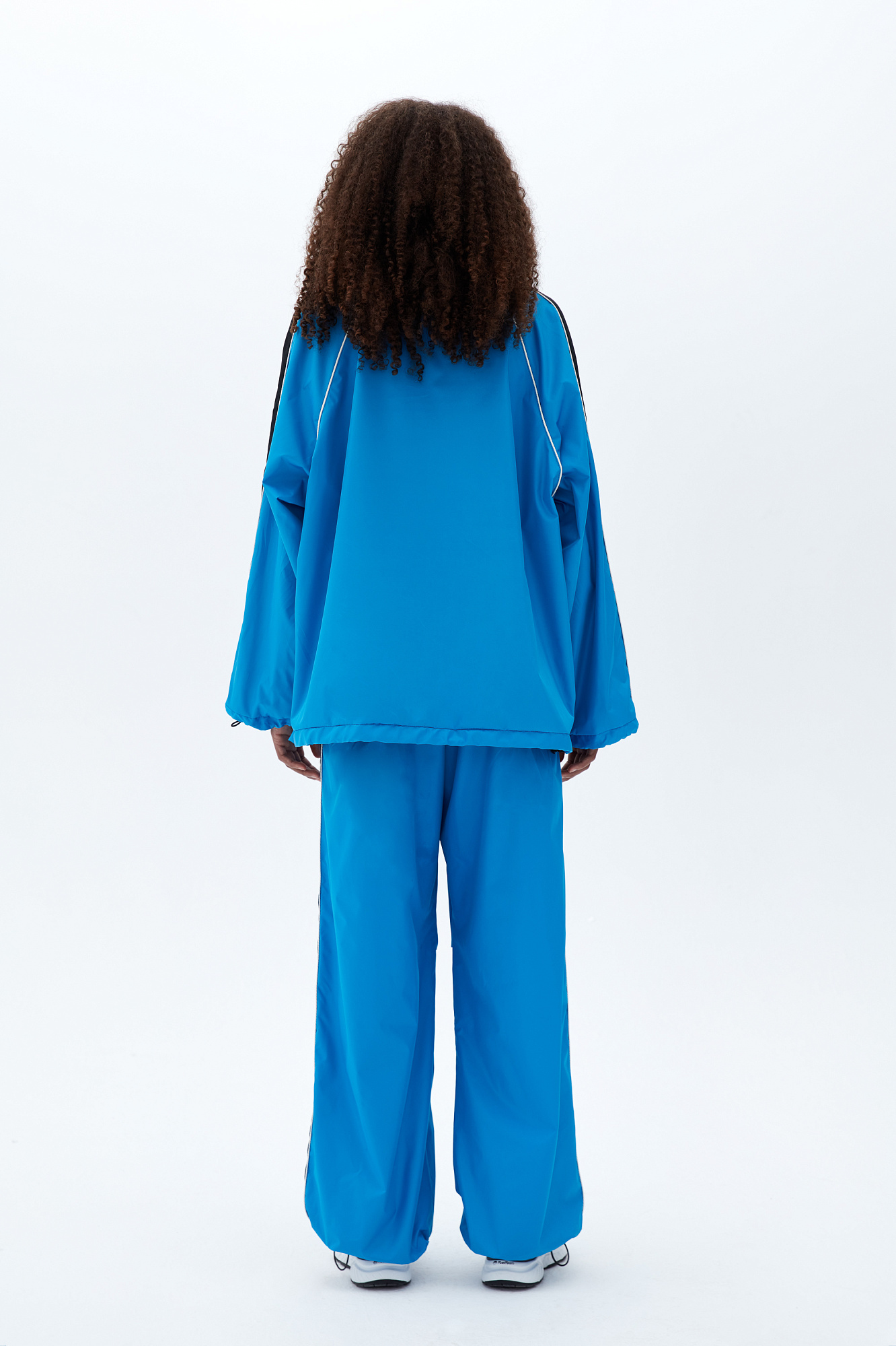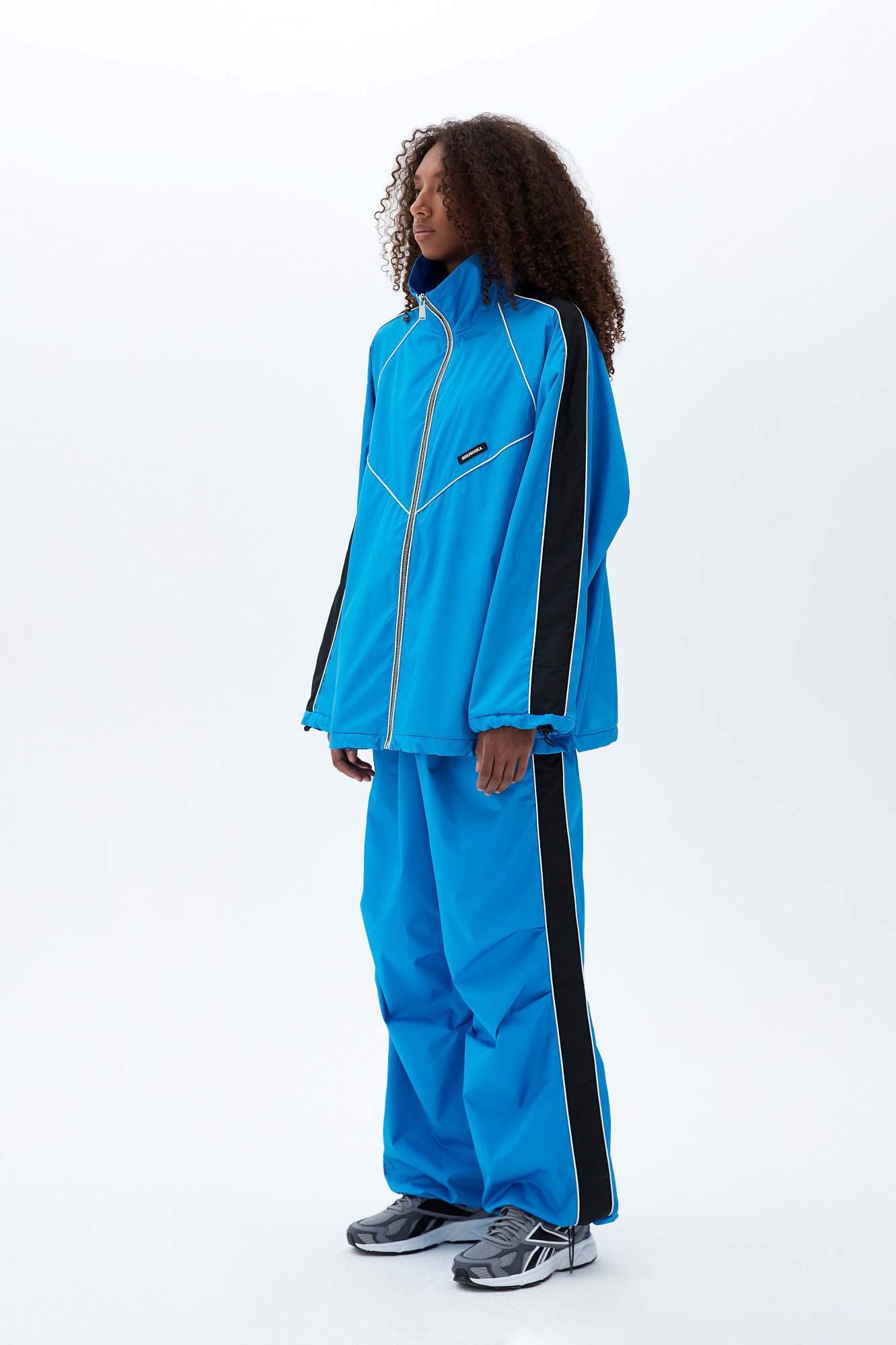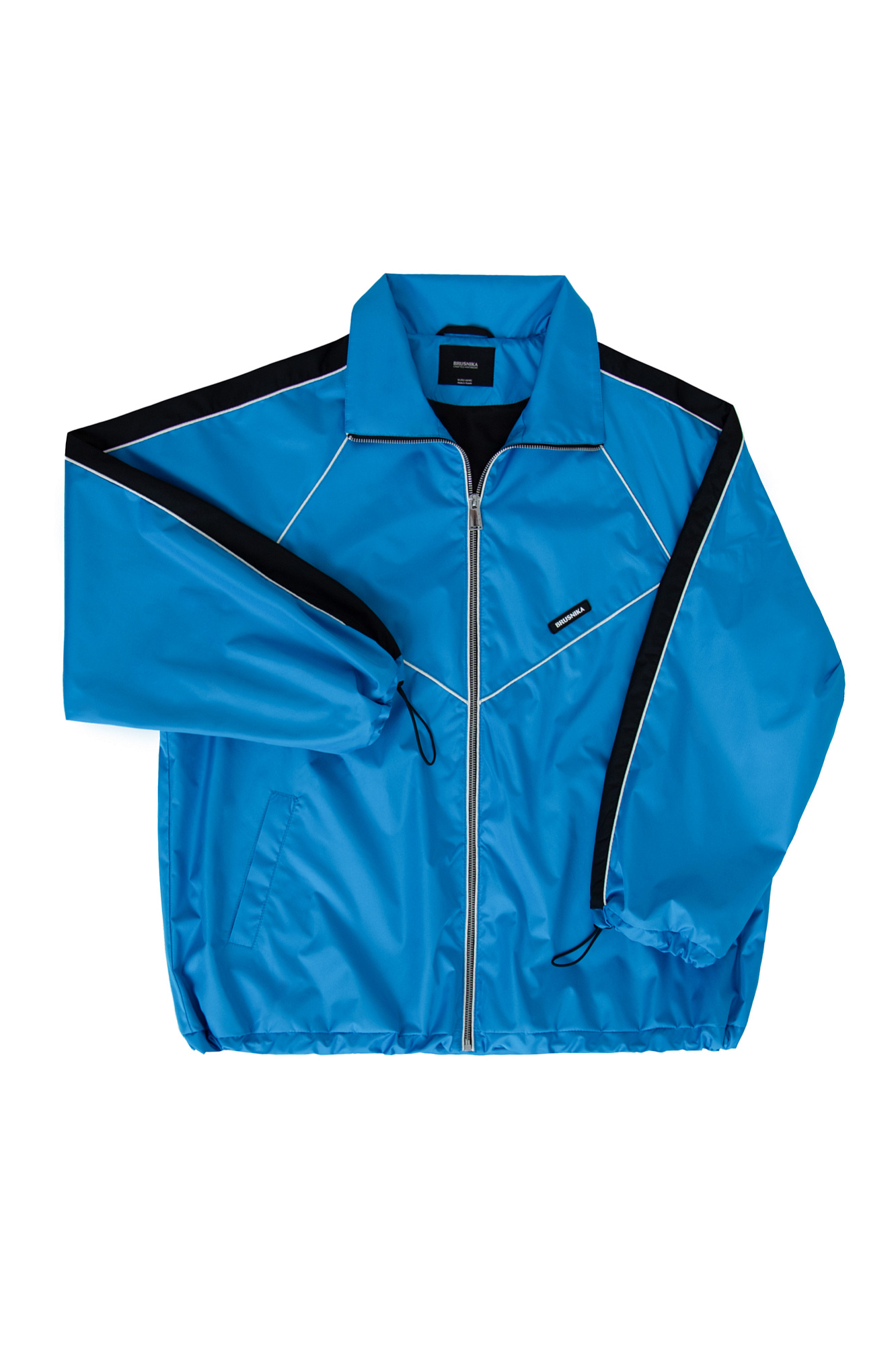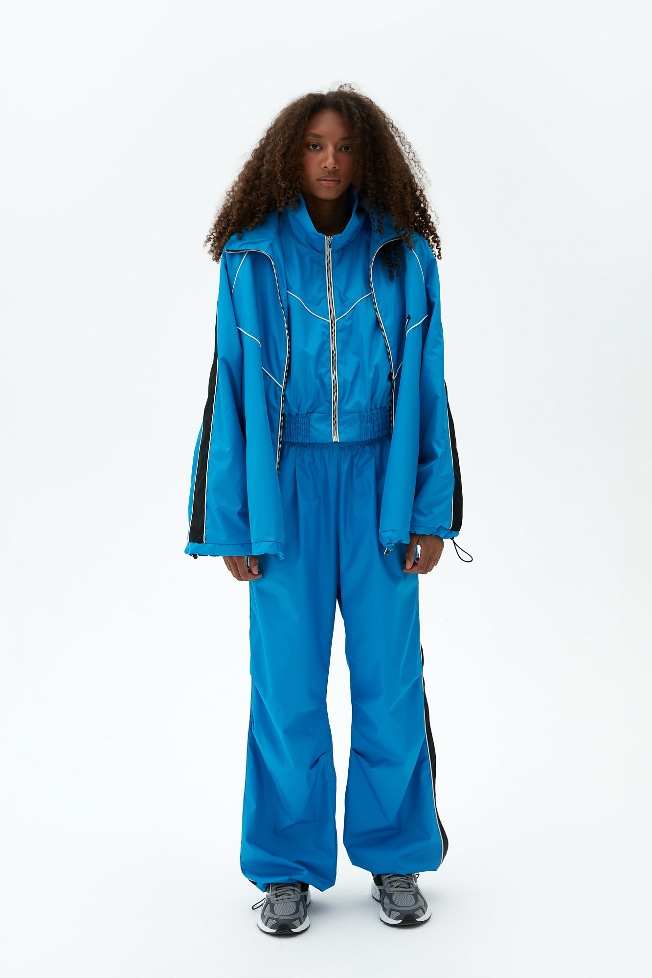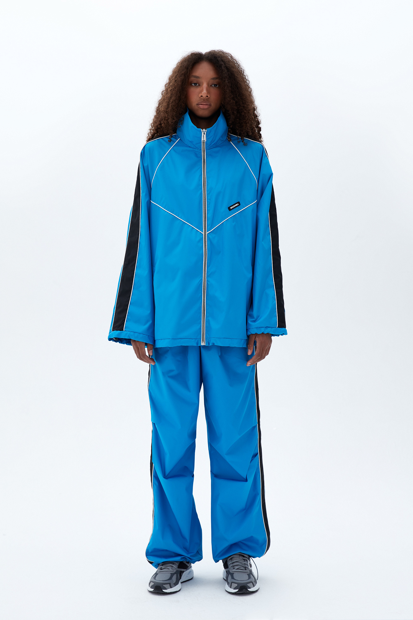 Куртка в спортивном стиле с карманами по бокам, белым кантом и широким лампасом. Брендированный ярлык на груди. Подкладка из сетчатой ткани по бокам, воротник-стойка. Дополнить образ можно брюками или шортами в том же стиле.