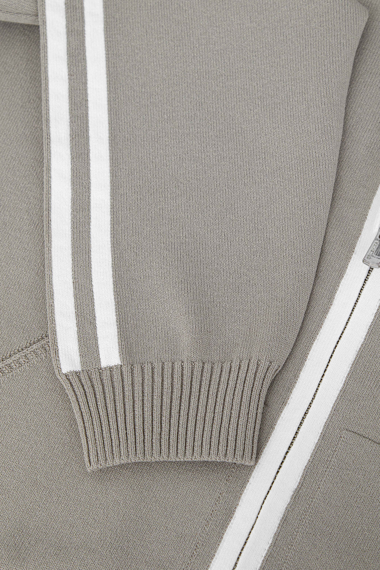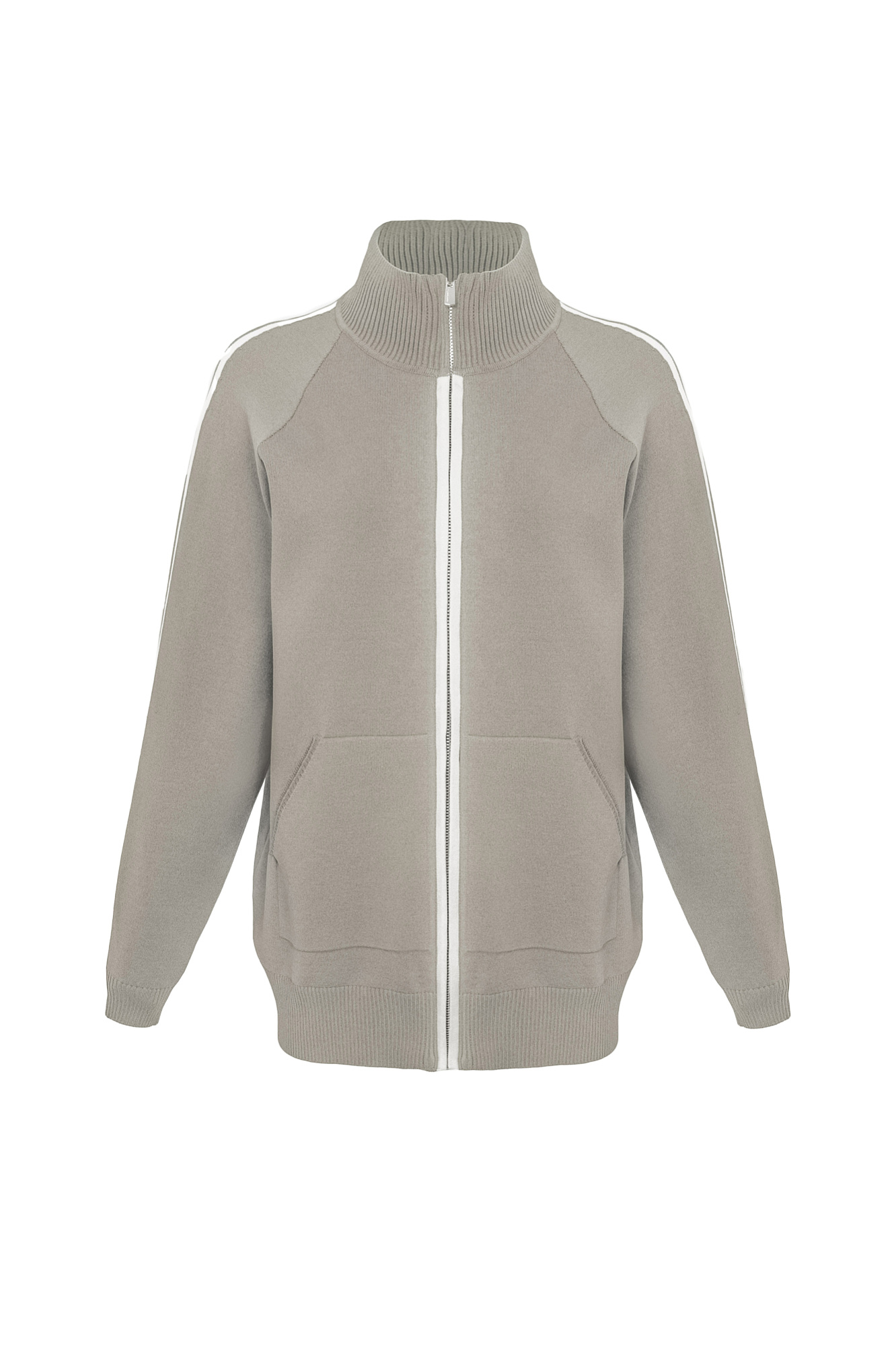 Трикотажный бомбер из вискозы с воротником-стойкой. Модель прямого силуэта с длинным рукавом и контрастными лампасами. Манжеты рукавов и низ изделия выполнен на резинке. Даа кармана. Застежка на молнии.