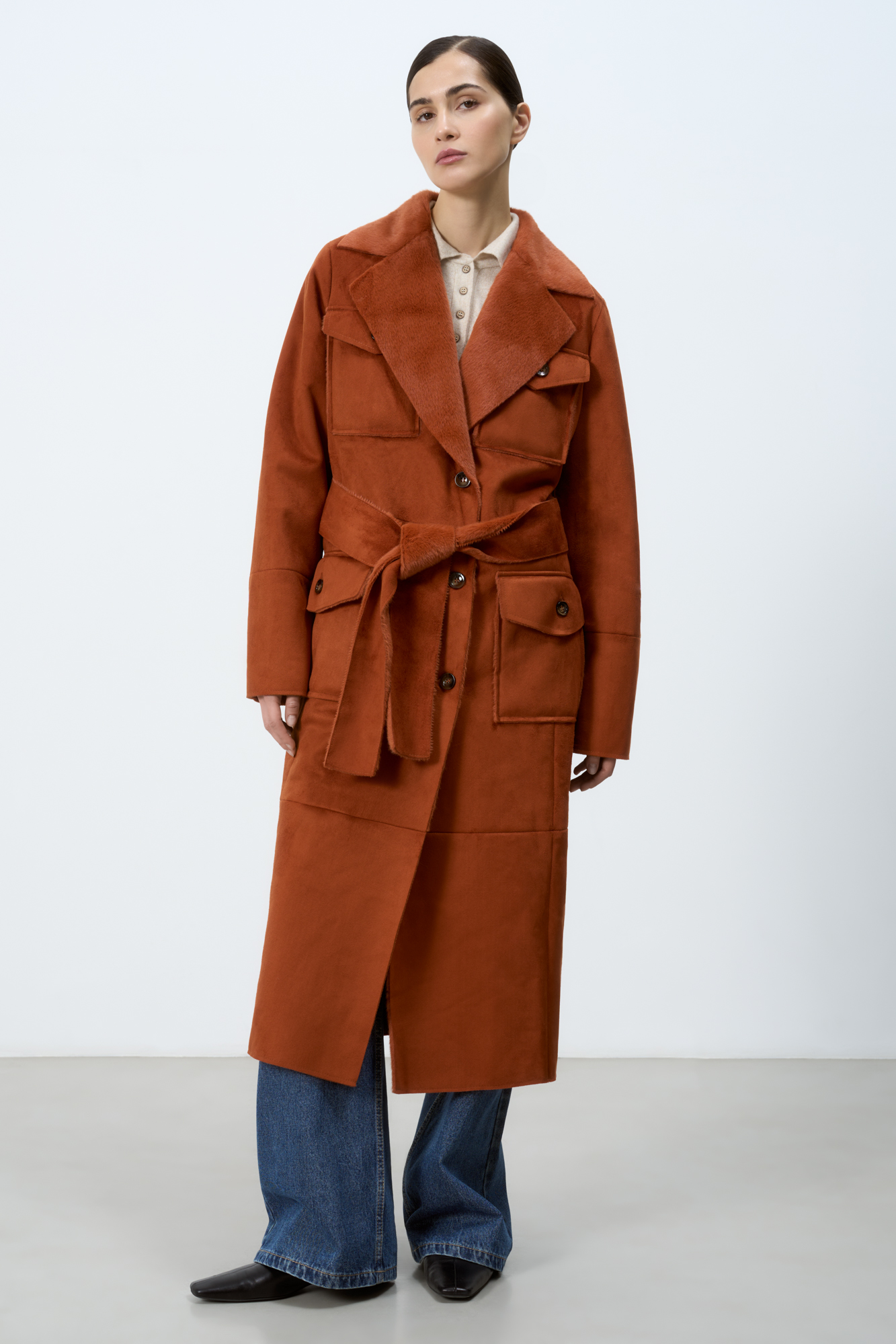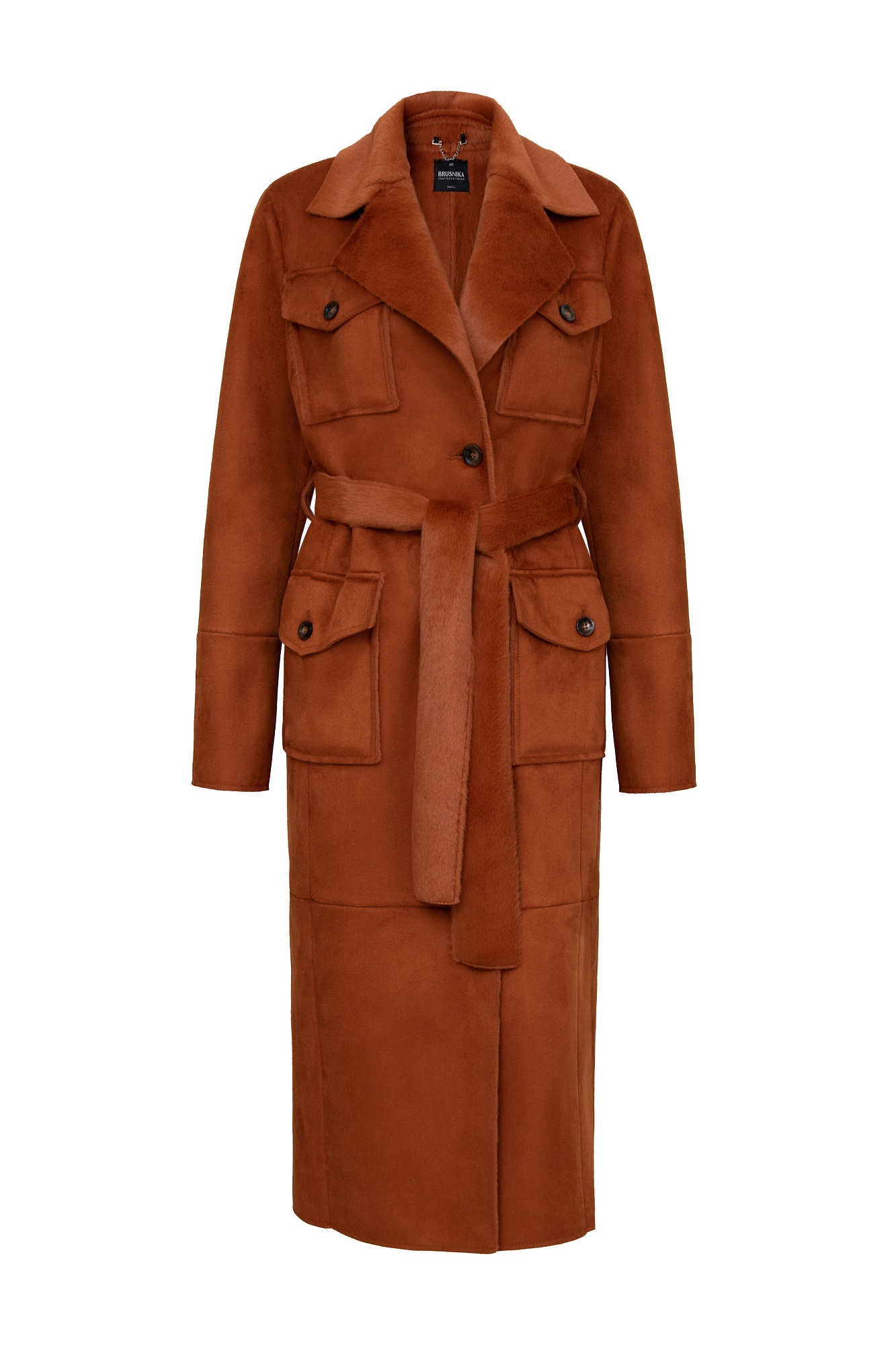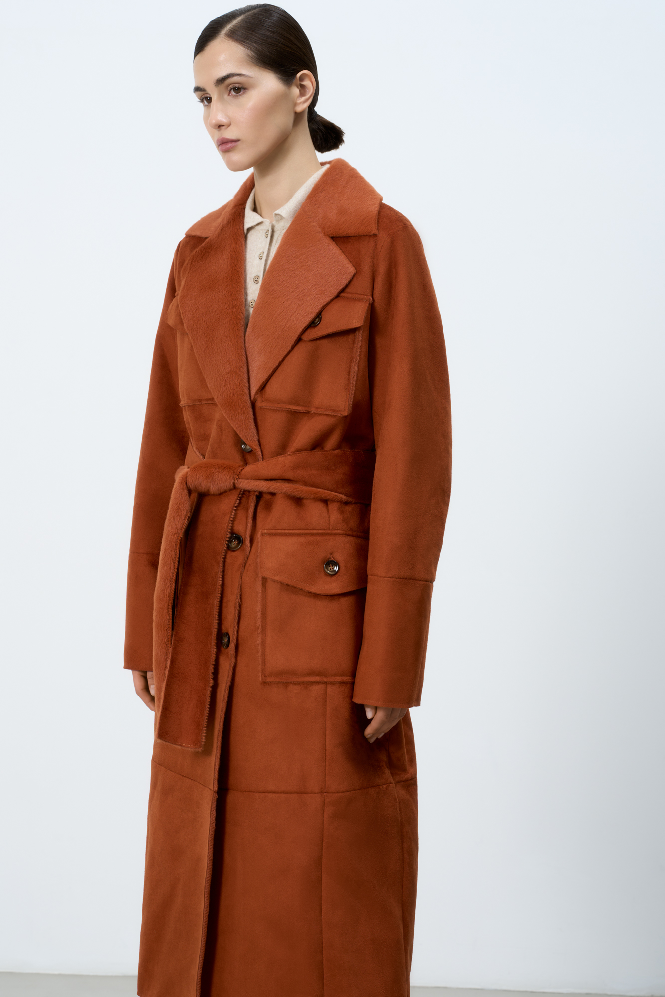 Длинная дубленка из экомеха. Модель прямого силуэта с английским воротником, накладными карманами и поясом. Изделие выполнено на подкладке из экомеха.