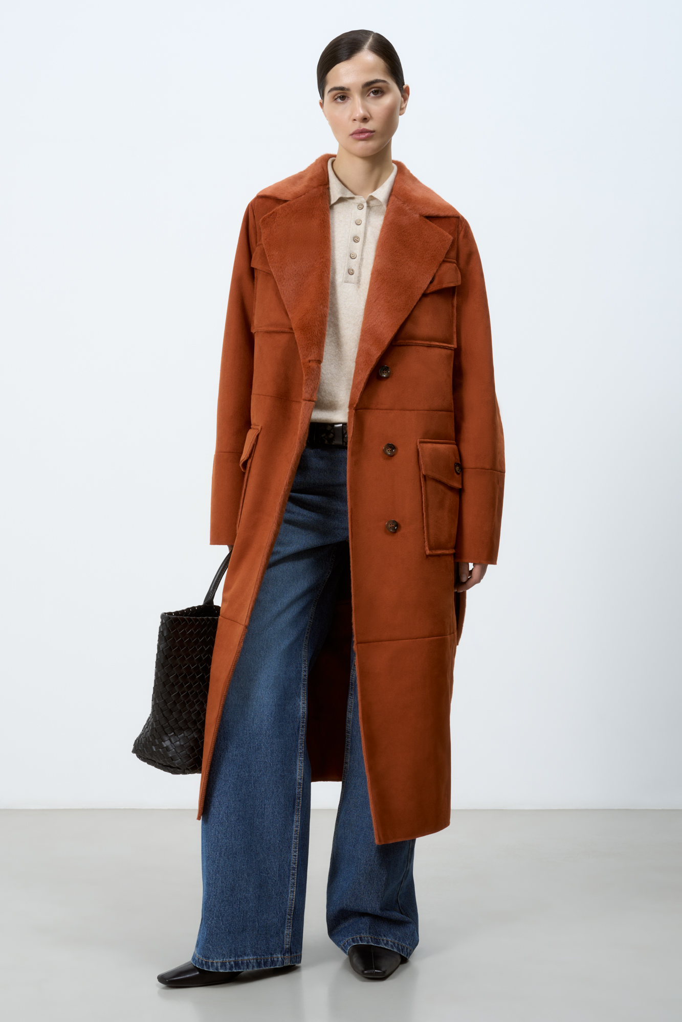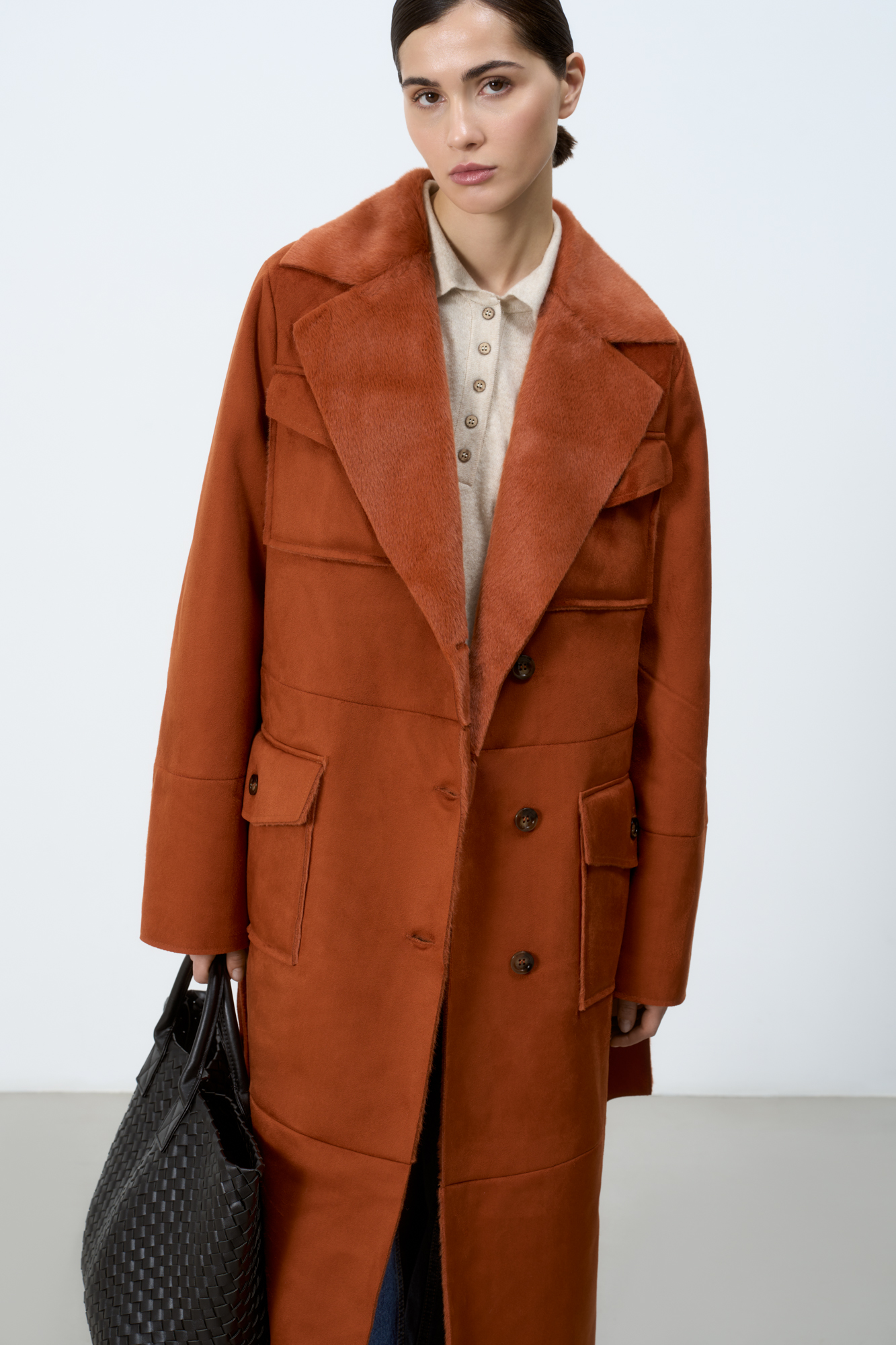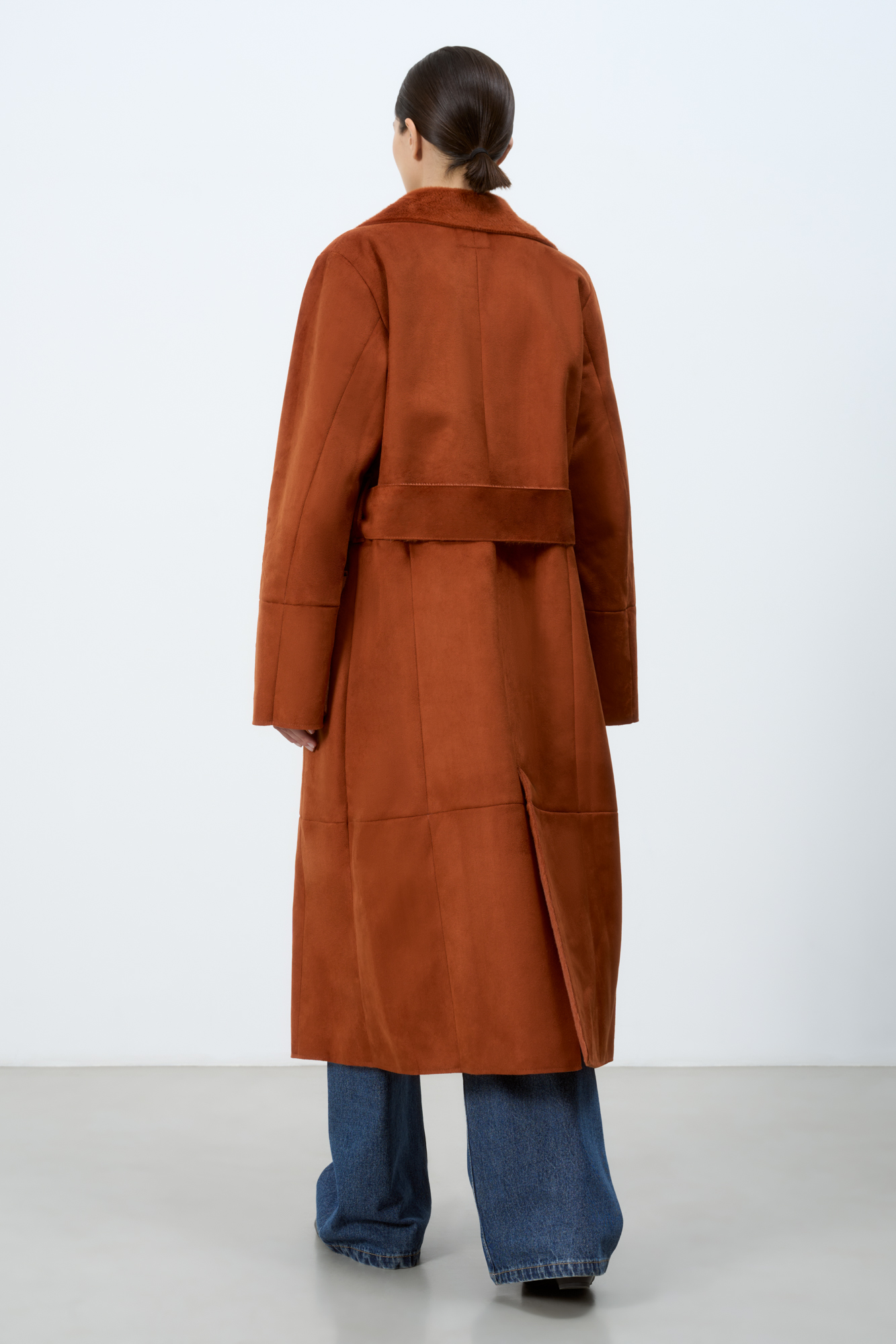 Длинная дубленка из экомеха. Модель прямого силуэта с английским воротником, накладными карманами и поясом. Изделие выполнено на подкладке из экомеха.