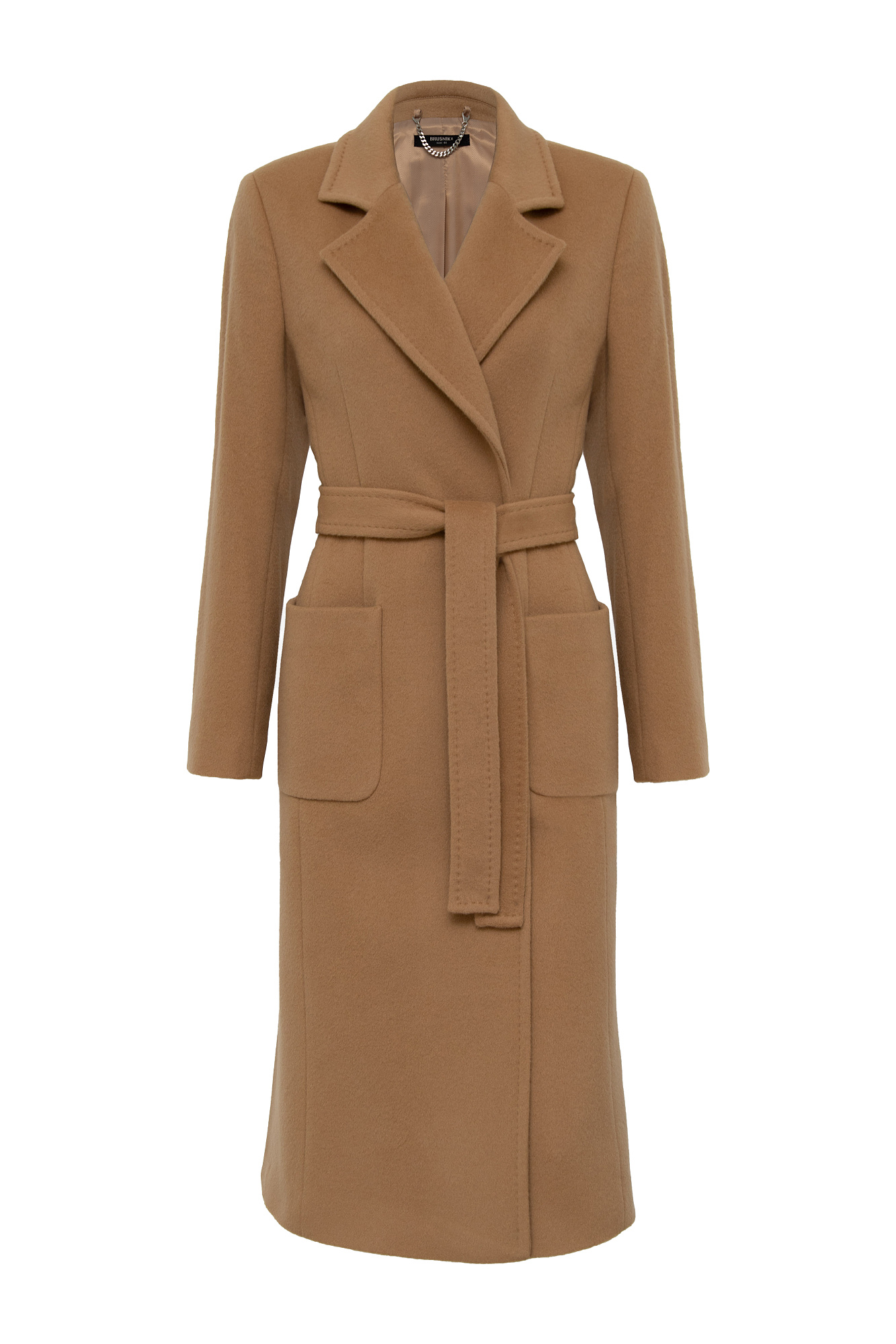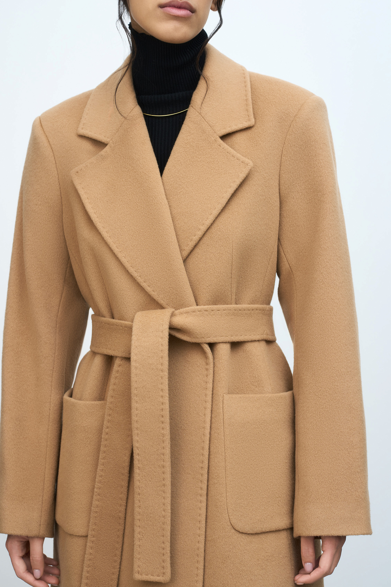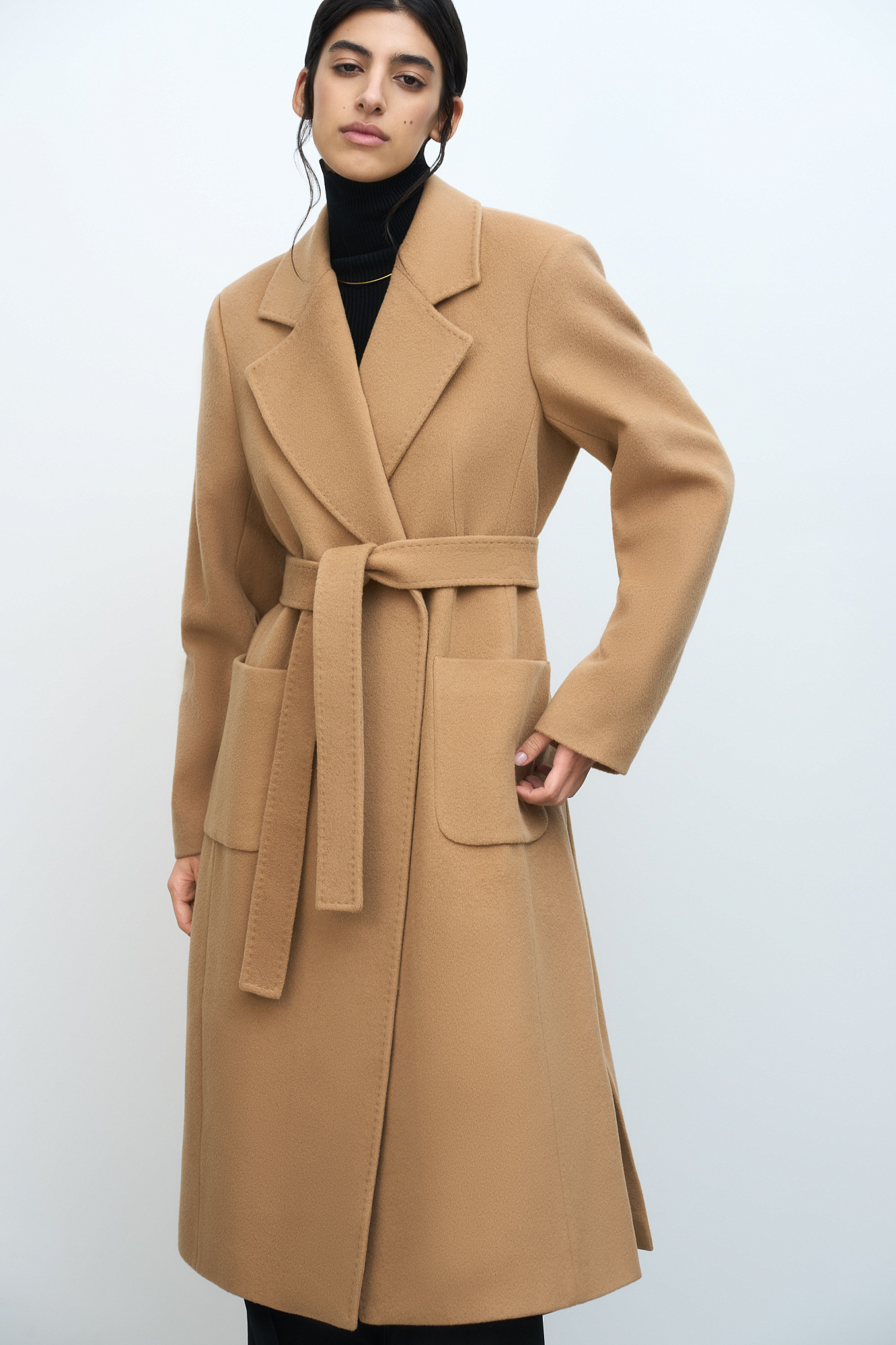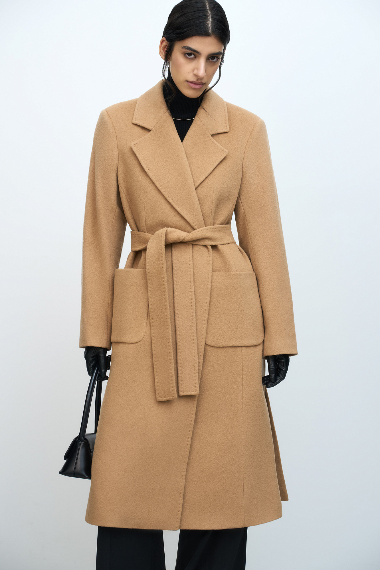 Классическое шерстяное пальто с поясом из основной ткани. Модель приталенного силуэта. Отложной воротник с прямоугольными лацканами и накладные карманы.