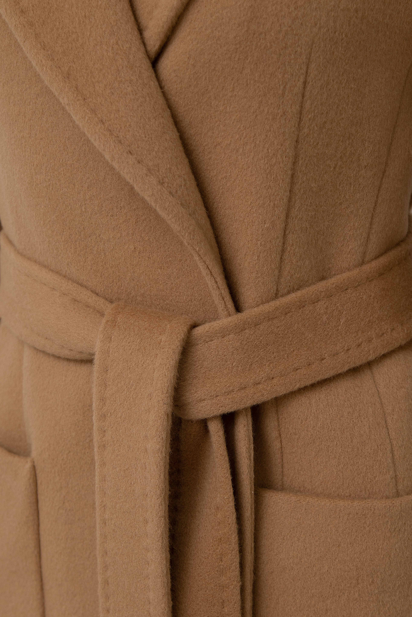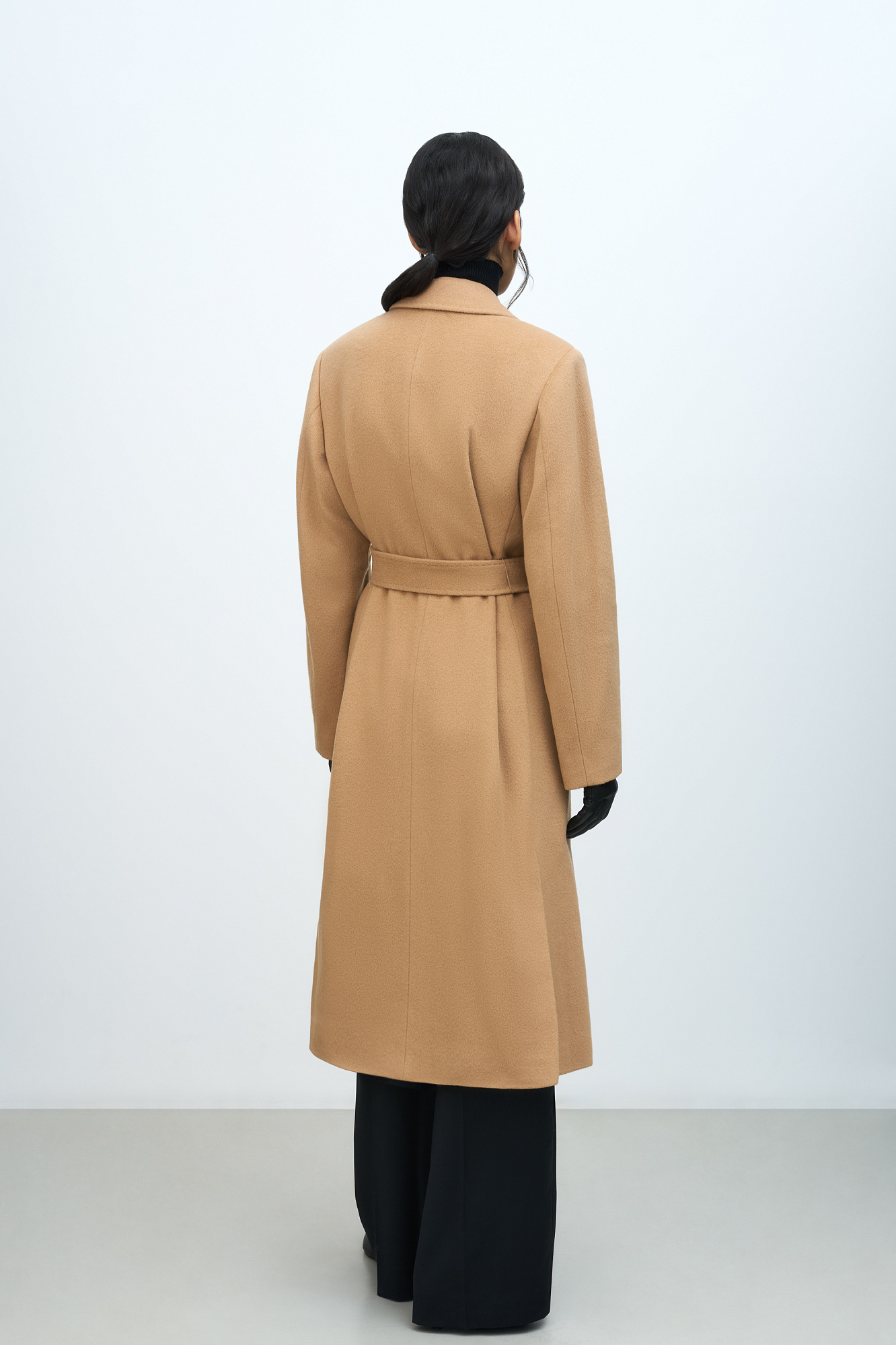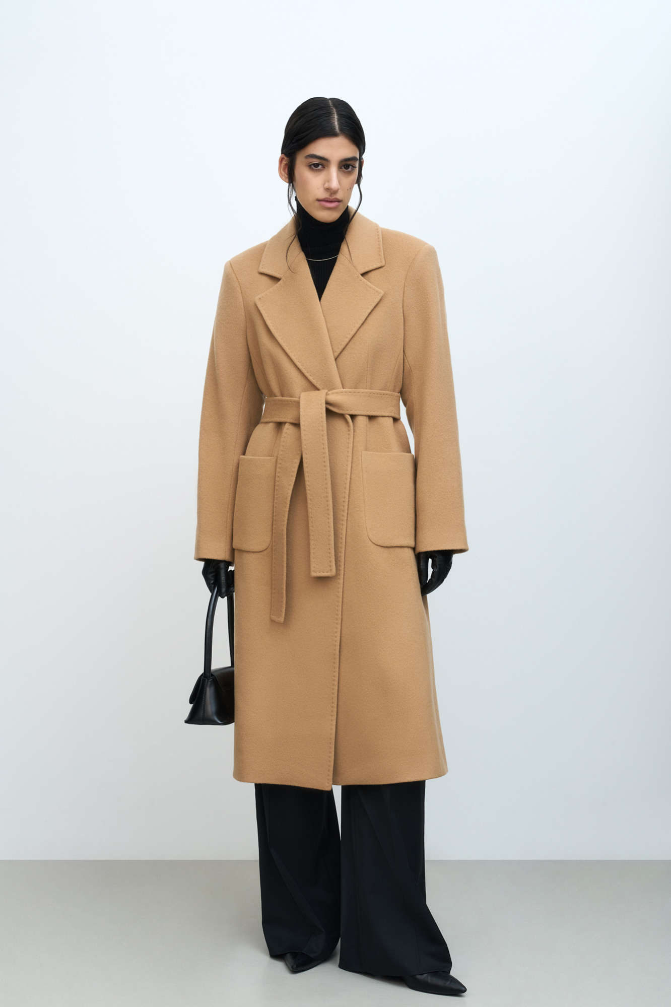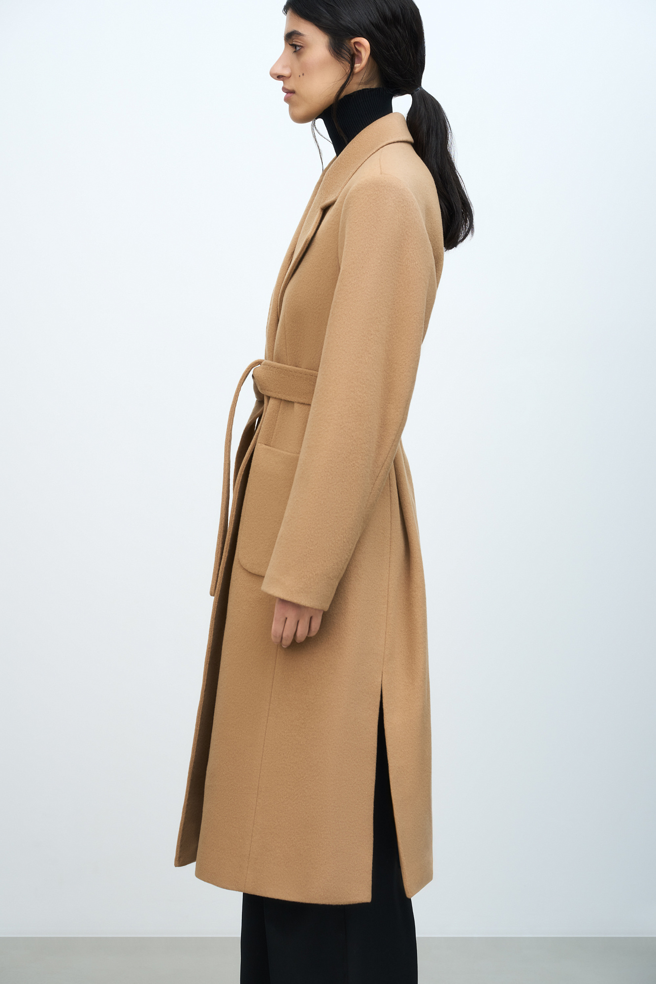 Классическое шерстяное пальто с поясом из основной ткани. Модель приталенного силуэта. Отложной воротник с прямоугольными лацканами и накладные карманы.