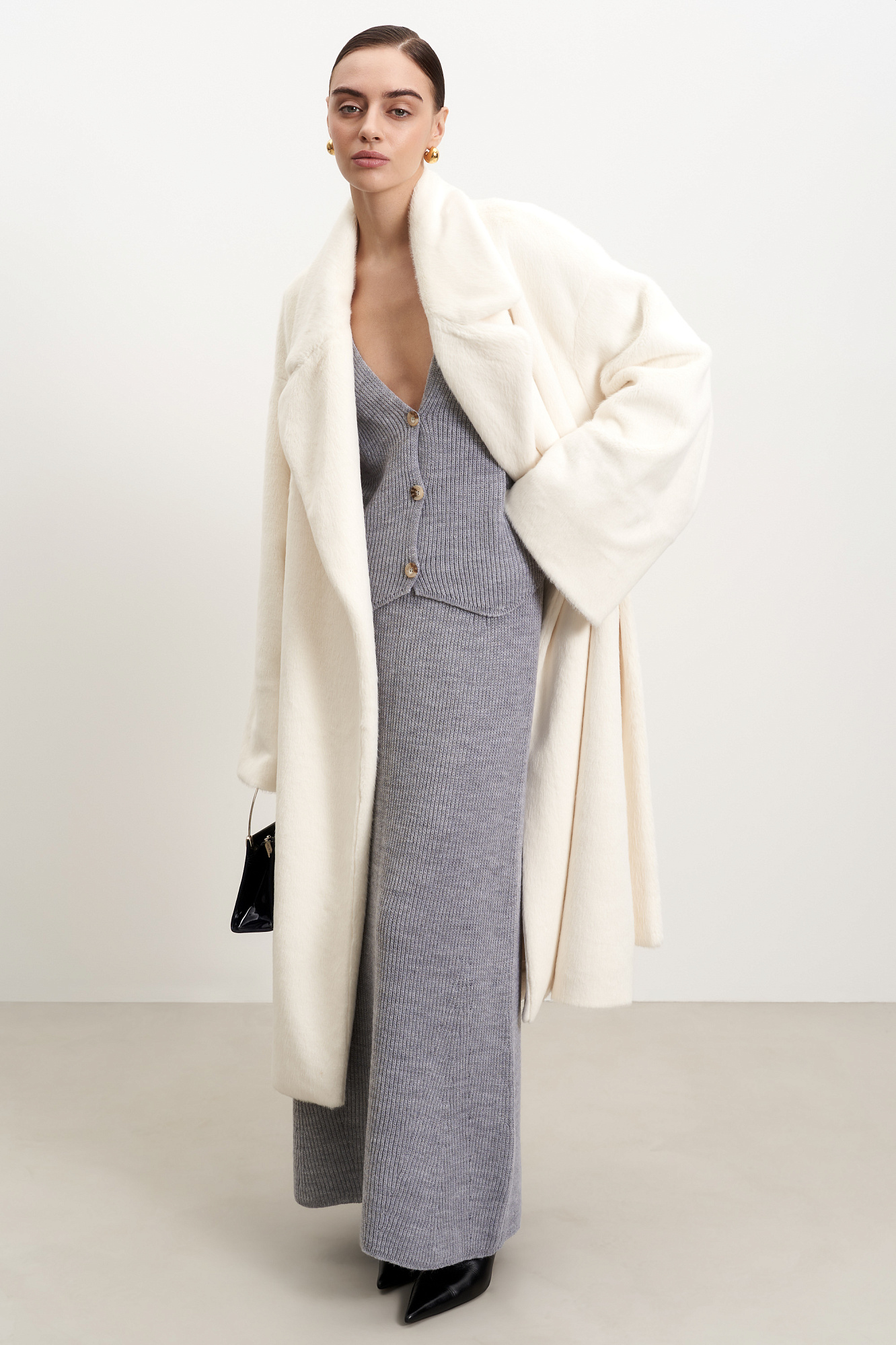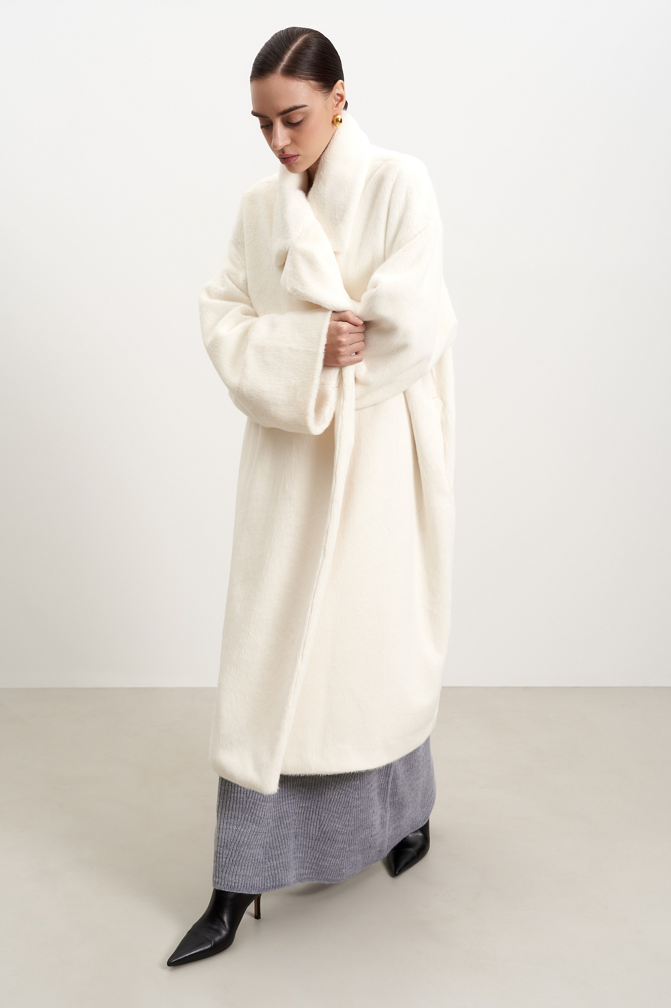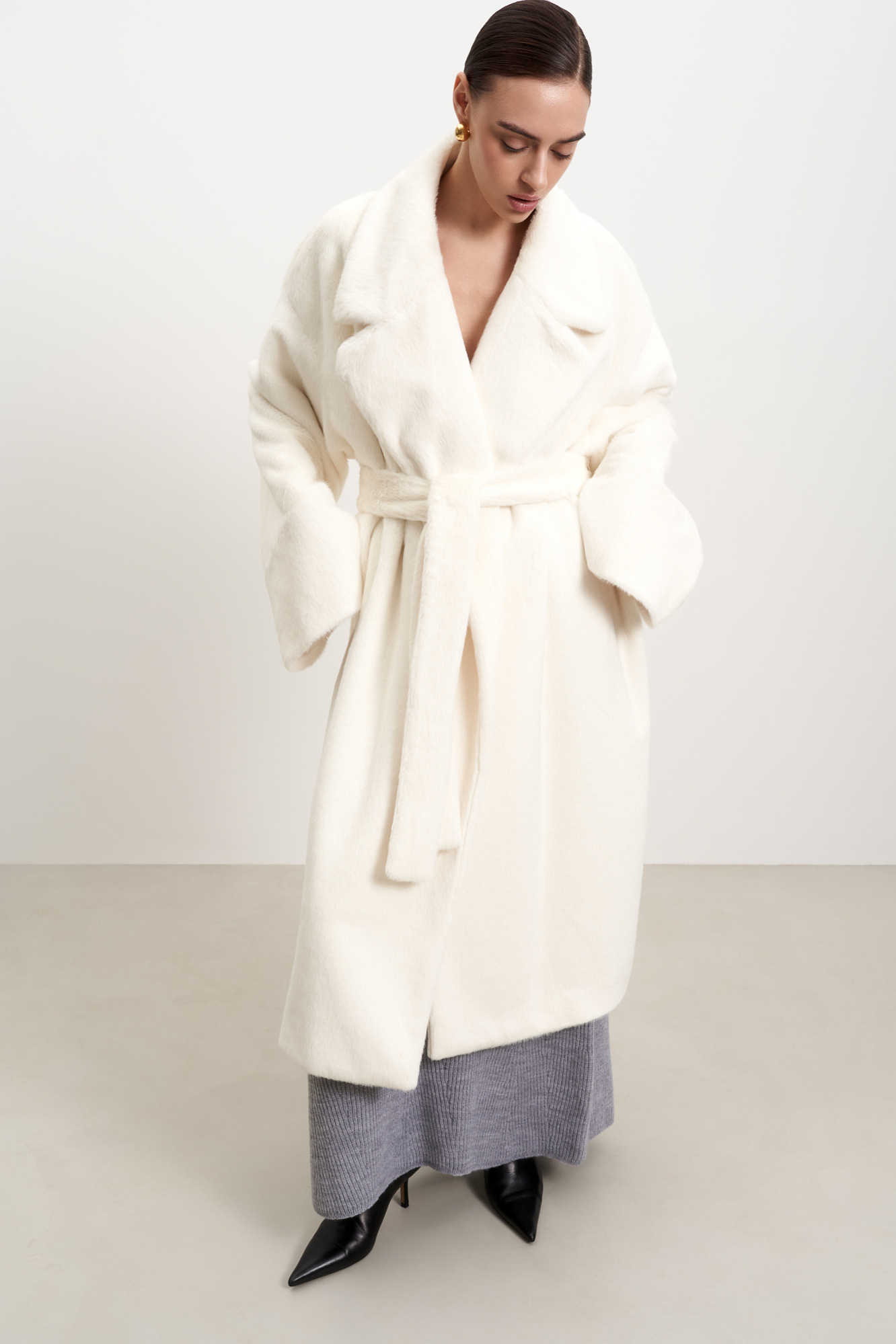 Шуба из экомеха на запах. Удобный вариант для повседневного городского стиля. Классический крой, английский воротник и длинный пояс. Легко впишется в базовый гардероб.